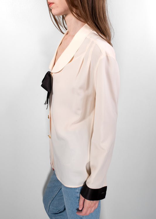 Chanel Cream Silk Blouse with Black Bow and Gold Buttons