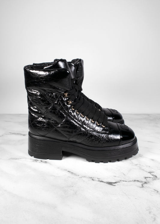 Chanel Crumpled Patent Lambskin Calfskin Quilted Lace Up Combat Boots