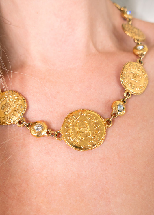 Chanel Vintage Goldtone CC Coin Choker Necklace w/ Crystals