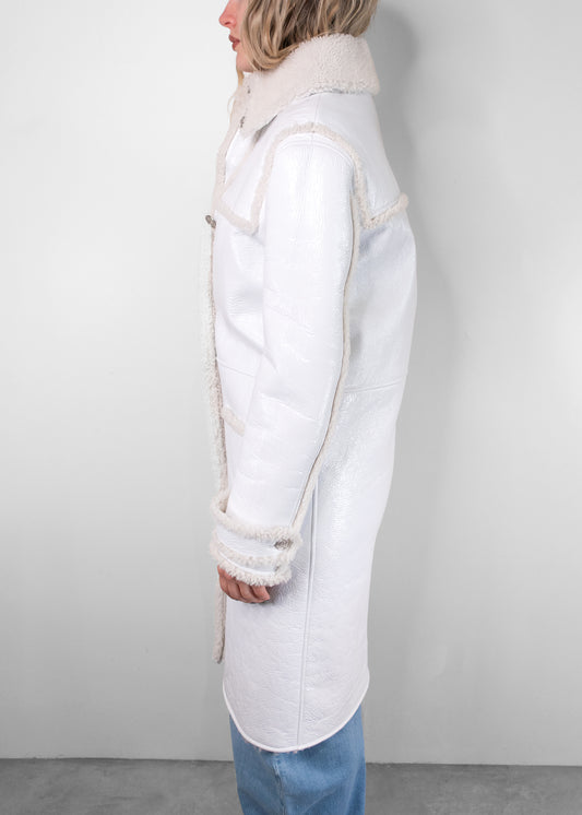 Chanel White Shearling And Patten Leather Single-Breasted Coat