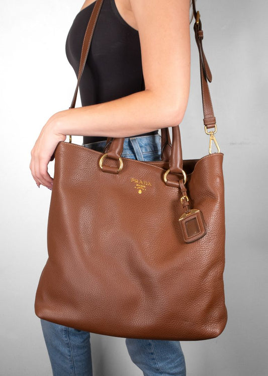 Prada Brown Pebbled Tote Bag With Long Shoulder Strap And Gold Hardware