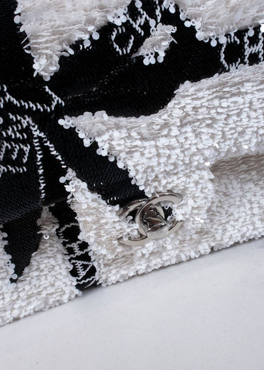 Chanel White And Black Sequin Bow Mini Flap Bag With Silver Hardware