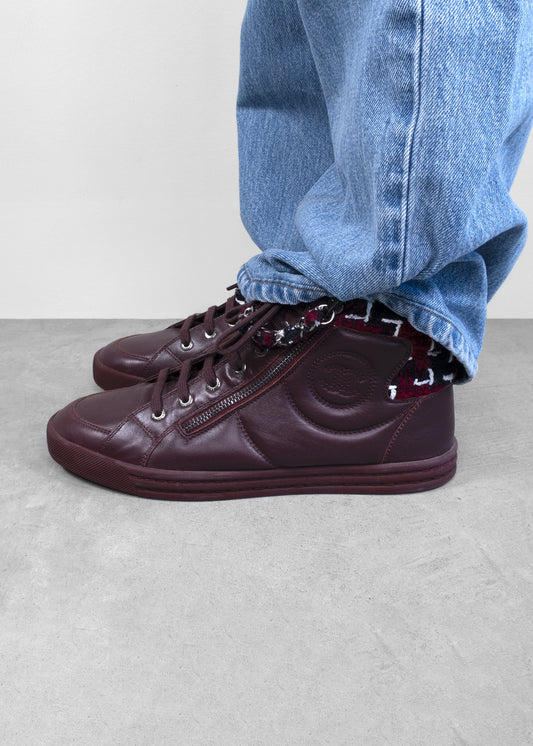 Chanel Burgundy Leather and Tweed CC High Top Sneakers