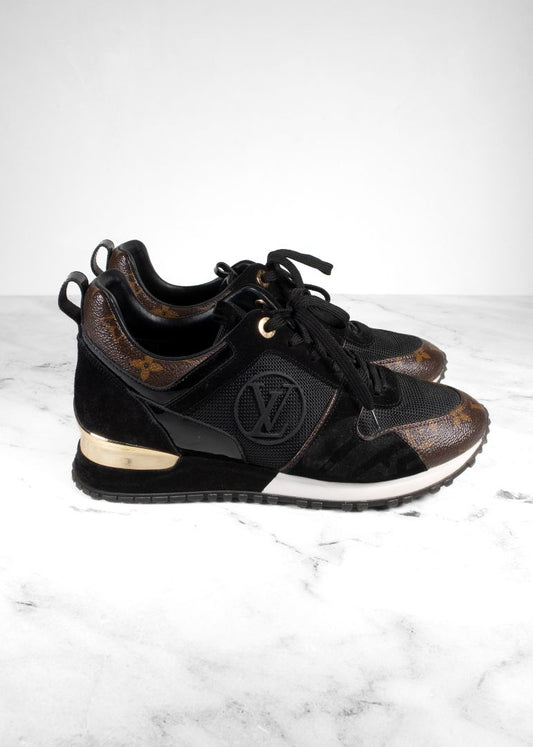 • Louis Vuitton Run Away Black Suede Sneakers With Brown Leather Monogram
