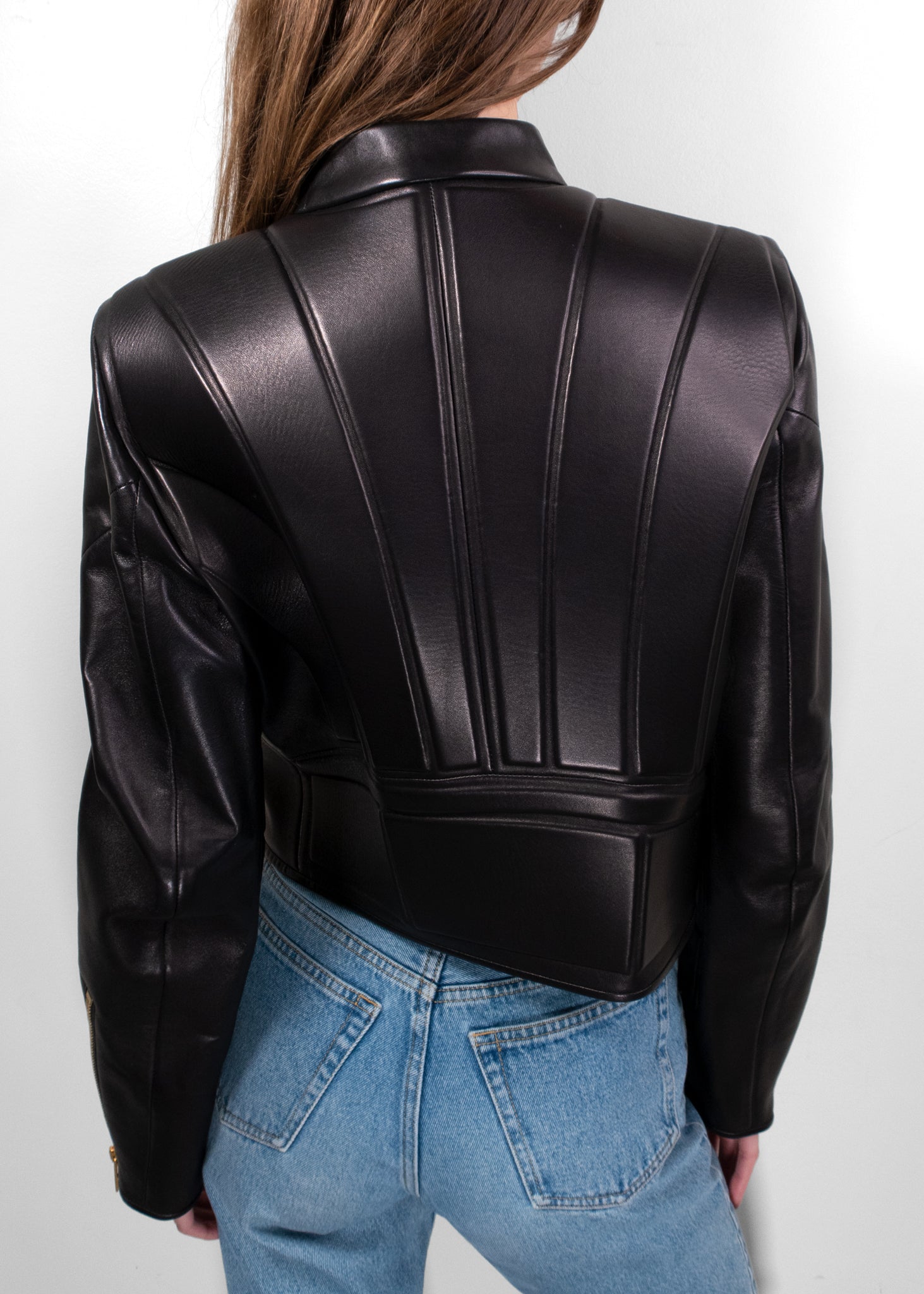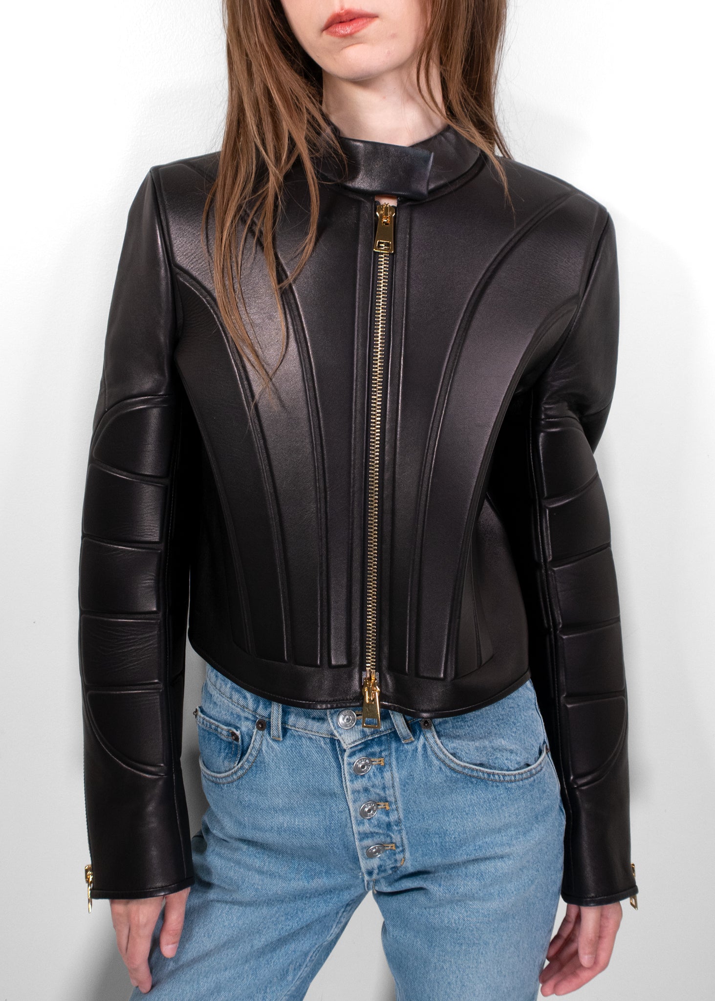 The Bottega Veneta Cropped Leather Jacket is a luxurious and contemporary piece that embodies the brand's commitment to craftsmanship and sophistication. Made from high-quality leather, this jacket features a cropped silhouette that offers a modern twist to a classic design. It boasts meticulous attention to detail with its impeccable stitching and tailored fit. With its minimalist aesthetic and timeless appeal, the Bottega Veneta Cropped Leather Jacket is a versatile wardrobe staple that can effortlessly elevate any outfit, from casual to chic.