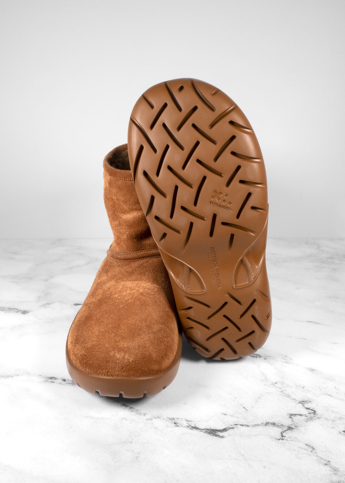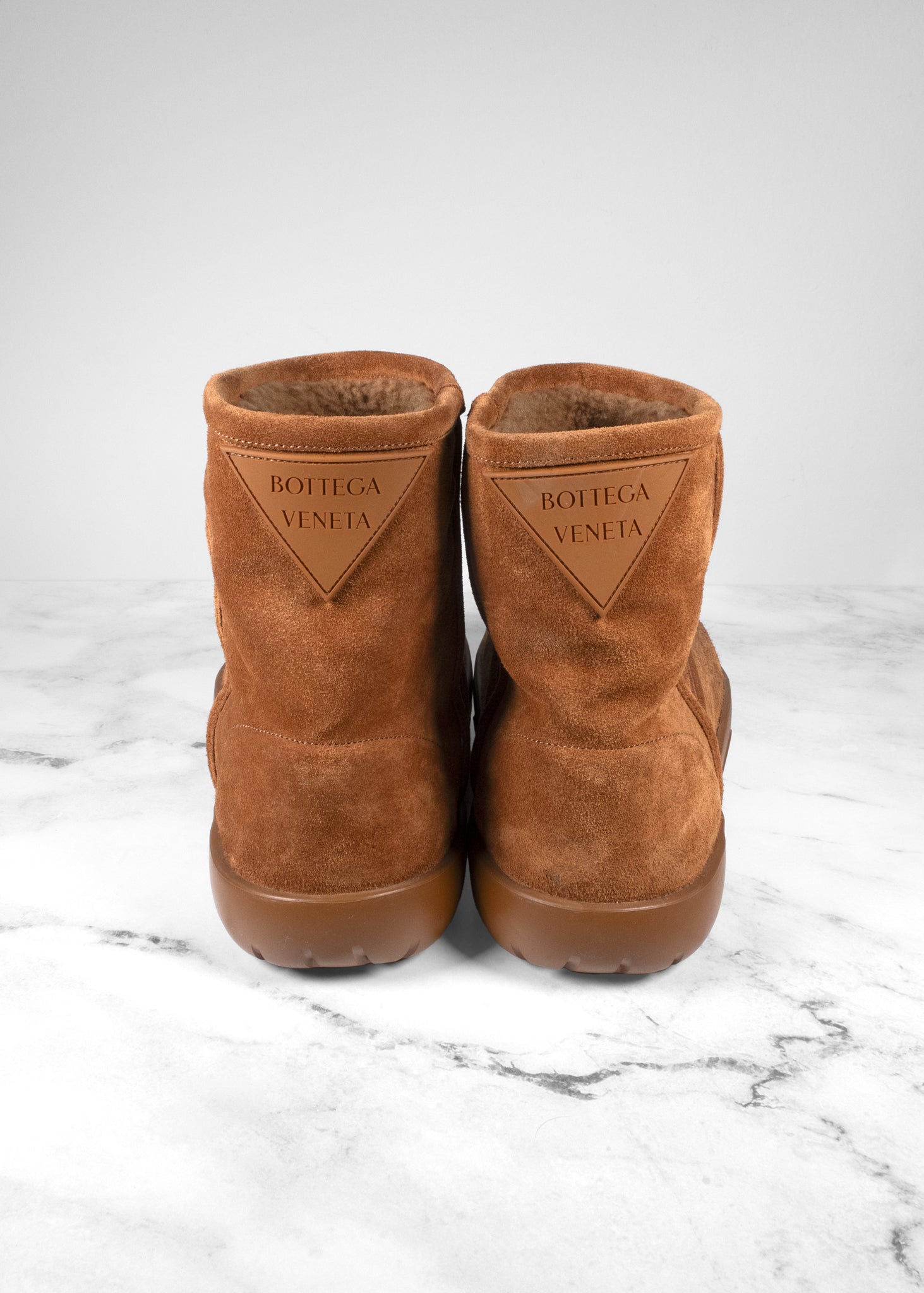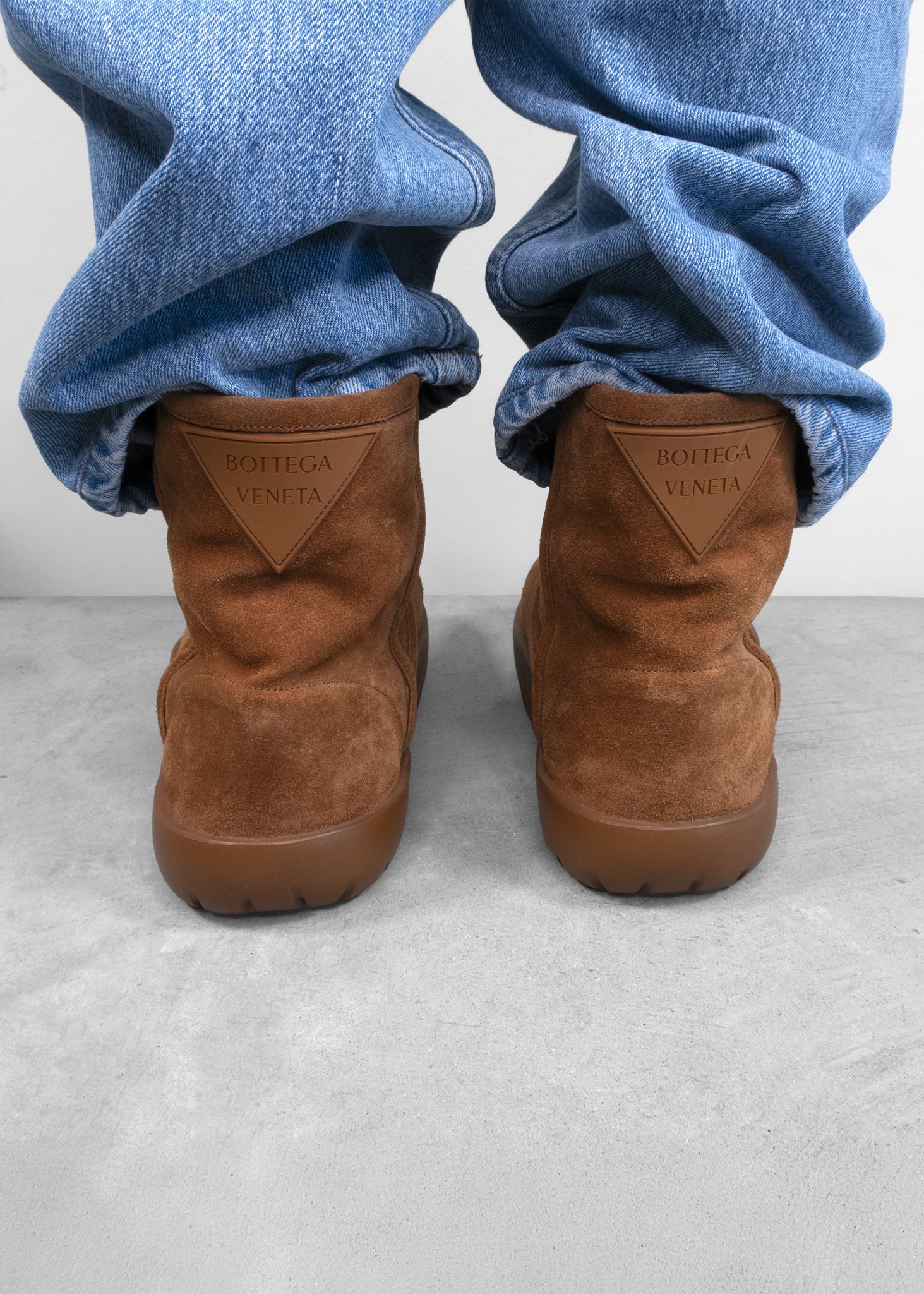 The Bottega Veneta Snap Ankle Boots in suede feature a sleek, contemporary design crafted from luxurious suede leather. These boots are defined by their minimalist silhouette, snap closures for a secure fit, and a durable rubber sole for comfort and traction. Perfect for elevating both casual and polished looks, they combine sophistication with everyday practicality.