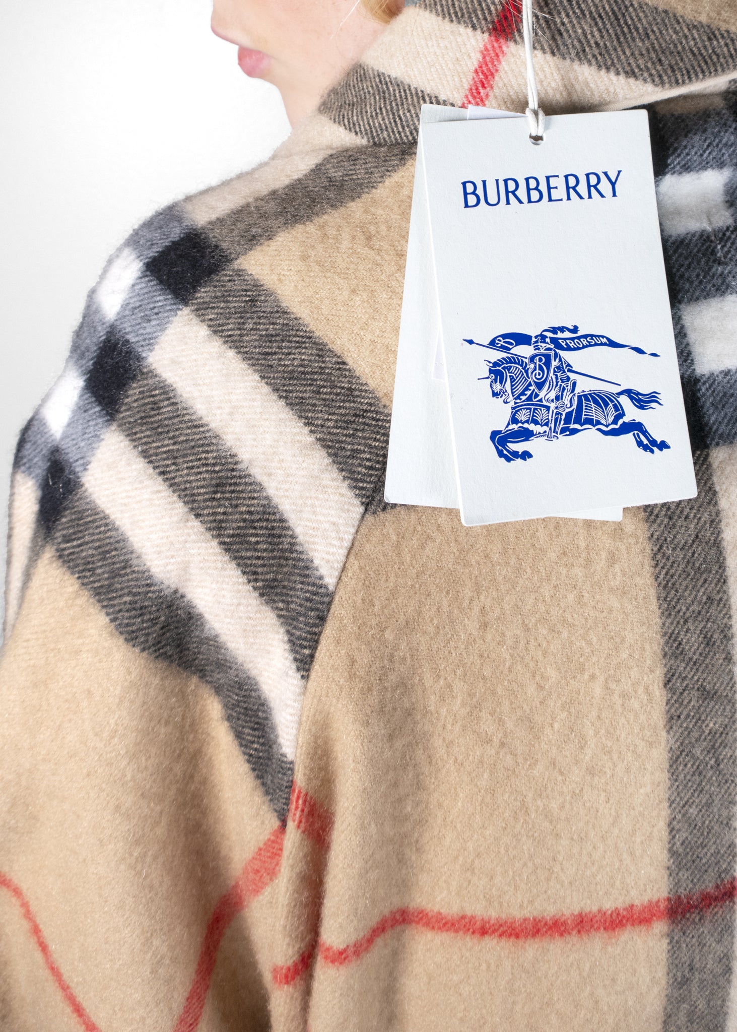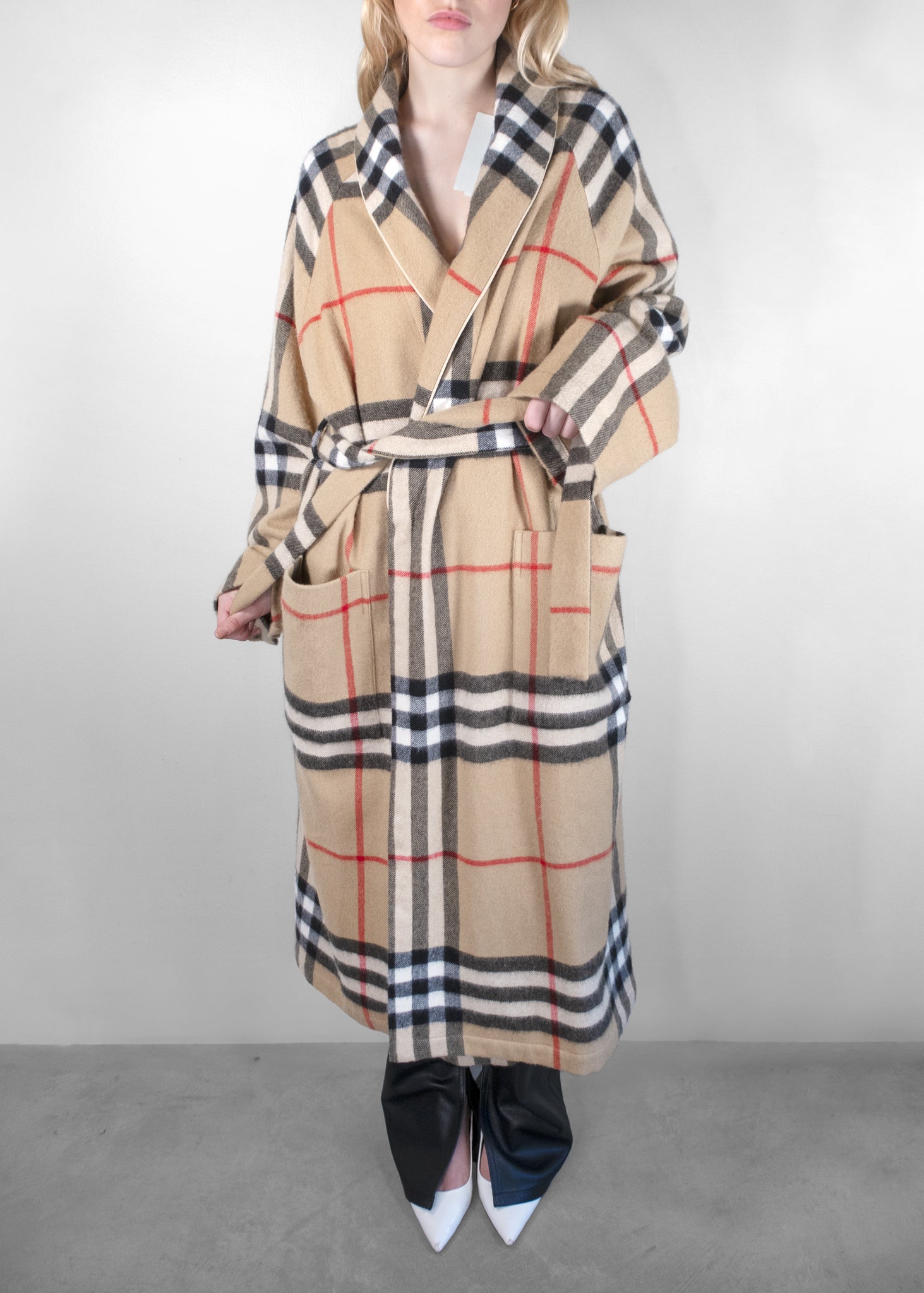 The Burberry Check-Pattern Belted Cashmere coat exudes sophistication and warmth. Crafted from luxurious cashmere, this robe features the iconic Burberry check pattern in a rich beige, red, and black design. The robe's cozy yet elegant silhouette is enhanced by its oversized fit, complete with a stylish belt to cinch the waist. The addition of spacious pockets makes it both functional and chic, ideal for lounging or adding a touch of luxury to your daily routine. This piece blends timeless design with unmatched comfort, making it a standout addition to any wardrobe.
