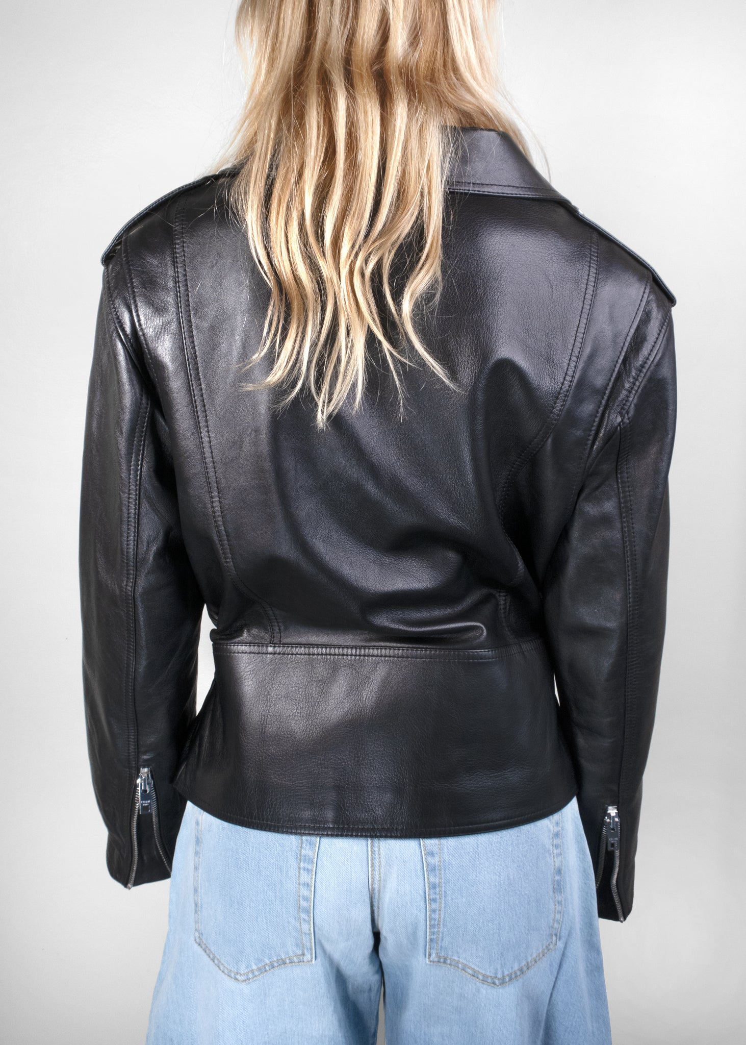 A timeless and sleek addition to any wardrobe, this Celine biker jacket is crafted from high-quality calfskin leather, featuring a classic design with a zippered front, belted waist, and structured fit. The jacket combines edgy style with sophistication, making it a perfect layering piece for both casual and dressed-up looks.
