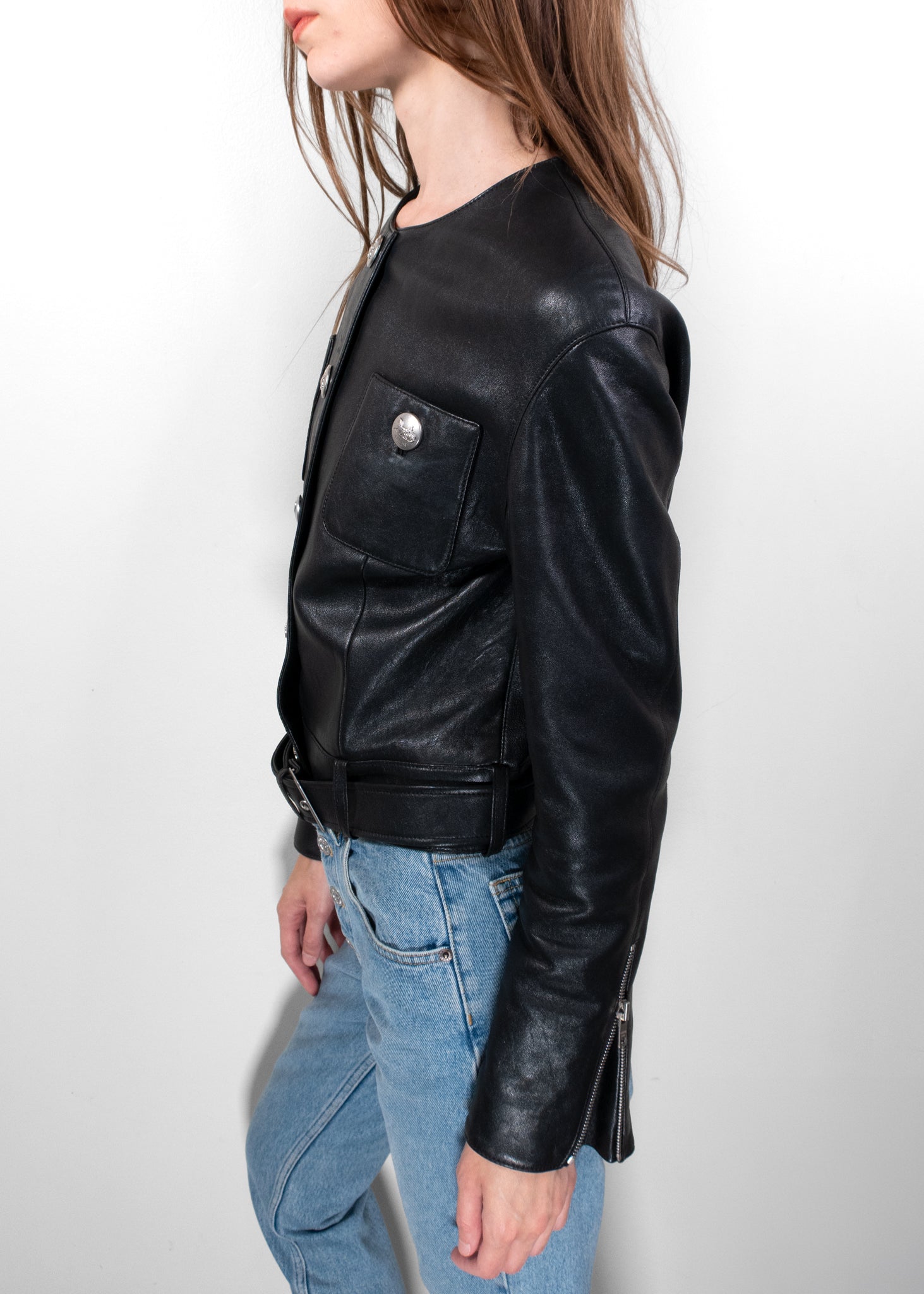 Crafted from supple lambskin, the Celine Eddie biker jacket reimagines moto edge with Parisian polish. This sleek, collarless silhouette features bold silver crest buttons, dual front flap pockets, and a belted waist for a structured finish. With its minimalist neckline and luxe texture, it’s a modern staple that balances toughness and refinement effortlessly.