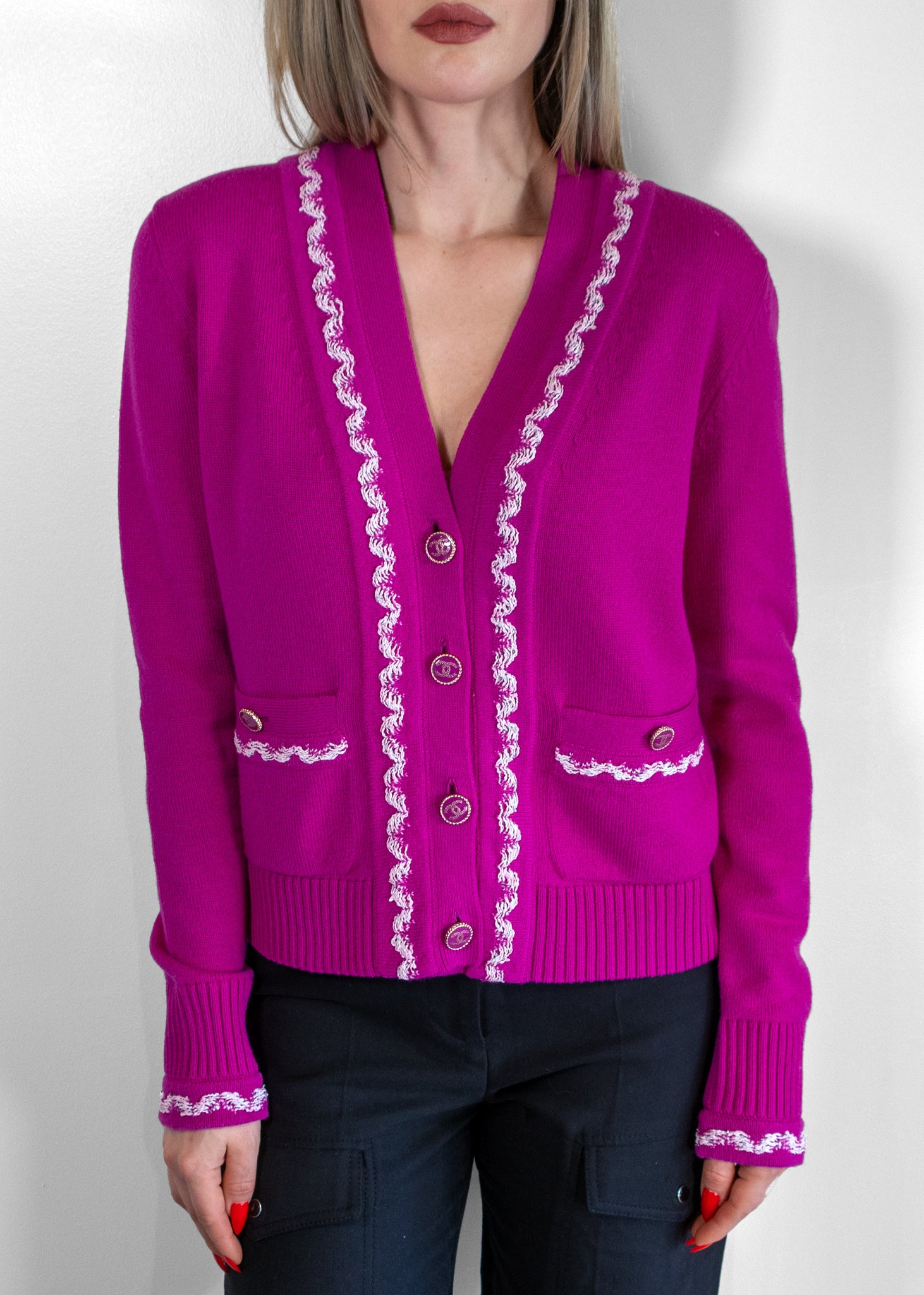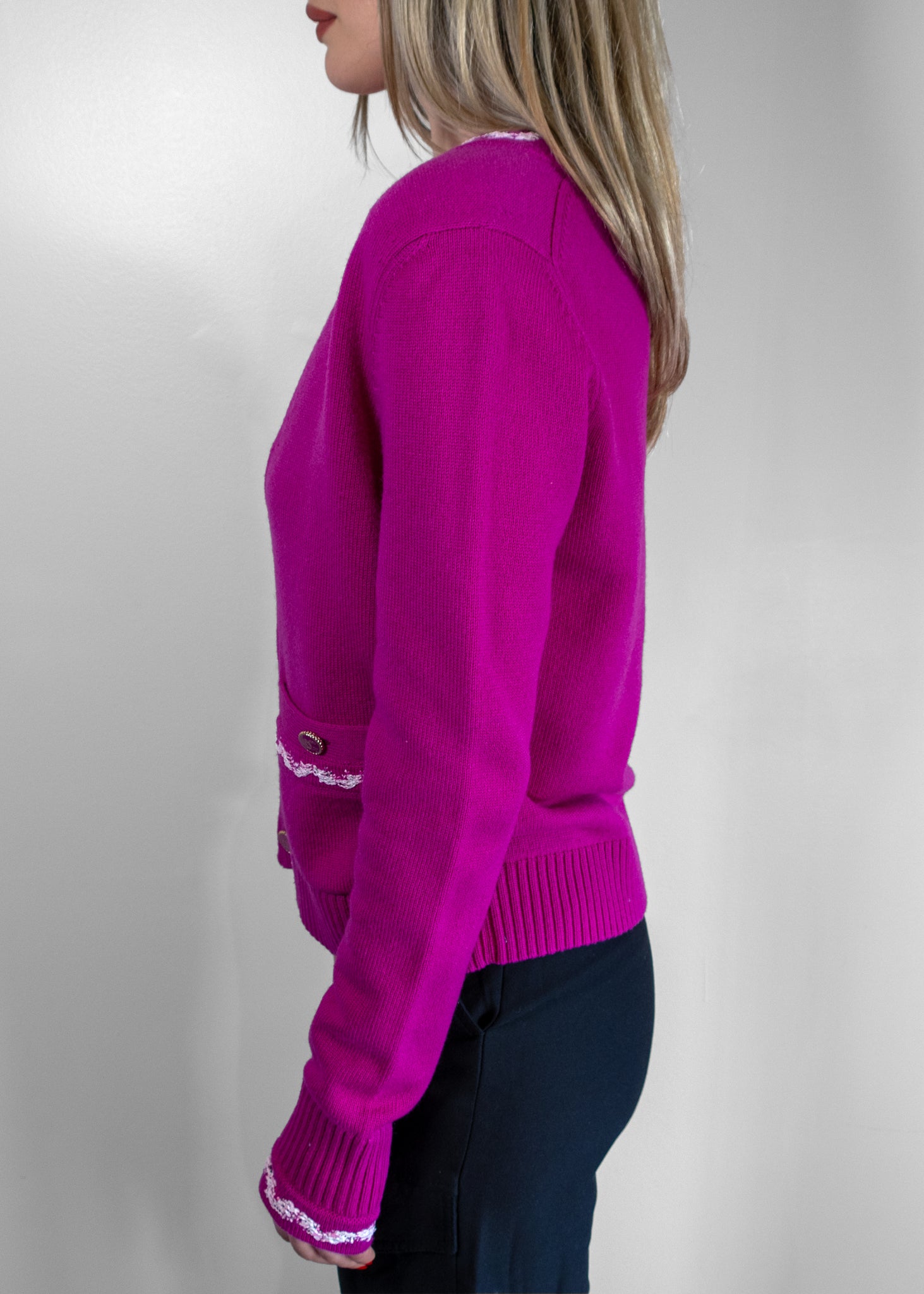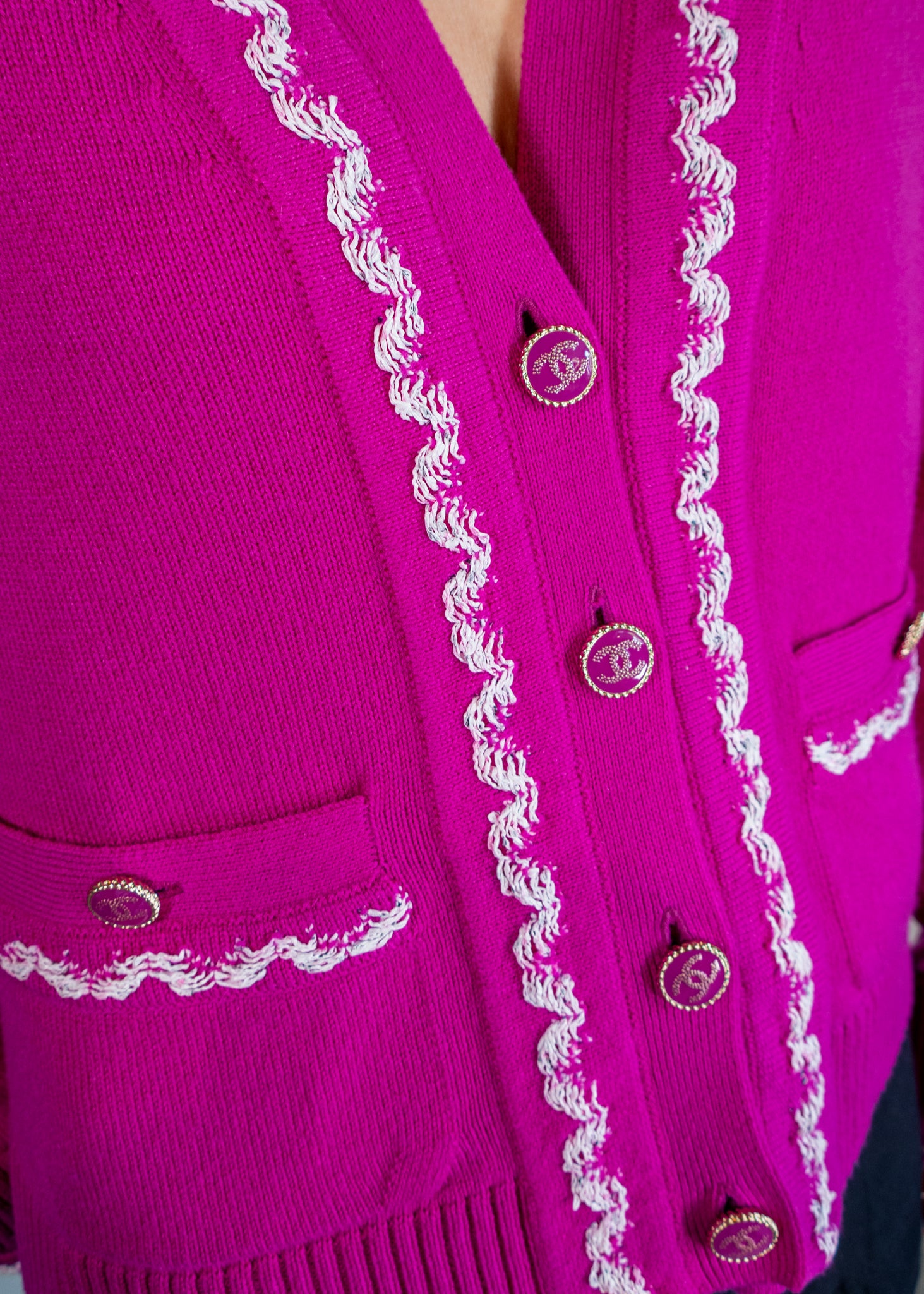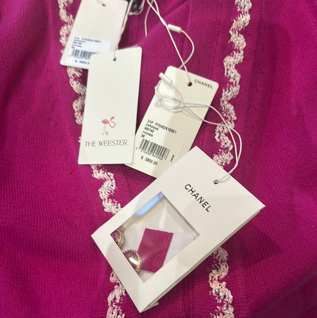 New with tags! The Chanel 2021 Cashmere Cardigan epitomizes timeless elegance and luxury. Crafted from the finest cashmere fibers, this exquisite piece boasts impeccable quality and unparalleled softness. Its classic silhouette is elevated with meticulous attention to detail, featuring delicate Chanel tweed accents along the cuffs and hem, adding a touch of sophistication. The cardigan's versatile design effortlessly transitions from day to evening, making it a staple in any wardrobe. Whether layered over a chic blouse for a polished daytime look or paired with a cocktail dress for a glamorous evening ensemble, the Chanel 2021 Cashmere Cardigan is a statement of refinement and style.