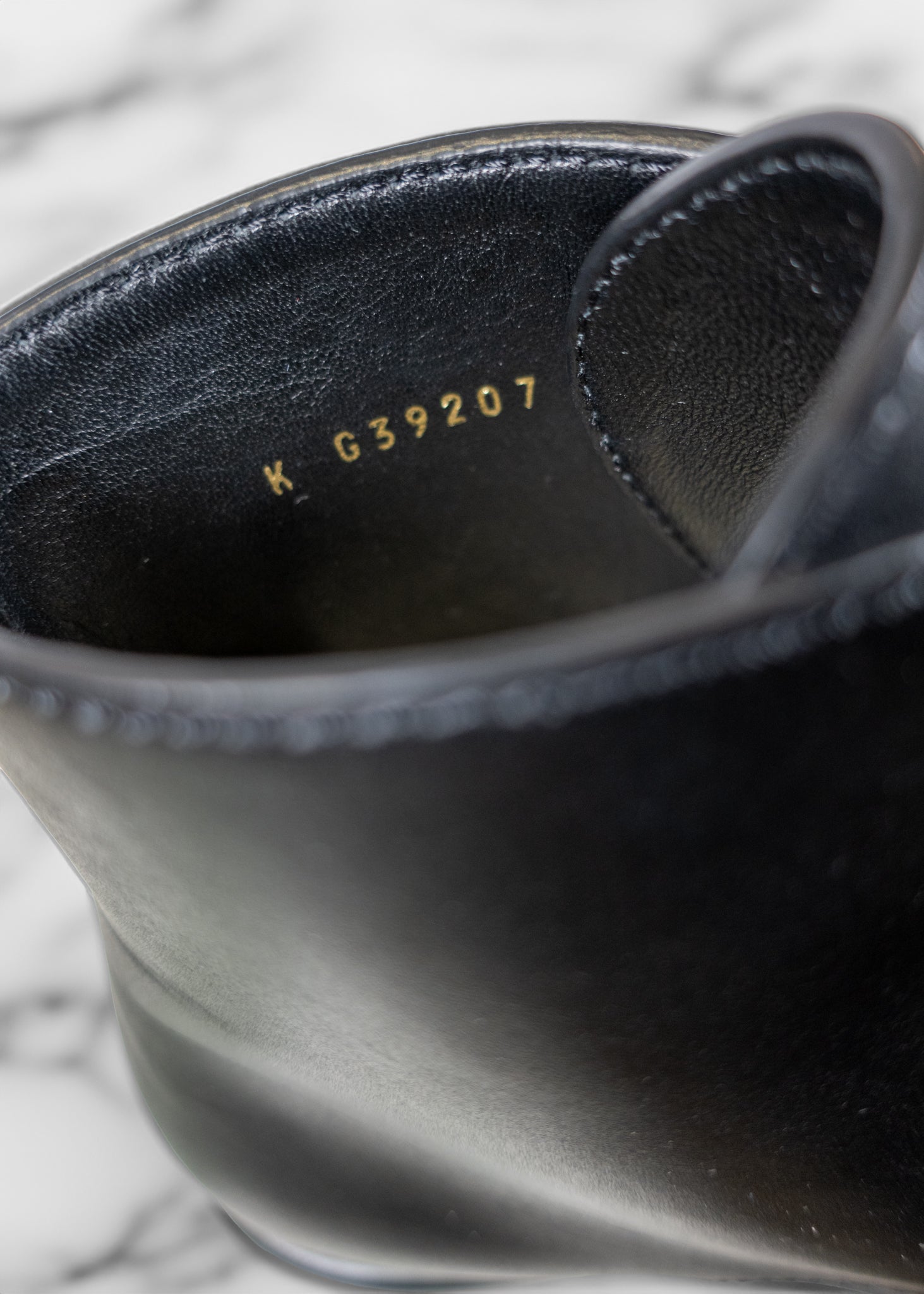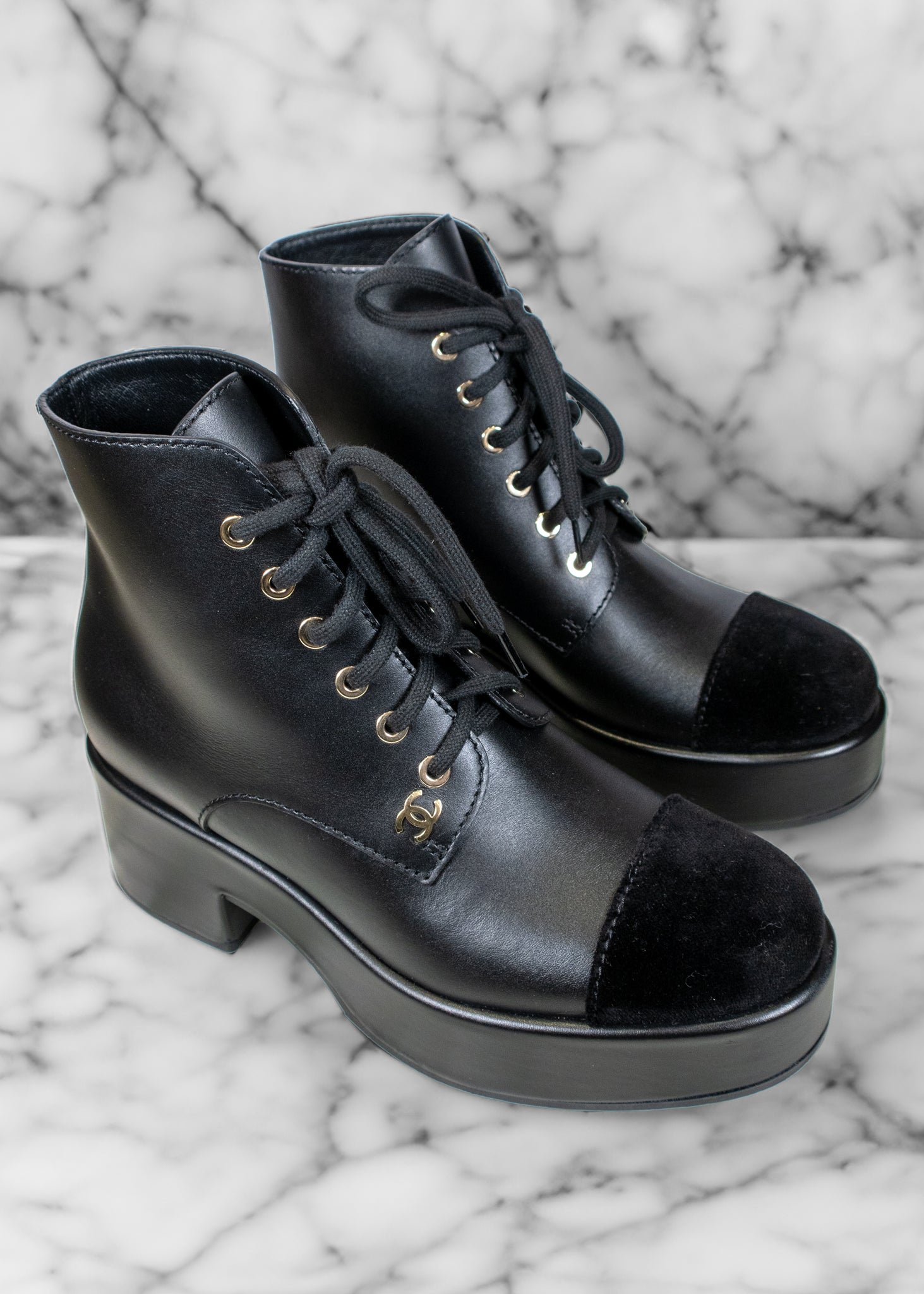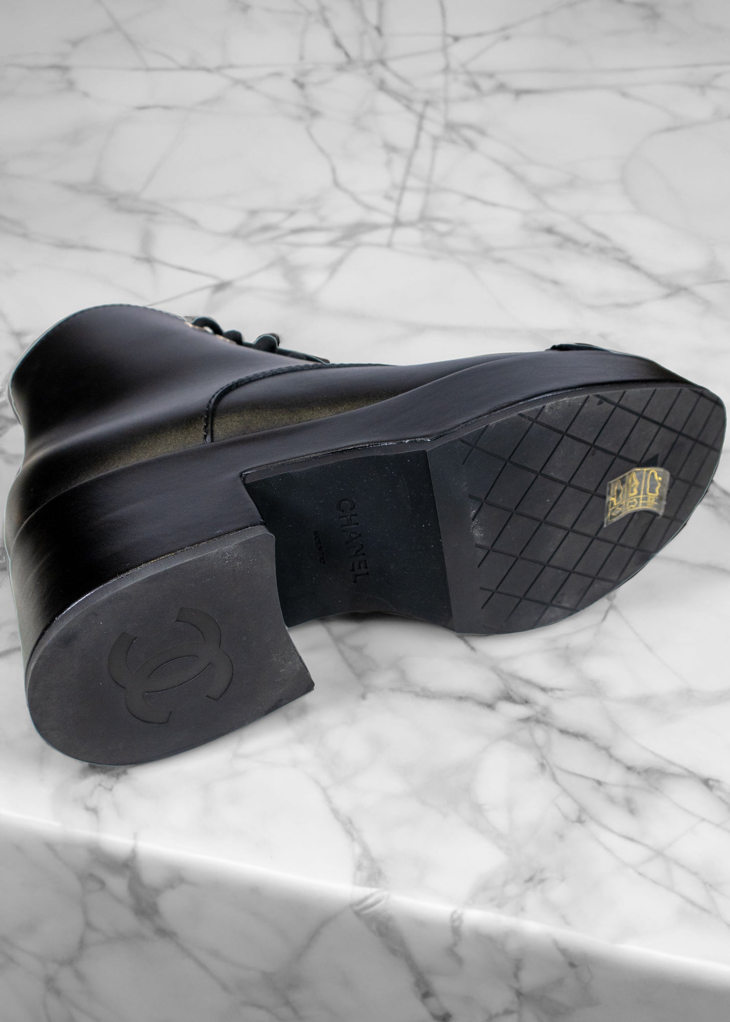 The Chanel 2022 Leather Combat Boots are the epitome of sophisticated edginess. Crafted from luxurious leather, these boots boast a sleek silhouette with a hint of rebellious charm. Featuring a chunky sole and intricate detailing, such as quilted panels and the iconic interlocking CC logo, these boots seamlessly blend high fashion with practicality. Perfect for adding a bold statement to any outfit, whether paired with jeans for a casual daytime look or with a dress for an evening out, these boots are a timeless addition to any wardrobe.