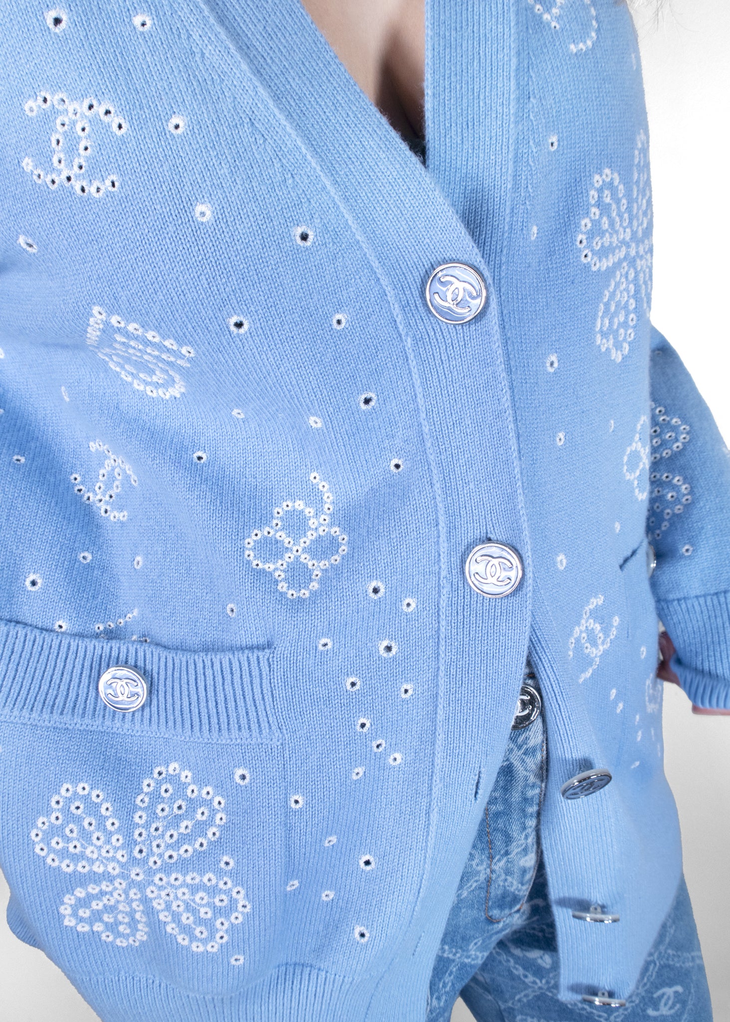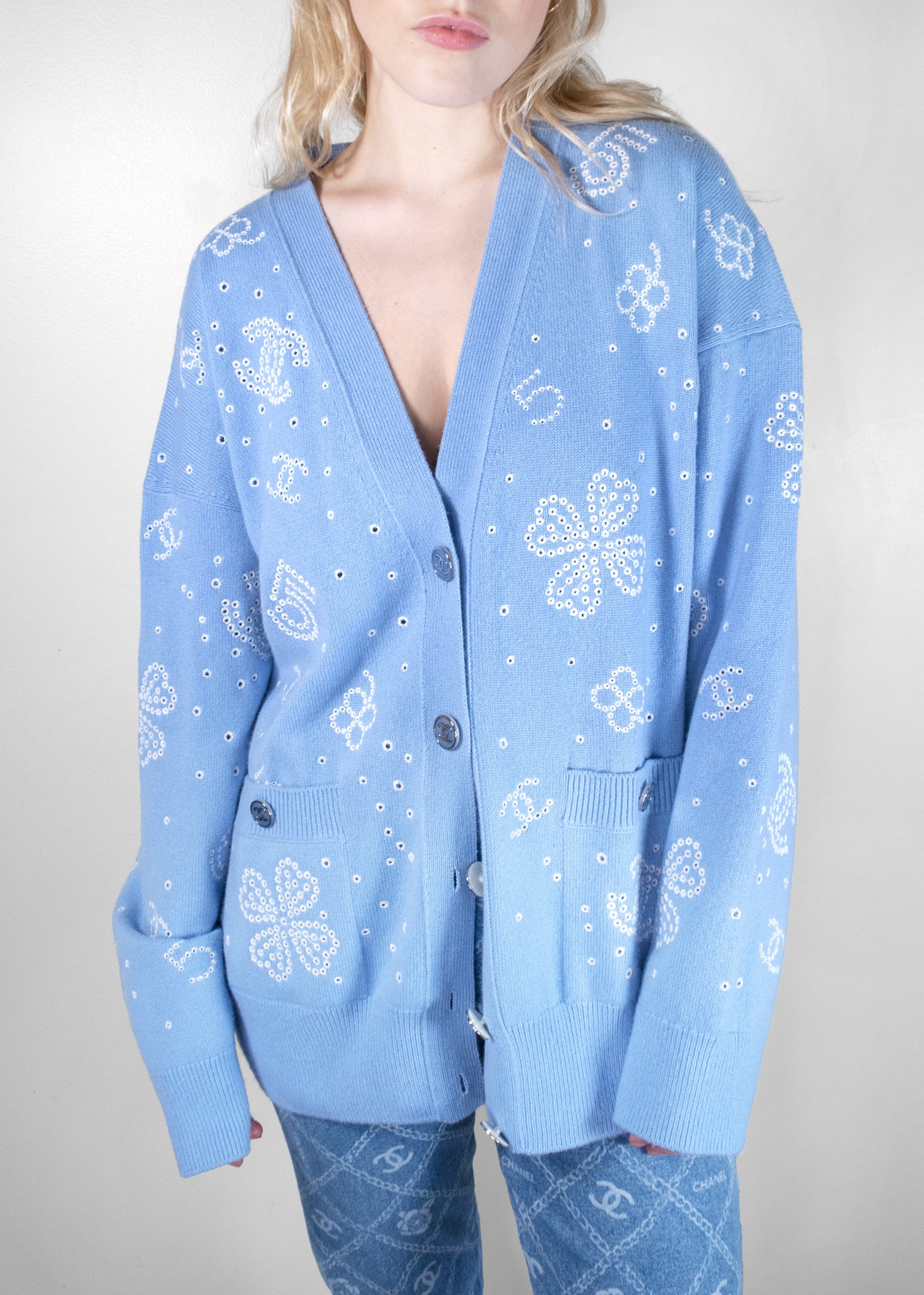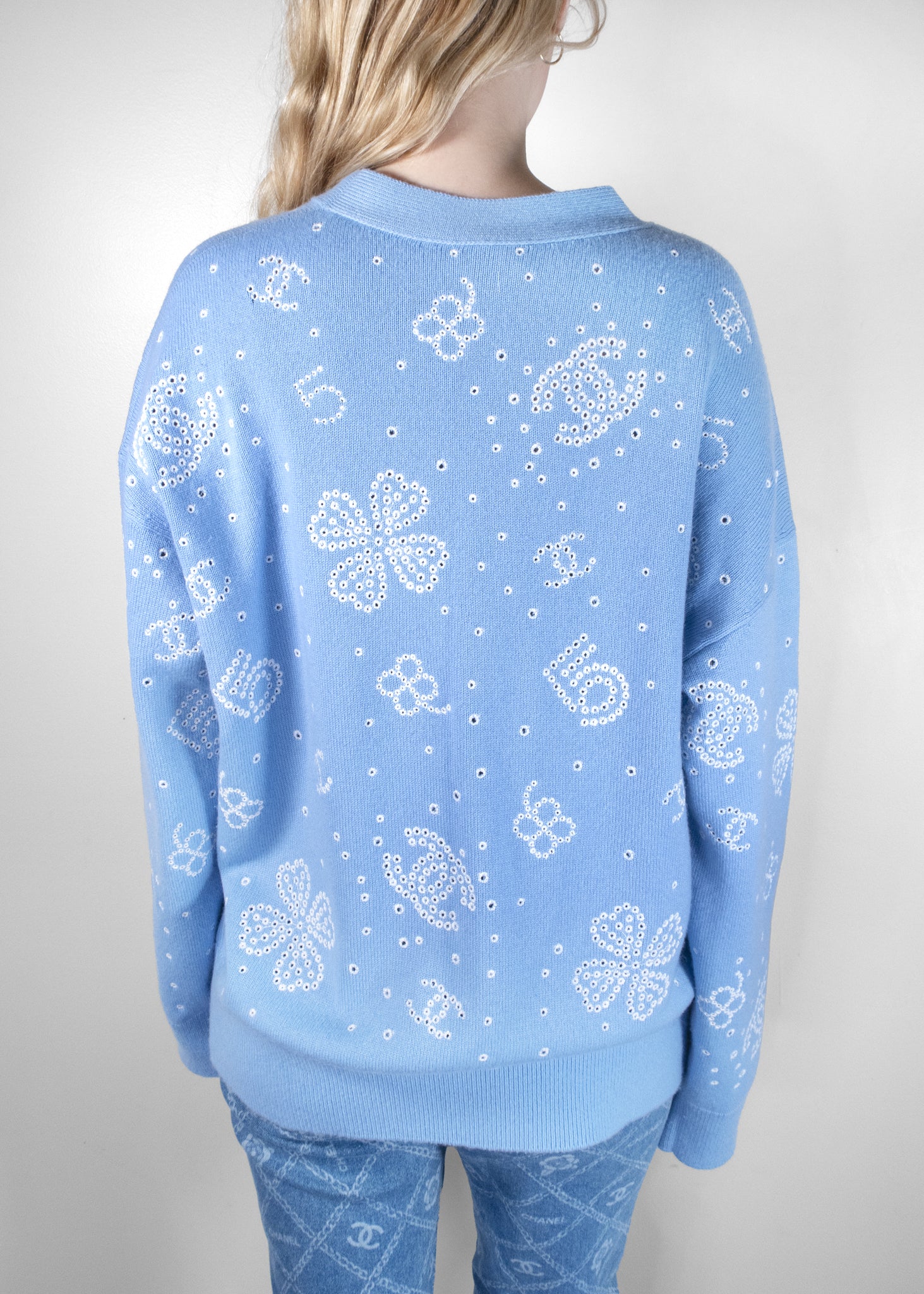 The Chanel 2023 Cashmere Sweater is a luxurious and stylish piece, crafted from the finest cashmere for a soft, comfortable fit. Featuring a light blue color, it is adorned with intricate white sequin floral designs and iconic Chanel logos, making it a standout in any wardrobe. The cardigan's classic cut includes practical pockets and ribbed cuffs for added sophistication. The delicate button details and the attention to detail with its embellishments make this sweater both chic and timeless, perfect for elevating any casual or semi-formal outfit with an air of elegance.