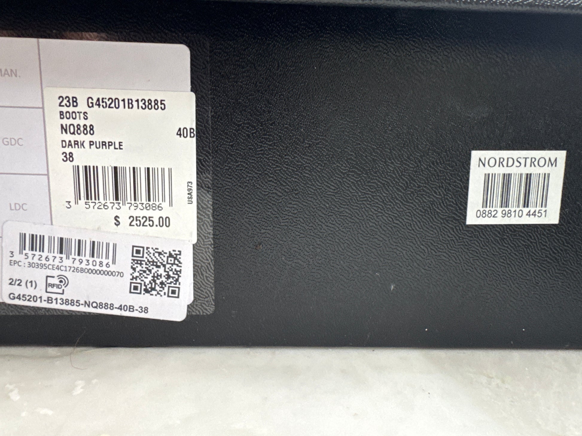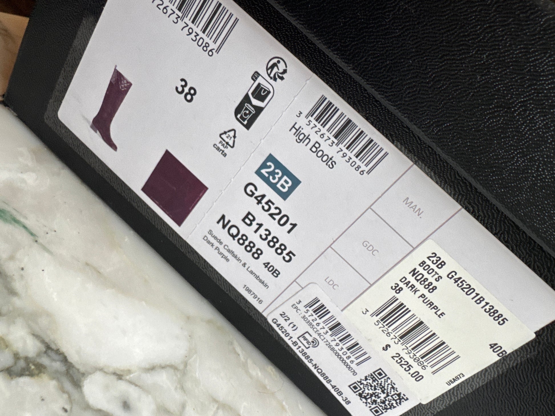 These luxurious riding boots from Chanel are a striking blend of elegance and utility. Made from rich suede, the deep burgundy color exudes sophistication, while the glossy leather cuff features the iconic interlocking CC logo embossed on the top, adding a signature Chanel touch. The leather details and quilted pattern give them a classic, timeless appeal. The boots are designed with a block heel, providing comfort and a sturdy step, perfect for both casual and dressier occasions. These boots are a statement piece, combining comfort, style, and the undeniable prestige of the Chanel brand.
