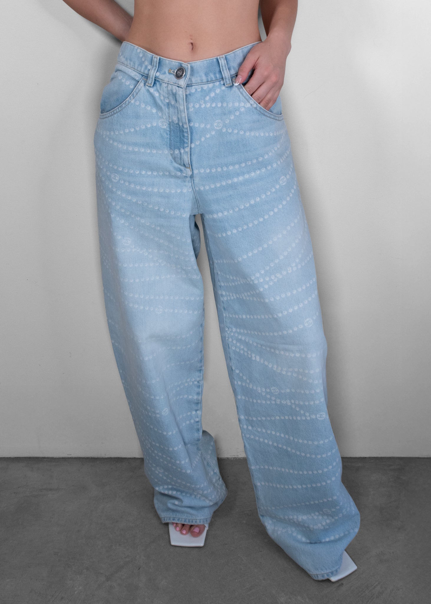 The Chanel 2025 Pearl Print Wide Leg Jeans reimagine casual denim with signature sophistication. Crafted in a soft light wash, these jeans feature an allover dotted pattern arranged in elegant, wave-like lines with subtle interlocking CC logos throughout. The relaxed wide-leg silhouette and high-rise waist offer a flattering, fashion-forward fit. Perfect for pairing with crop tops, knits, or structured blazers, these jeans balance comfort and luxury—delivering an elevated take on everyday denim with unmistakable Chanel flair.