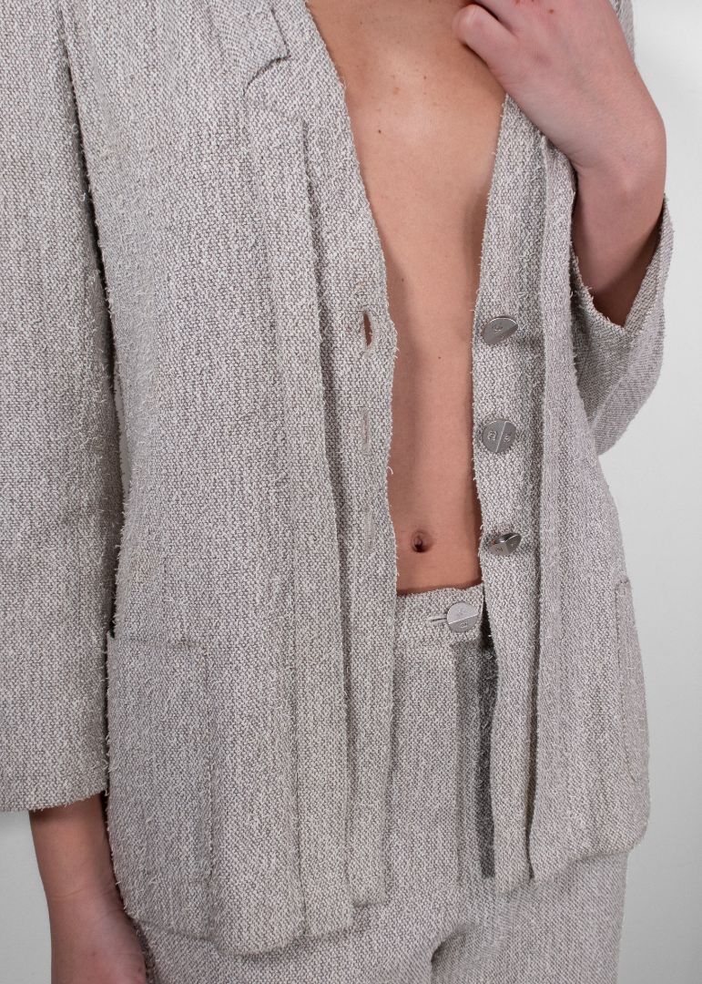 Elevate your wardrobe with this timeless Chanel 99c beige linen jacket set in size 34. Crafted from premium linen, this classic piece exemplifies Chanel's signature sophistication and refined elegance. The structured silhouette and impeccable tailoring make it versatile enough for both professional settings and elevated casual occasions. Perfect for layering or wearing as a statement piece, this jacket set delivers the luxury and enduring style that defines the Chanel aesthetic. An investment in timeless fashion that transcends seasonal trends.