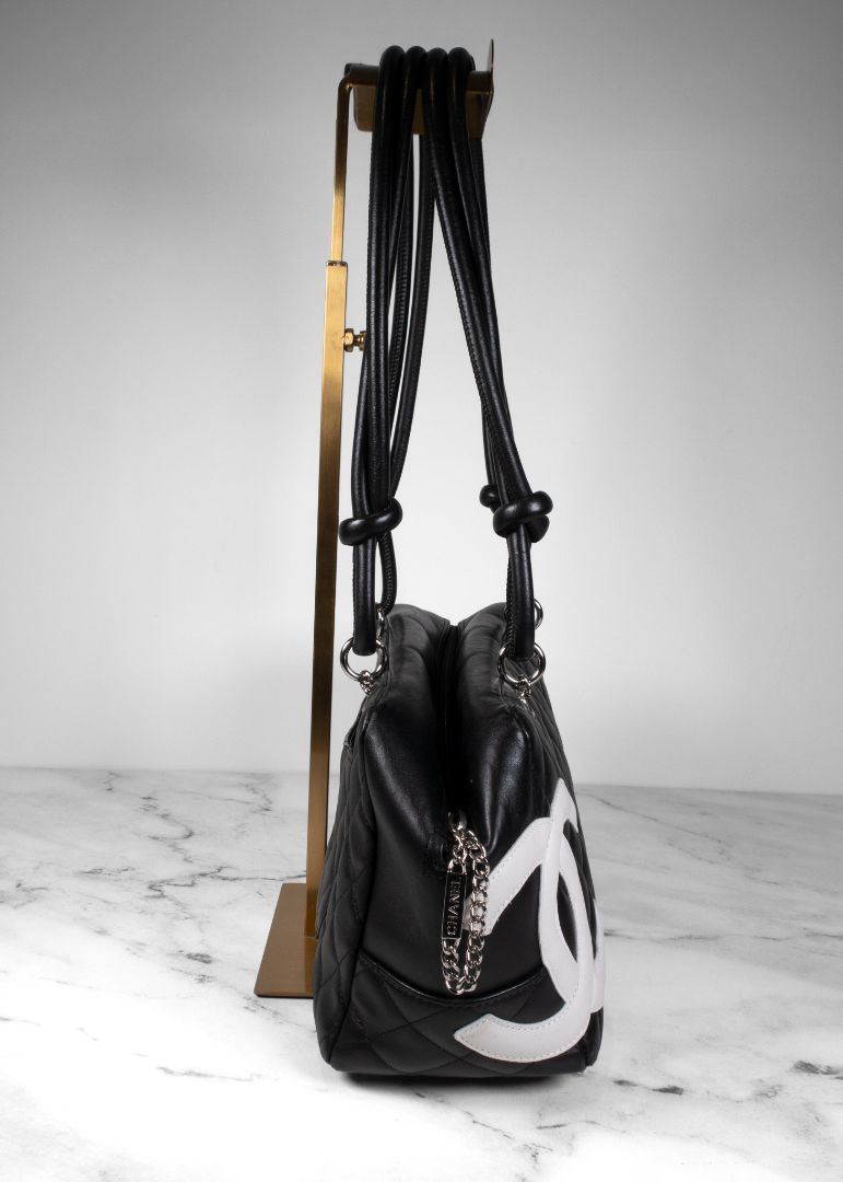 Chanel Black Calfskin Quilted Cambon Bowler Bag With White CC
