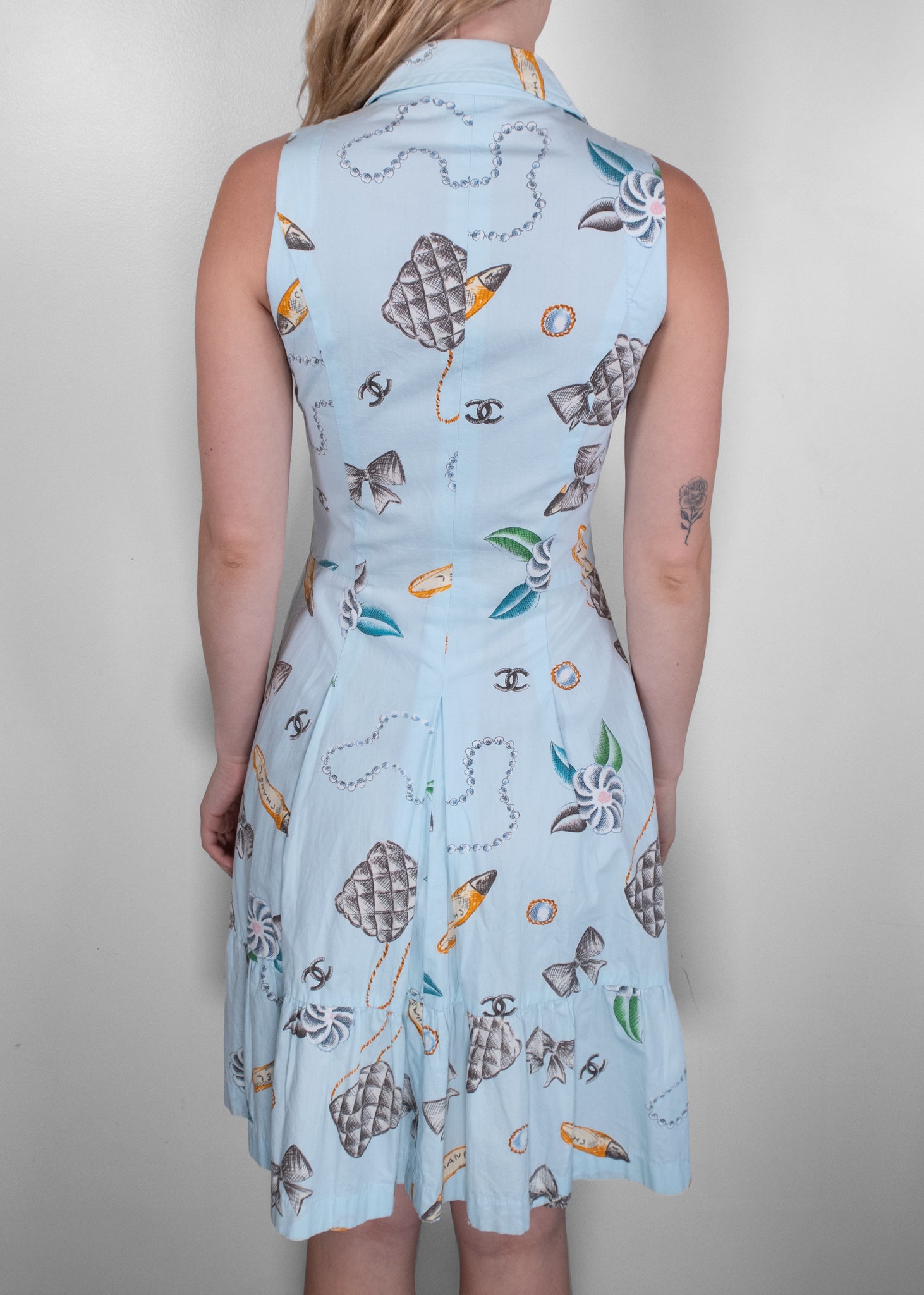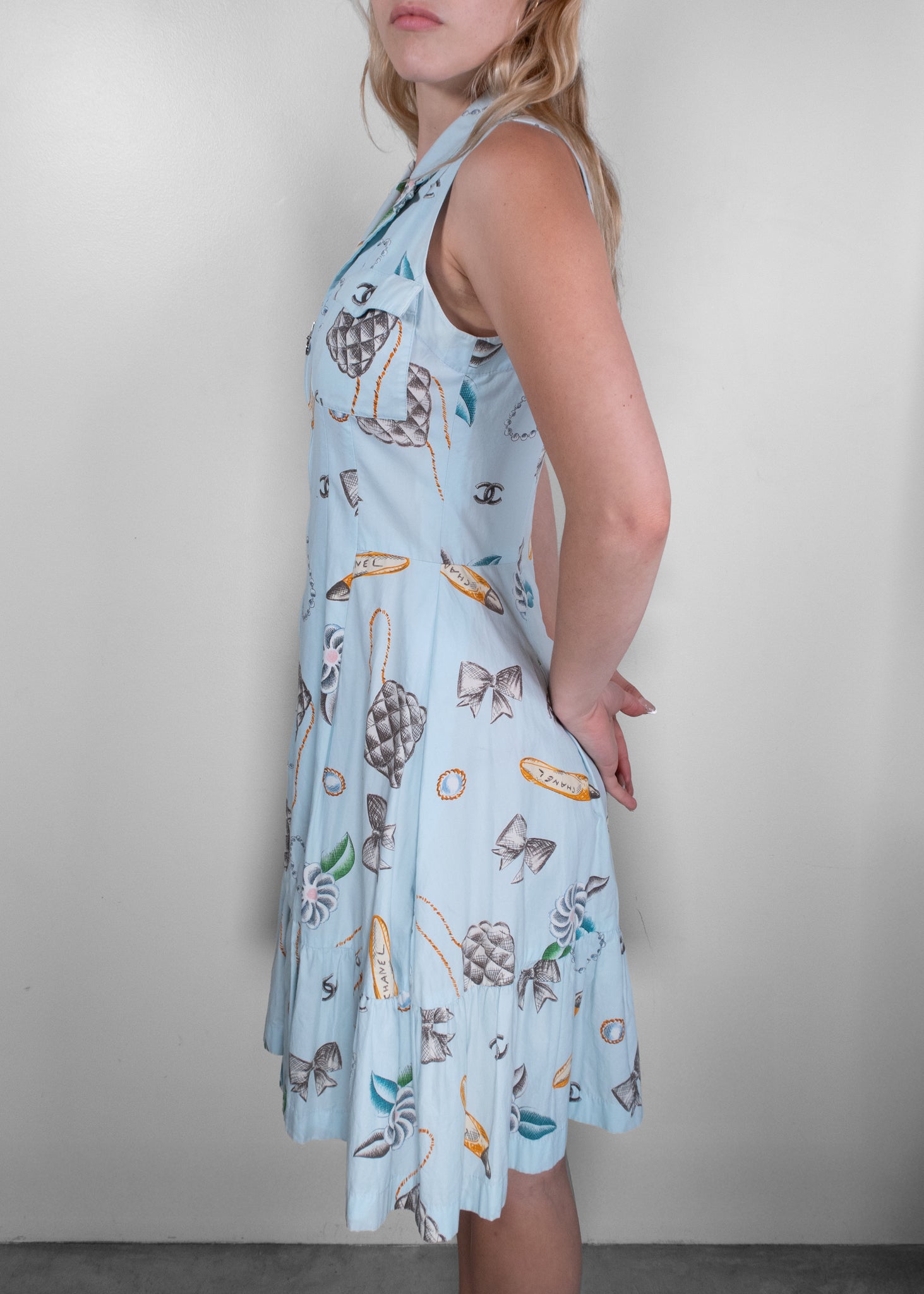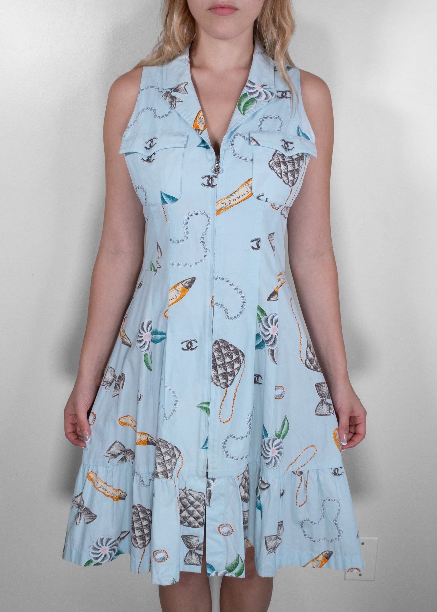 This Chanel Blue Cotton Printed Day Dress brings playful charm to classic French elegance. Crafted from lightweight cotton, the sleeveless dress features a soft blue base adorned with whimsical Chanel motifs—quilted bags, pearls, bows, and camellias—all signature elements of the house. The fitted bodice with front pockets and a zip closure flows into a subtly flared skirt with a tiered hem, offering a flattering and feminine silhouette. Perfect for warm weather outings, this dress captures effortless sophistication with a joyful twist.
