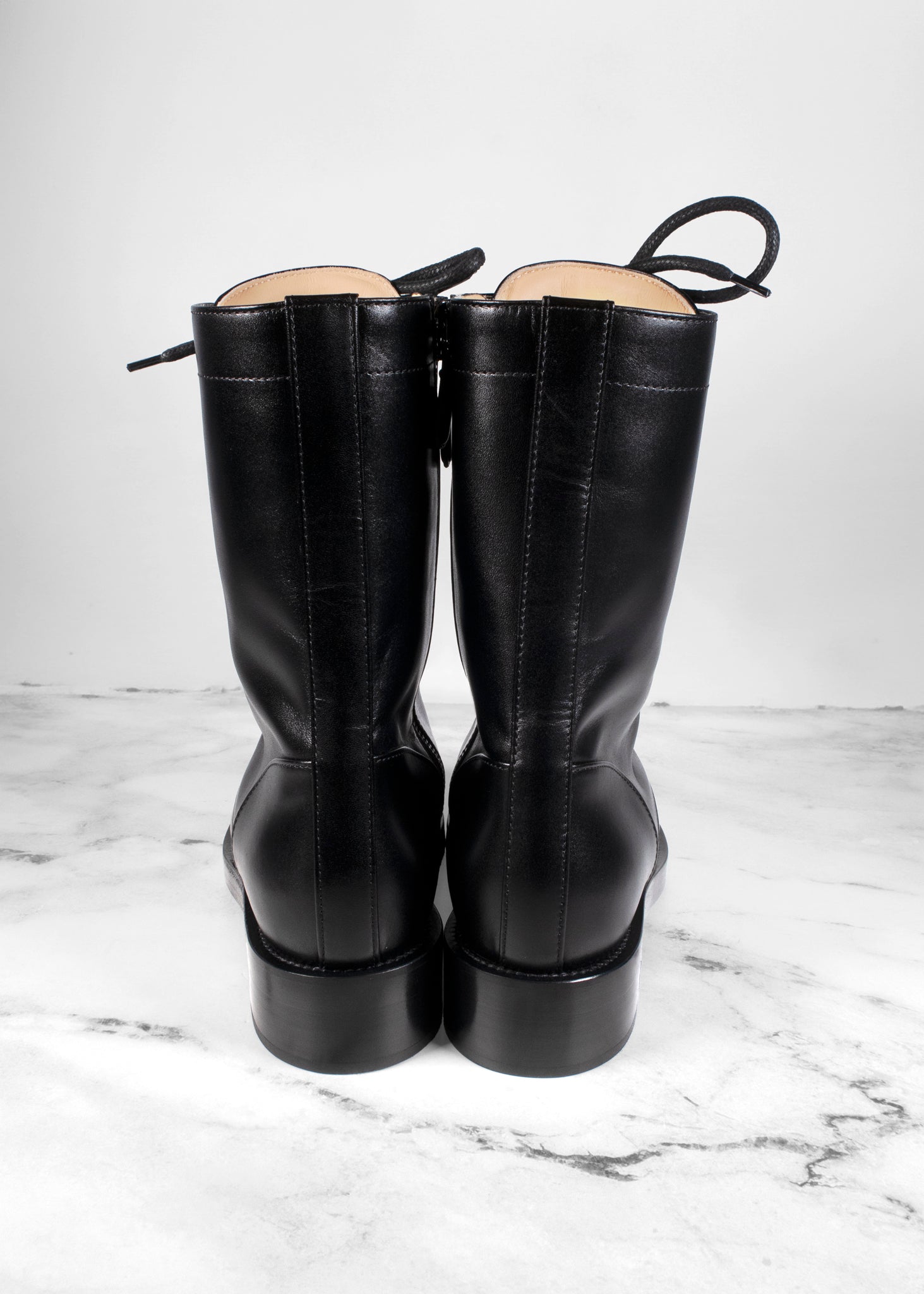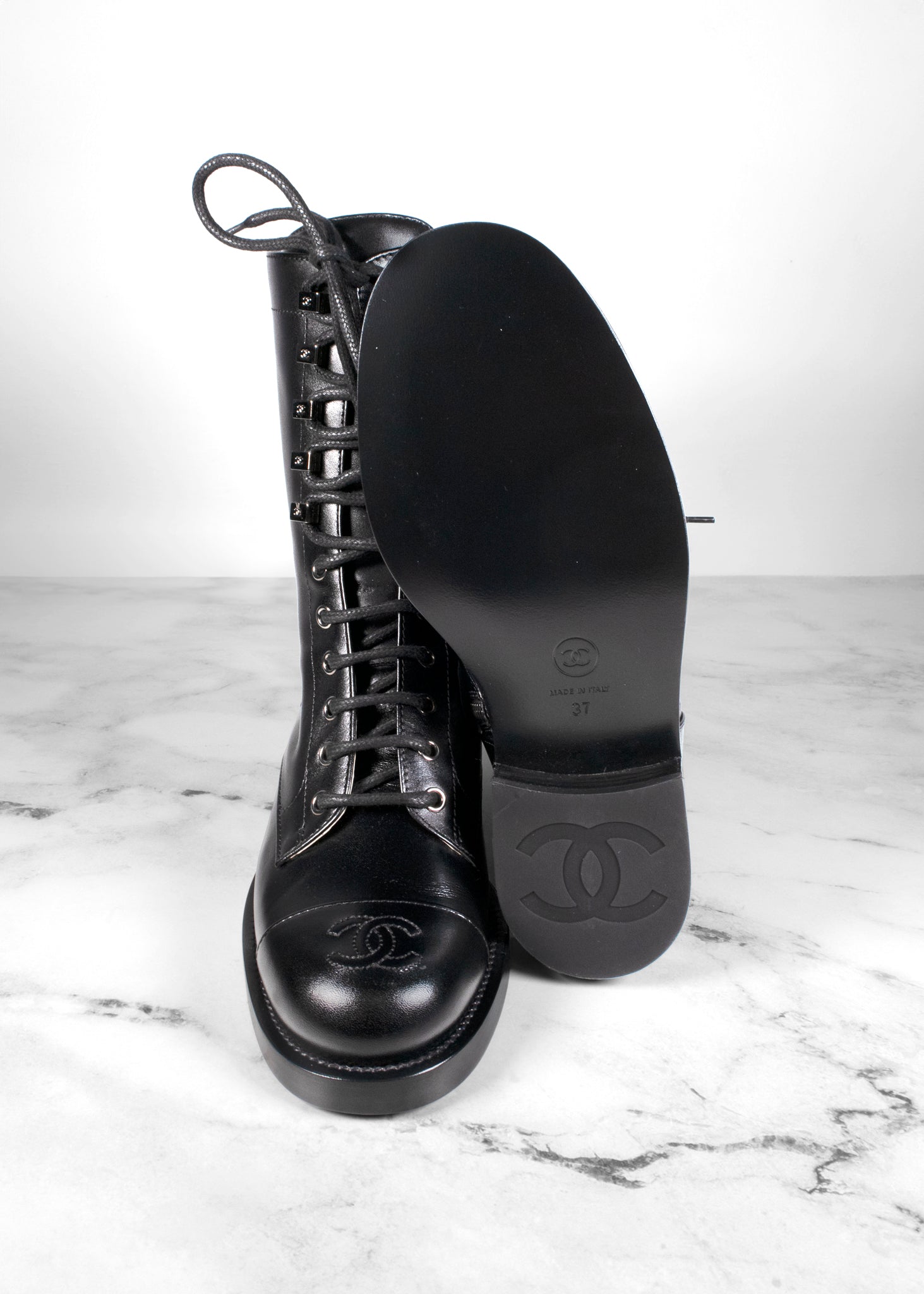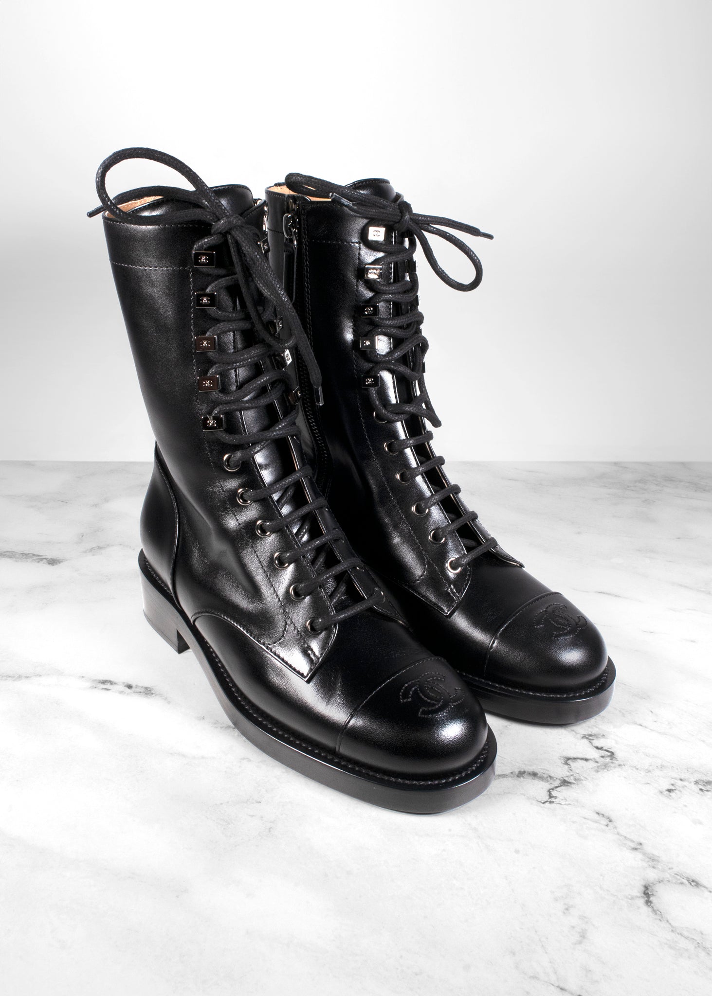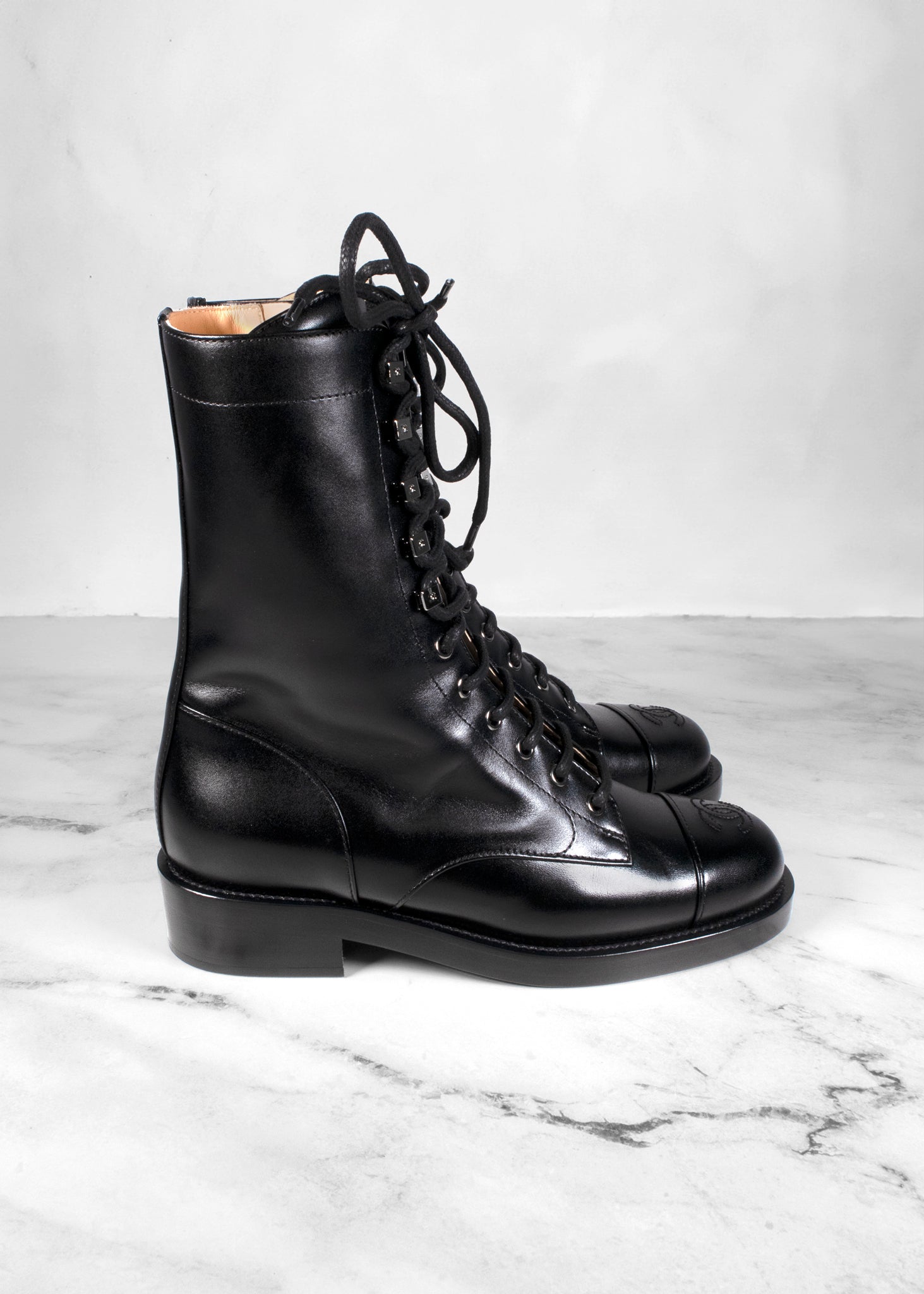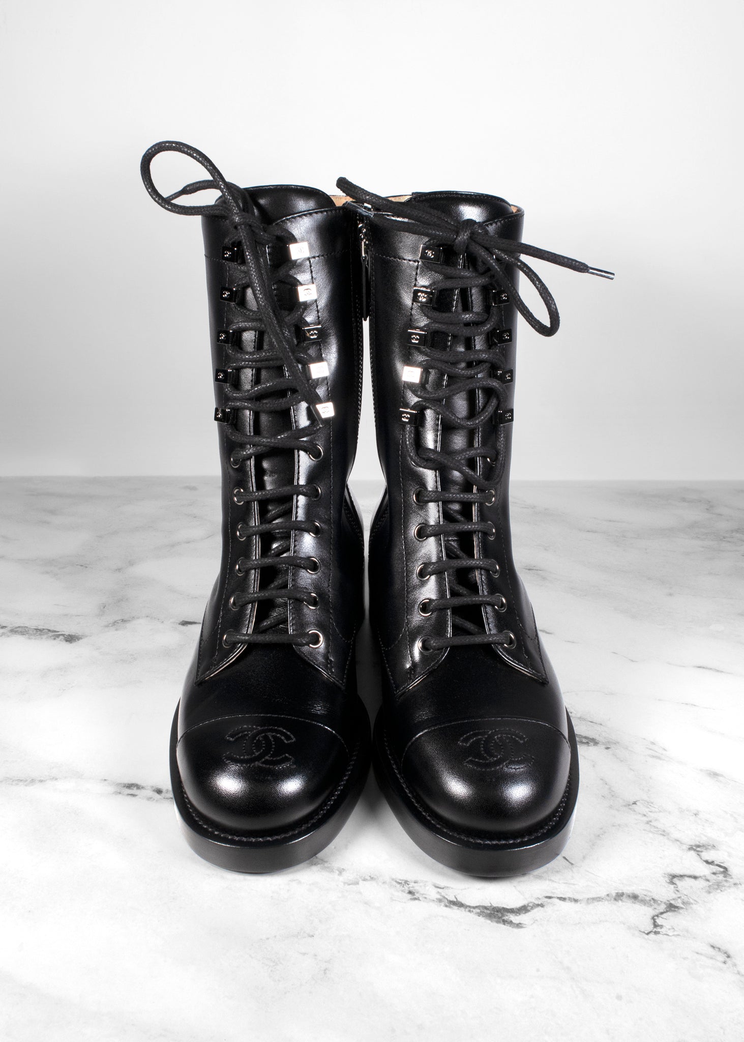 The Chanel Calfskin Lace Up Combat Boot combines luxury with a bold, utilitarian design. Crafted from high-quality calfskin, these boots feature a sturdy lace-up front and durable rubber sole, offering both comfort and style. The signature Chanel logo is subtly integrated, adding an element of refinement to the rugged silhouette. Perfect for adding an edgy yet sophisticated touch to any outfit.