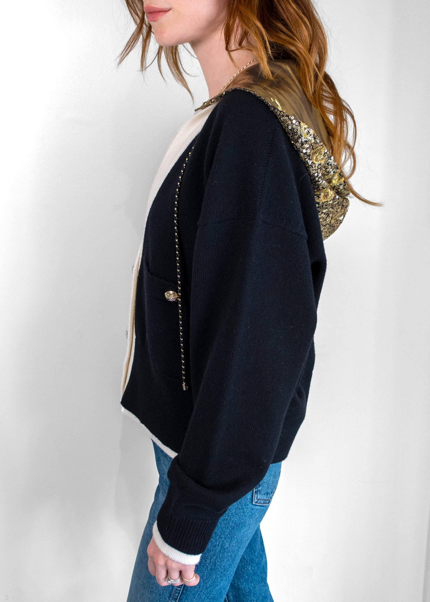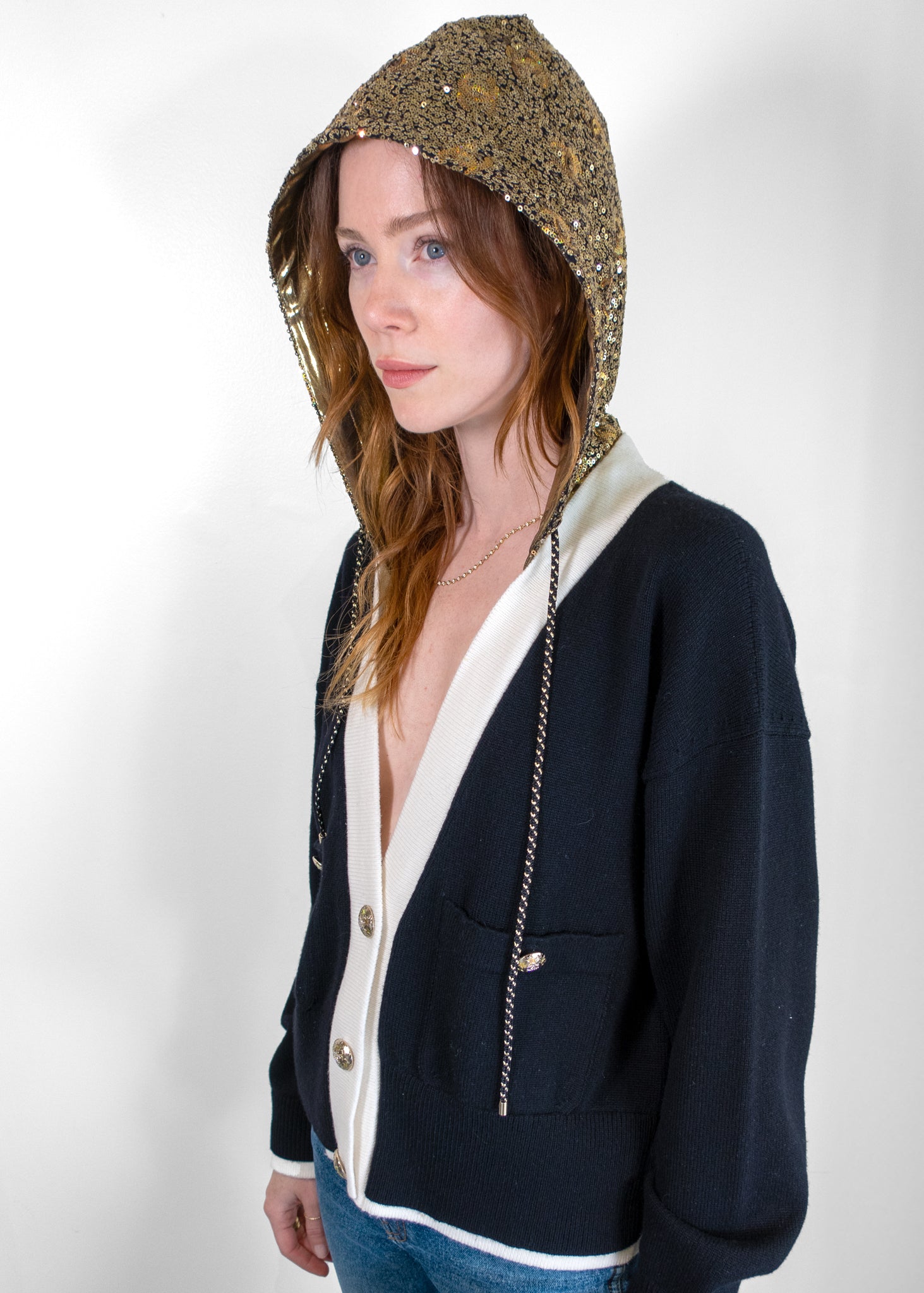 The Chanel Cashmere Cardigan With Sequin Hood epitomizes luxury and sophistication with a modern twist. Crafted from sumptuously soft cashmere, this exquisite cardigan combines classic comfort with opulent detailing. The sequin-adorned hood adds a touch of glamour and playfulness to the timeless silhouette, effortlessly elevating any ensemble. Perfect for cozy evenings or chic outings, this statement piece seamlessly blends elegance with contemporary style, embodying the quintessential Chanel aesthetic of timeless allure.