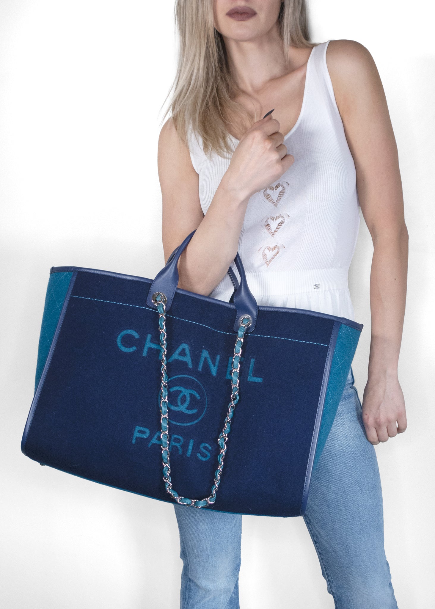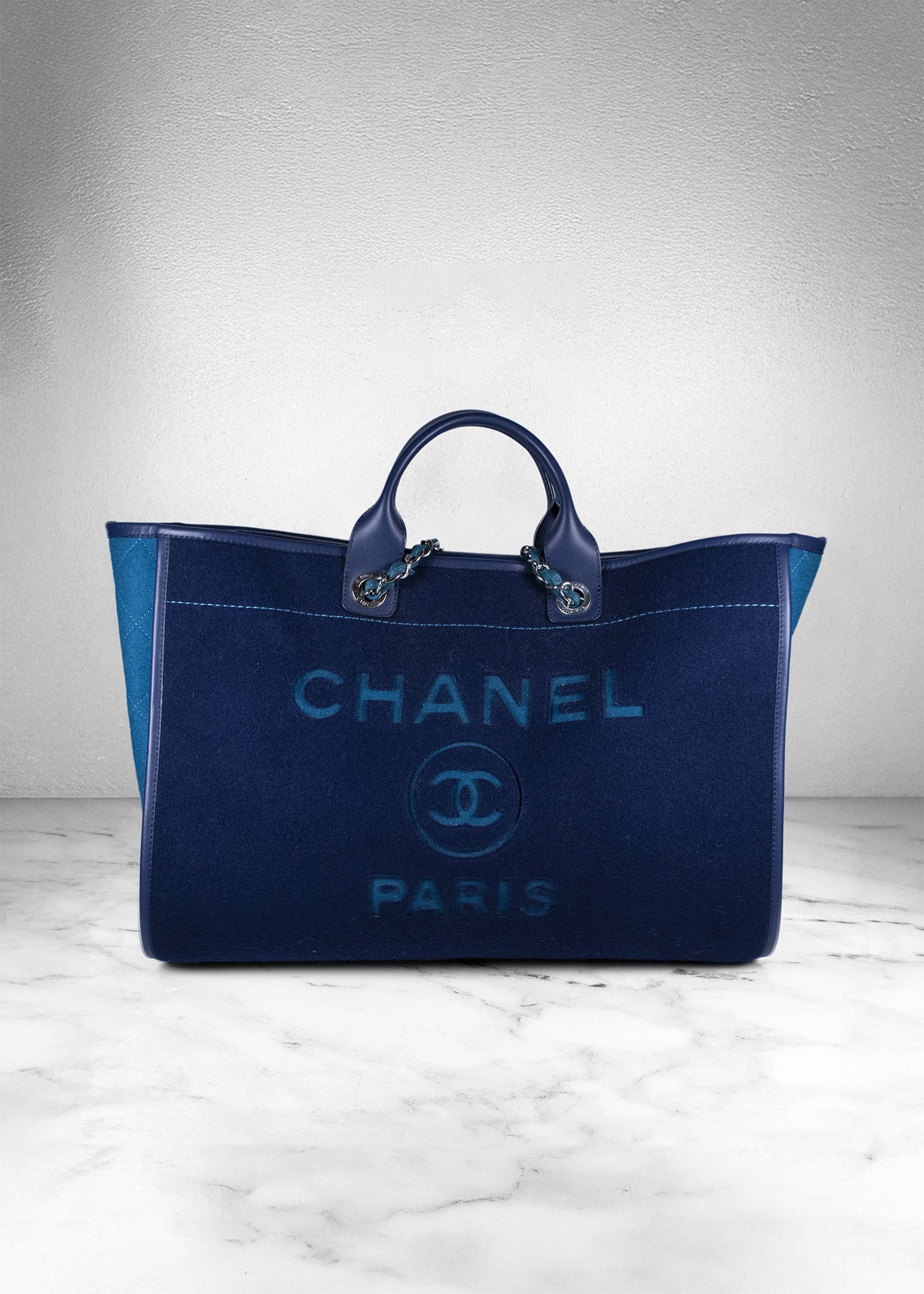 The Chanel Deauville Coco Mark Navy Blue Tote Bag is a timeless blend of sophistication and practicality. Crafted from durable canvas in a deep navy hue, it features the iconic Coco Chanel logo and chain-link leather handles, offering both elegance and functionality. Spacious and versatile, this tote is perfect for daily use or as a chic travel companion, embodying Chanel's effortless Parisian charm.