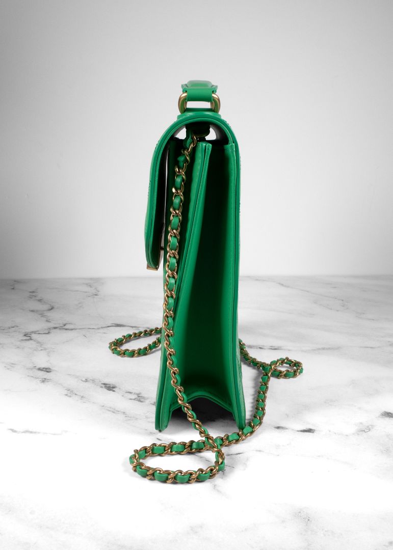 Elevate your collection with this iconic Chanel flap bag, crafted from lustrous green patent leather that captures light with every movement. The signature diamond quilting provides dimensional texture and timeless appeal, while polished gold hardware adds refined sophistication. This structured silhouette offers versatile styling—equally at home with evening wear or elevated daywear. The flap closure ensures secure storage, and the compact proportions make it an ideal accessory for those who appreciate investment pieces that transcend seasonal trends. A statement bag that embodies Chanel's legacy of understated luxury.