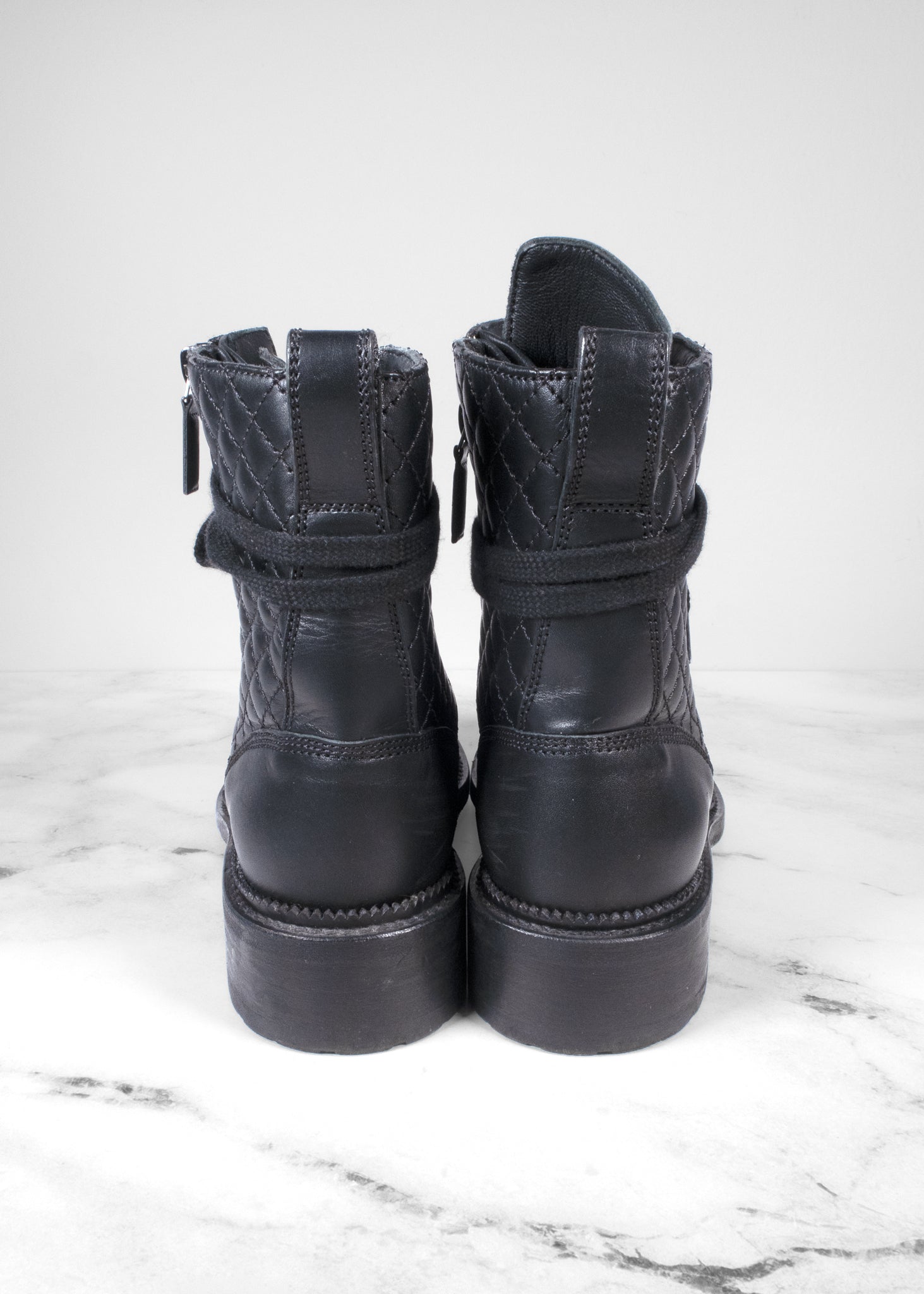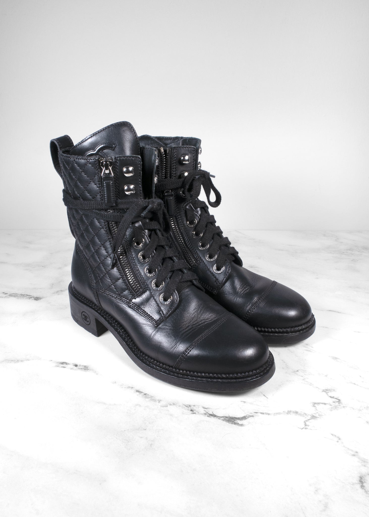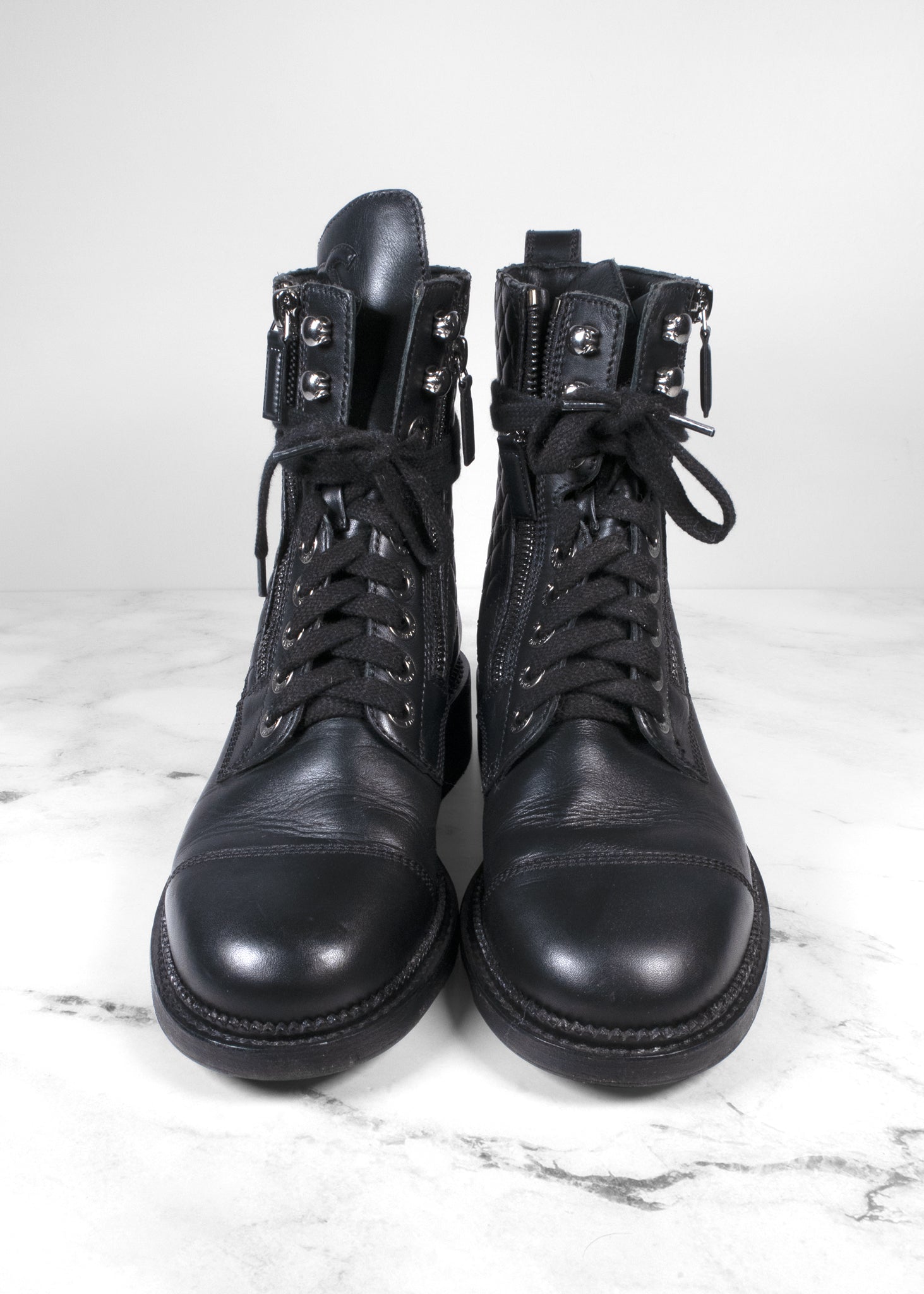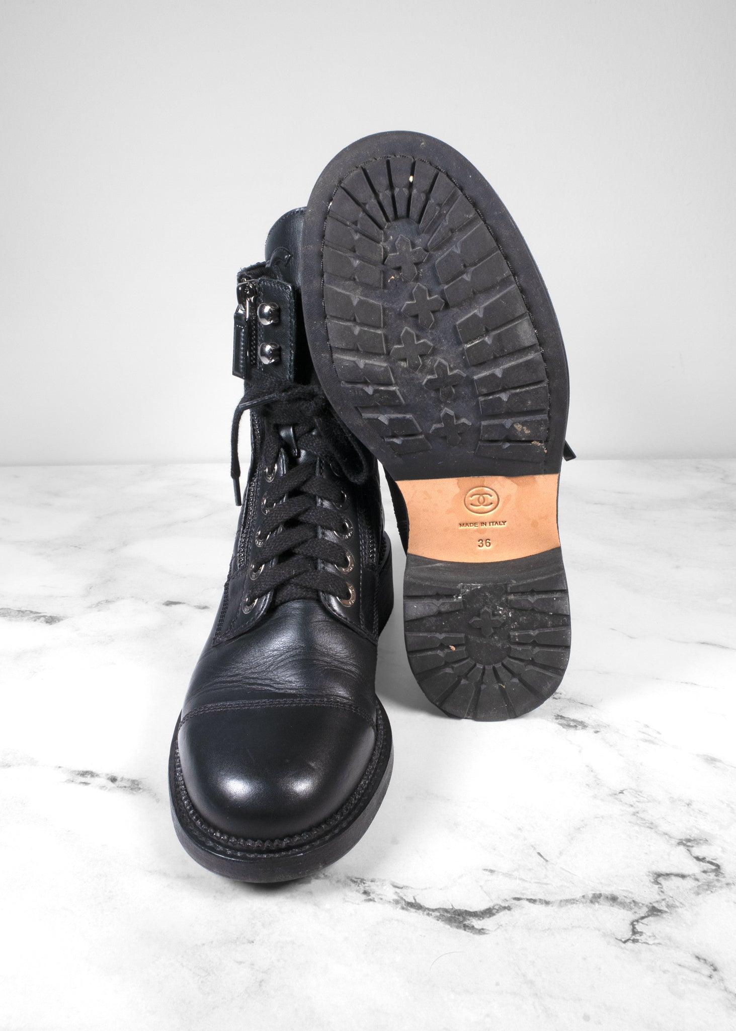 The Chanel Interlocking CC Logo Leather Combat Boots are a stylish blend of luxury and ruggedness. Made from premium leather, they feature the iconic interlocking CC logo on the side for a signature touch. The boots are designed with a chunky rubber sole, providing both comfort and durability, making them a standout piece for fashion-forward individuals seeking a bold yet elegant look. Perfect for pairing with casual or edgy outfits, these combat boots exude a sense of high-end sophistication and practicality.