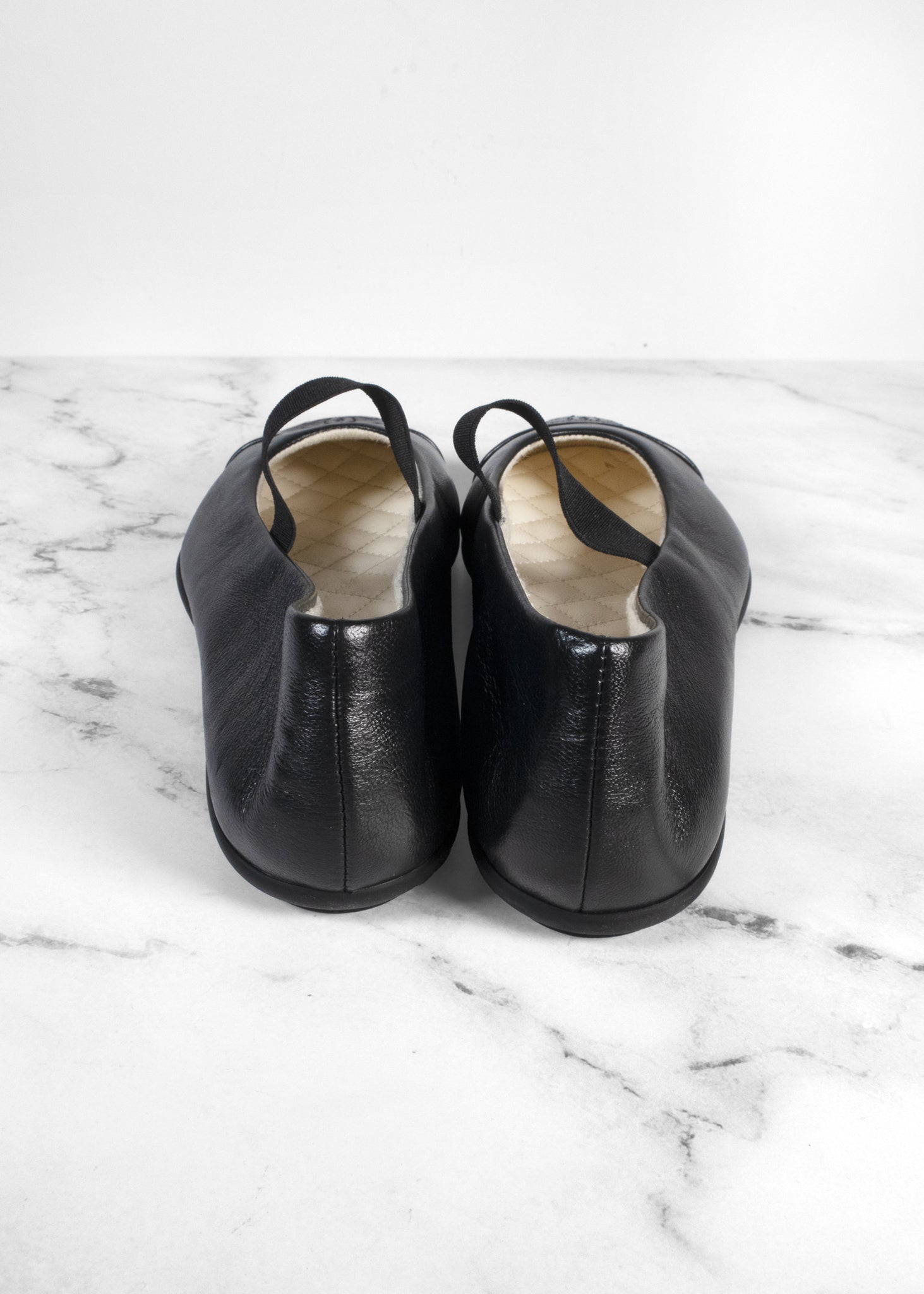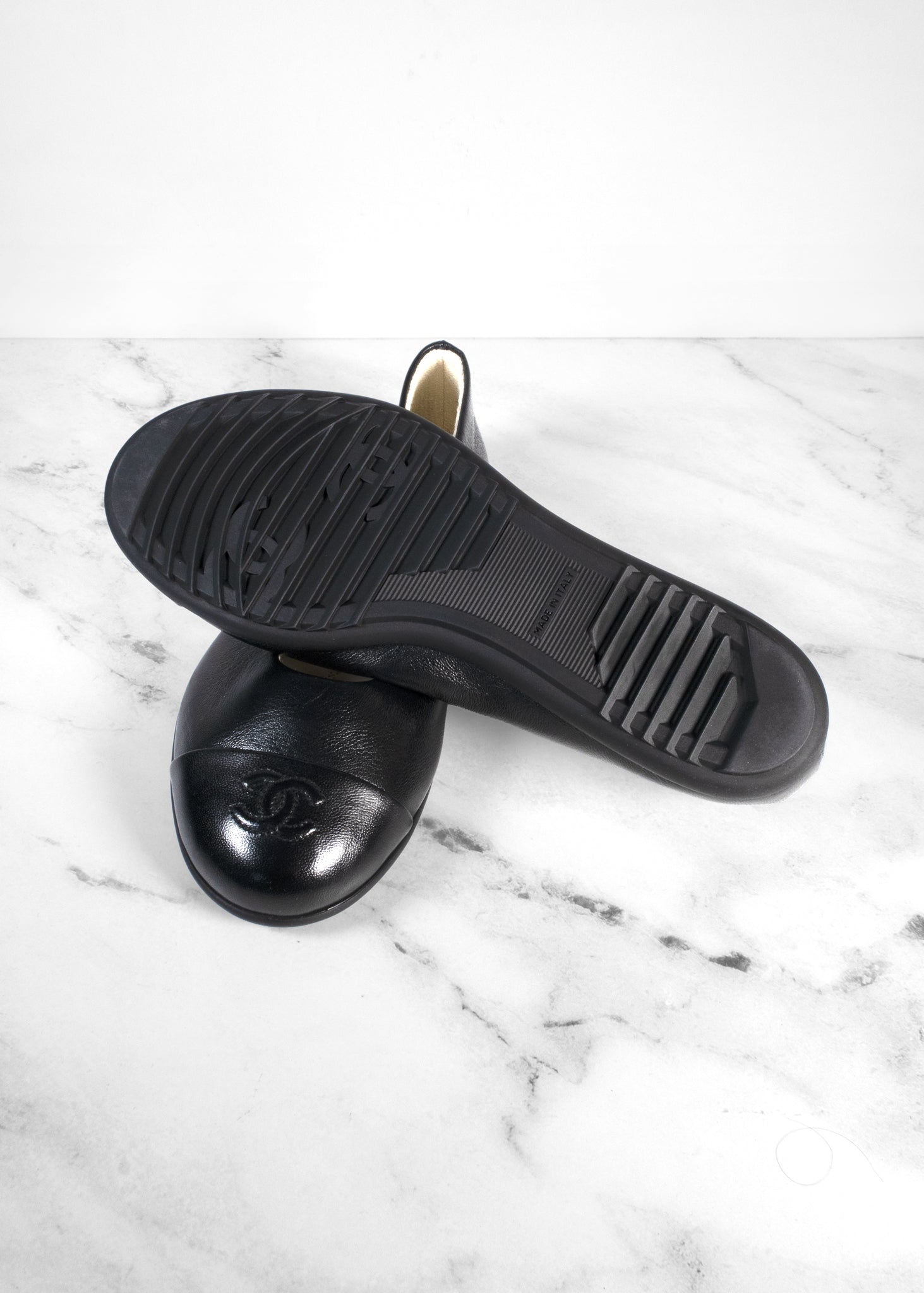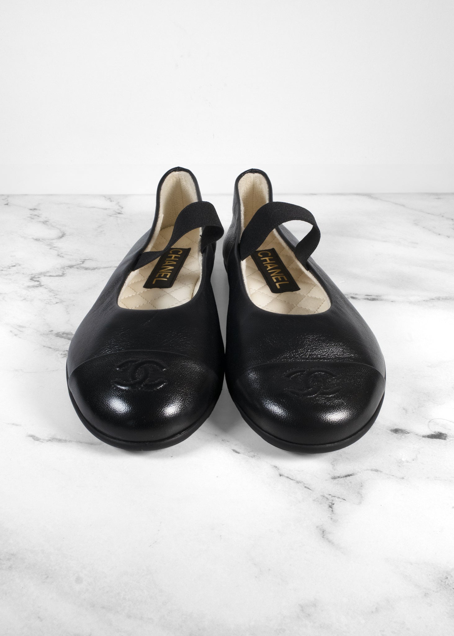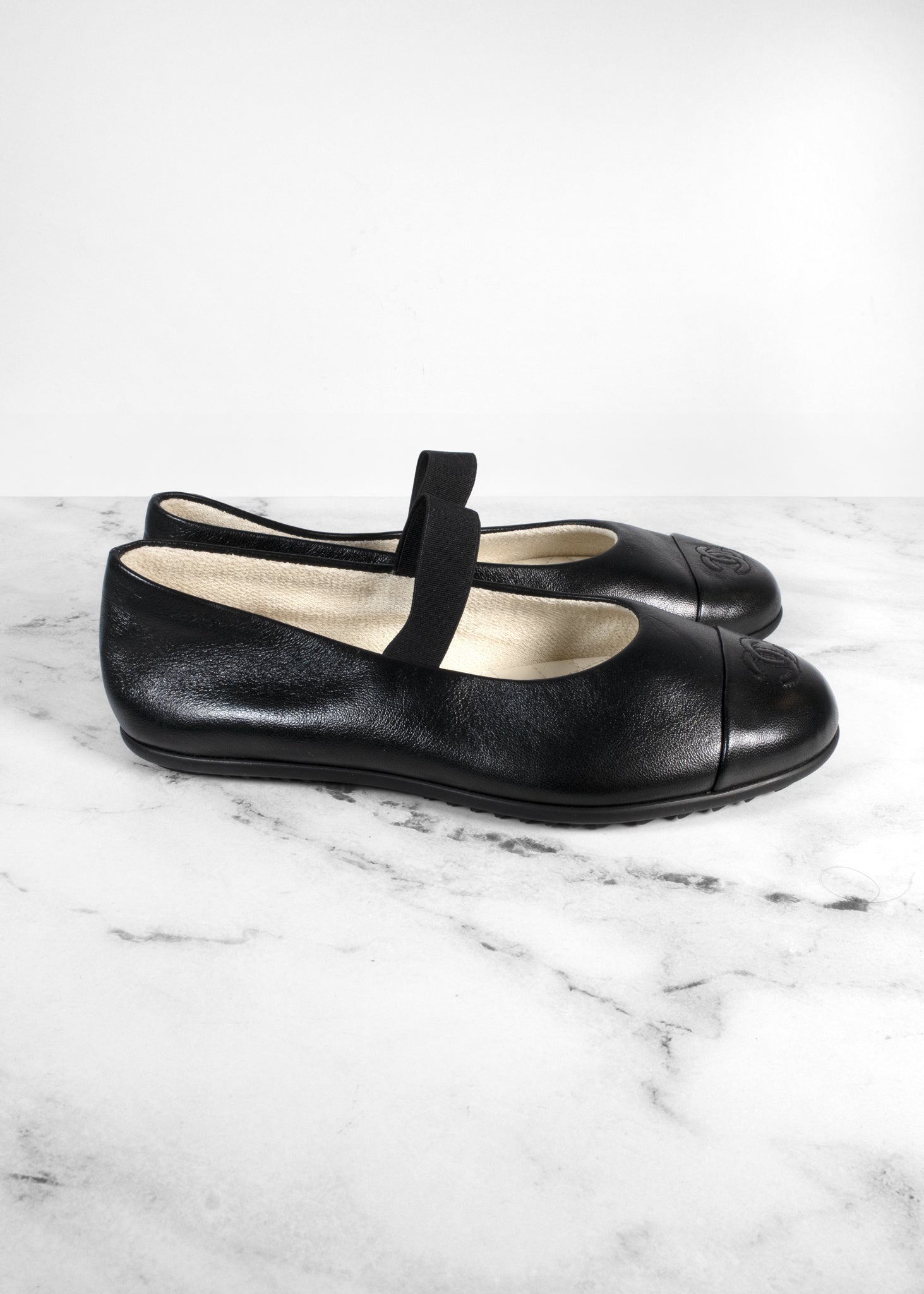 These Chanel Mary Jane flats are crafted from luxurious lambskin, offering a sleek and soft texture. The signature CC logo is embossed on the cap toe, adding a touch of elegance to the classic black design. The flat silhouette is both comfortable and stylish, perfect for everyday wear or dressing up a casual outfit. With the Mary Jane strap, these flats offer a secure and fashionable fit, making them a timeless addition to any wardrobe.