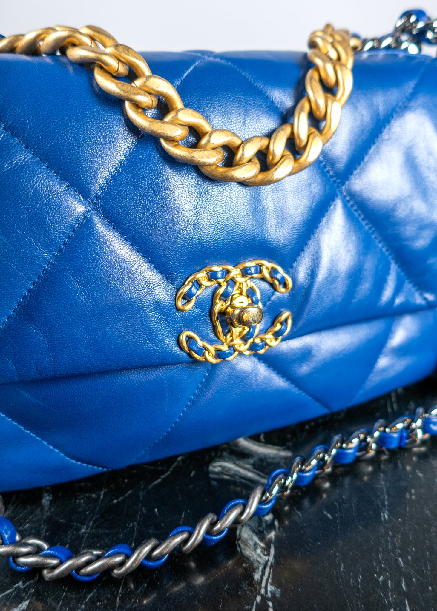 The Chanel Lambskin Quilted Medium 19 Blue Flap Bag is a luxurious statement piece featuring soft, supple lambskin in a striking blue hue. This iconic design showcases the signature diamond quilting, a bold CC logo, and a versatile chain strap, effortlessly blending modern elegance with timeless Chanel craftsmanship. Perfect for elevating any outfit, this bag is a must-have for fashion enthusiasts.