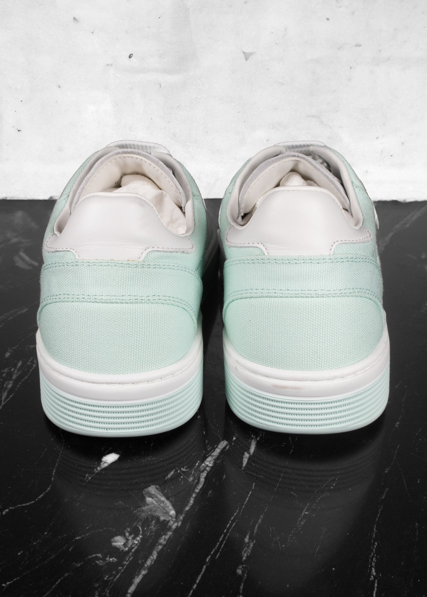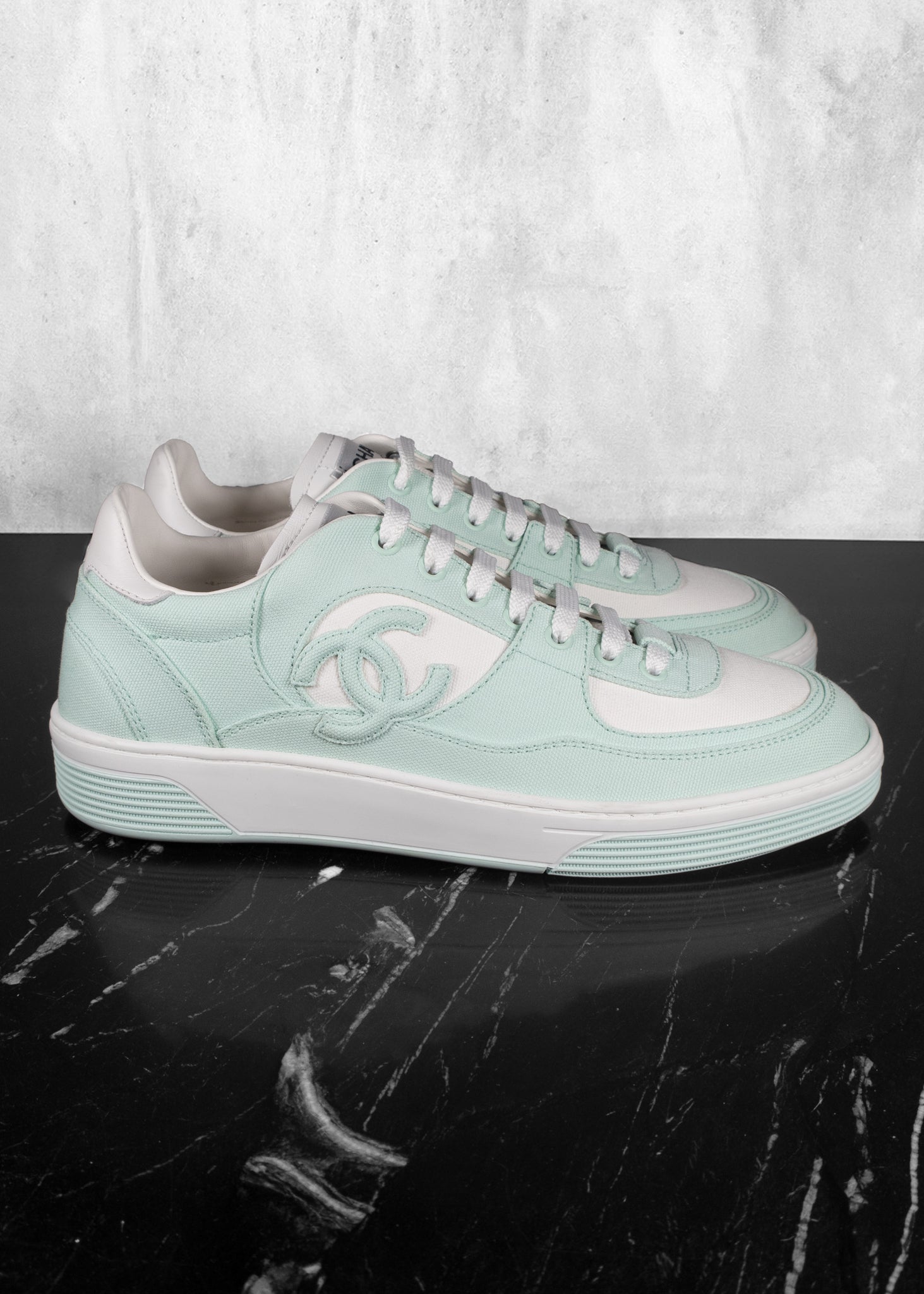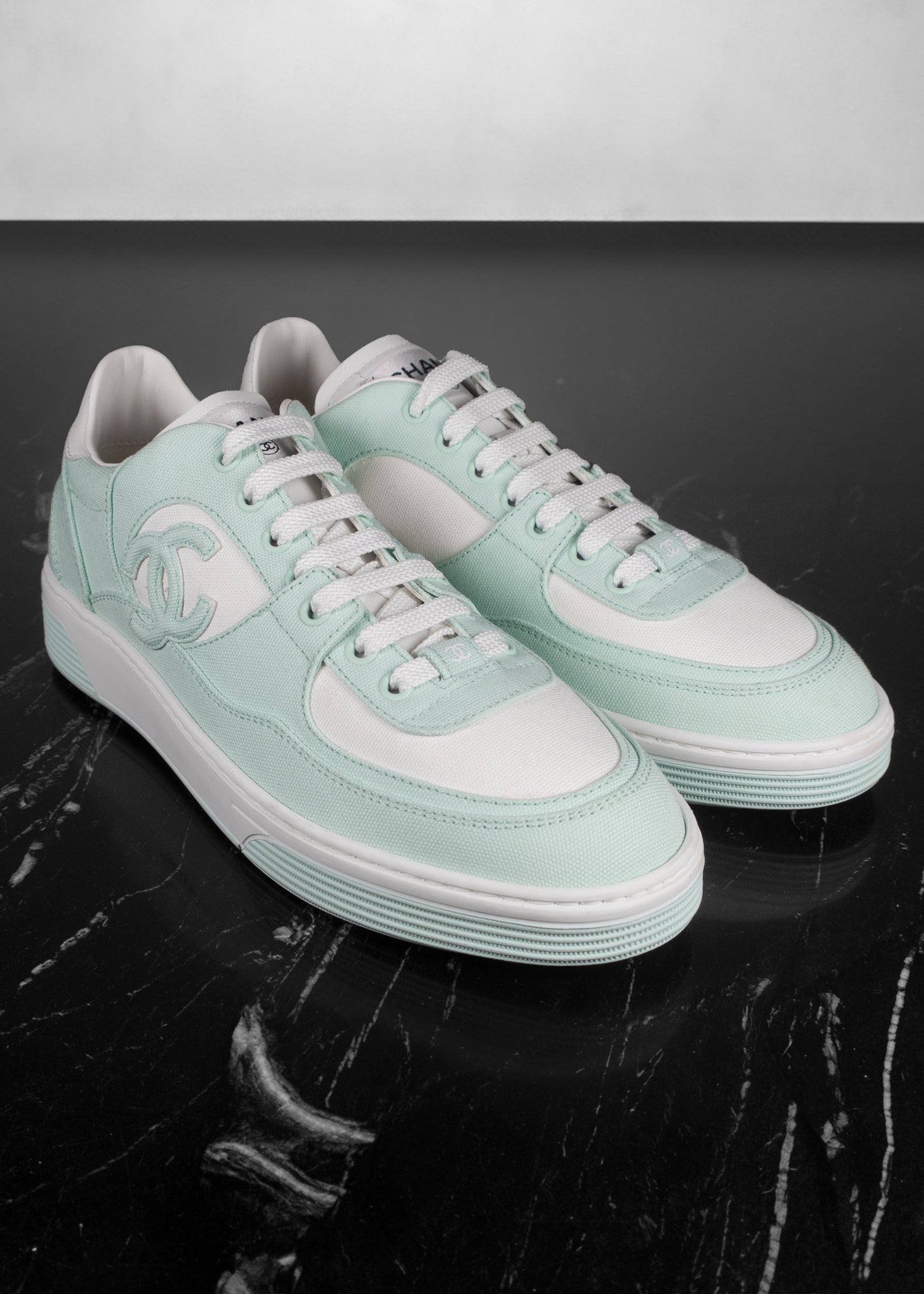 New with box! The Chanel Light Turquoise White Cotton Sneakers are a stylish and comfortable choice for casual wear. These sneakers feature a light turquoise upper crafted from high-quality cotton and a fresh and airy look. The white accents, including the laces and rubber sole, provide a clean contrast, highlighting the sleek design. The iconic Chanel logo is subtly placed, adding a touch of luxury to the overall sporty aesthetic. Perfect for a relaxed yet chic outfit, these sneakers are versatile and effortlessly fashionable.