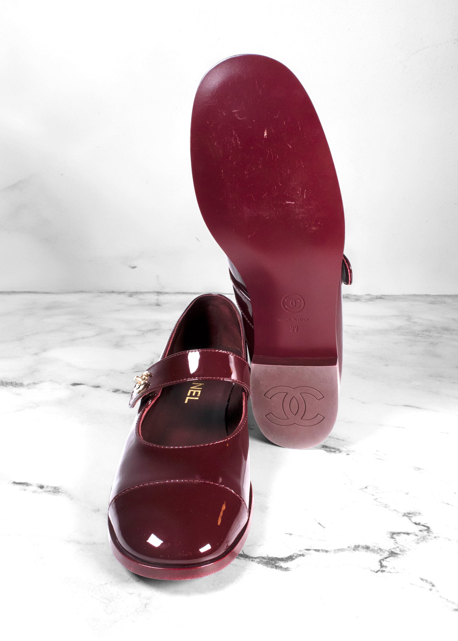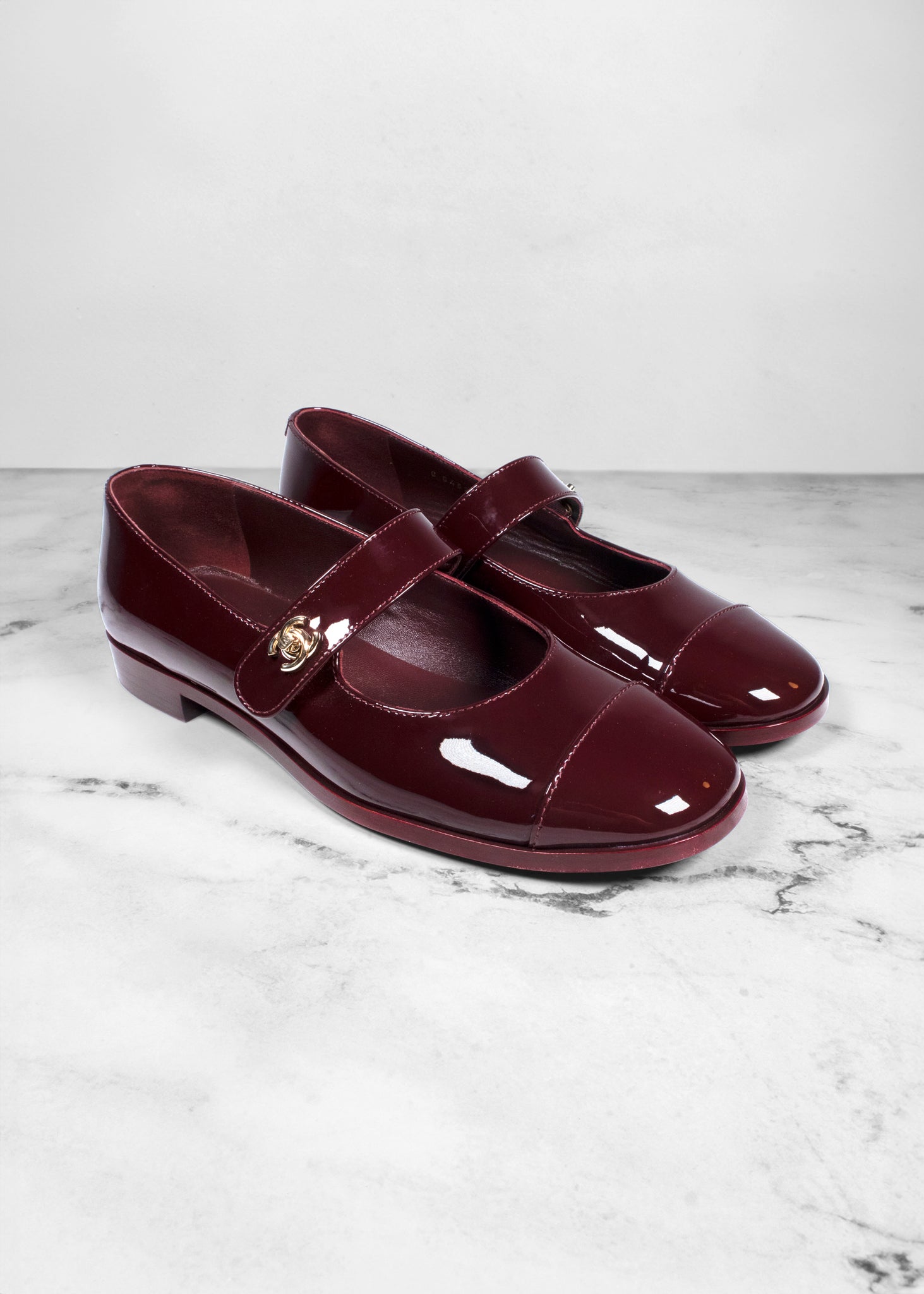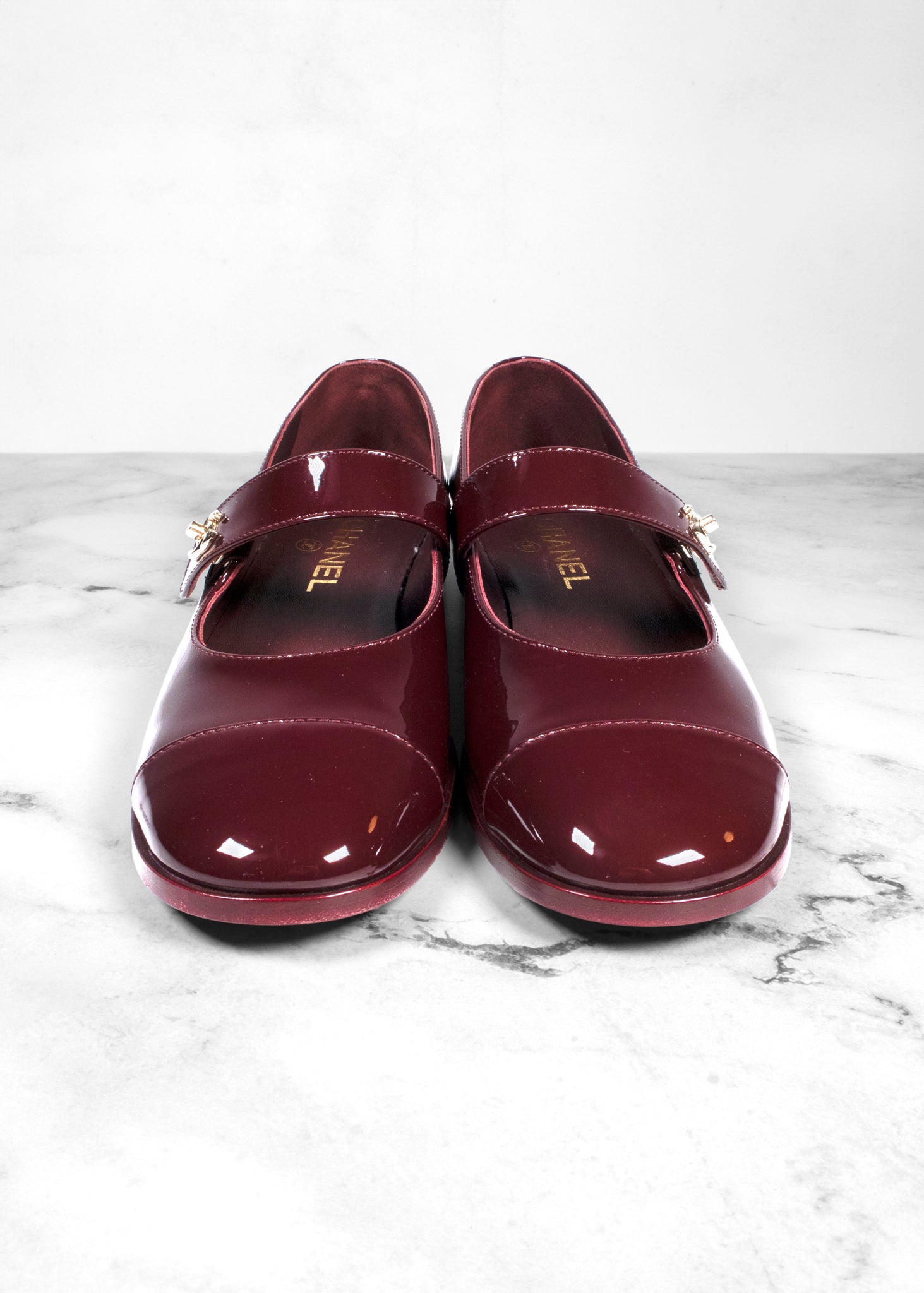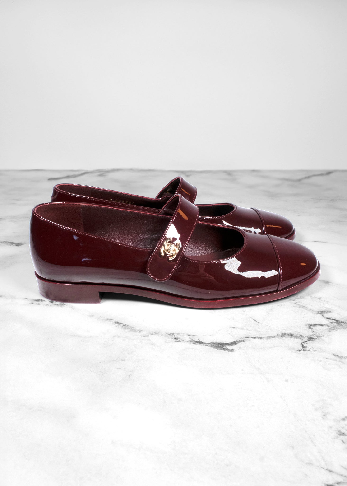 These Chanel Patent Calfskin Mary Janes Flats offer a sleek, elegant design crafted from high-quality patent calfskin leather. The classic Mary Jane silhouette is elevated with the signature Chanel logo on the strap, adding a touch of luxury. With their comfortable flat sole and timeless style, these shoes are perfect for adding sophistication to both casual and formal outfits.