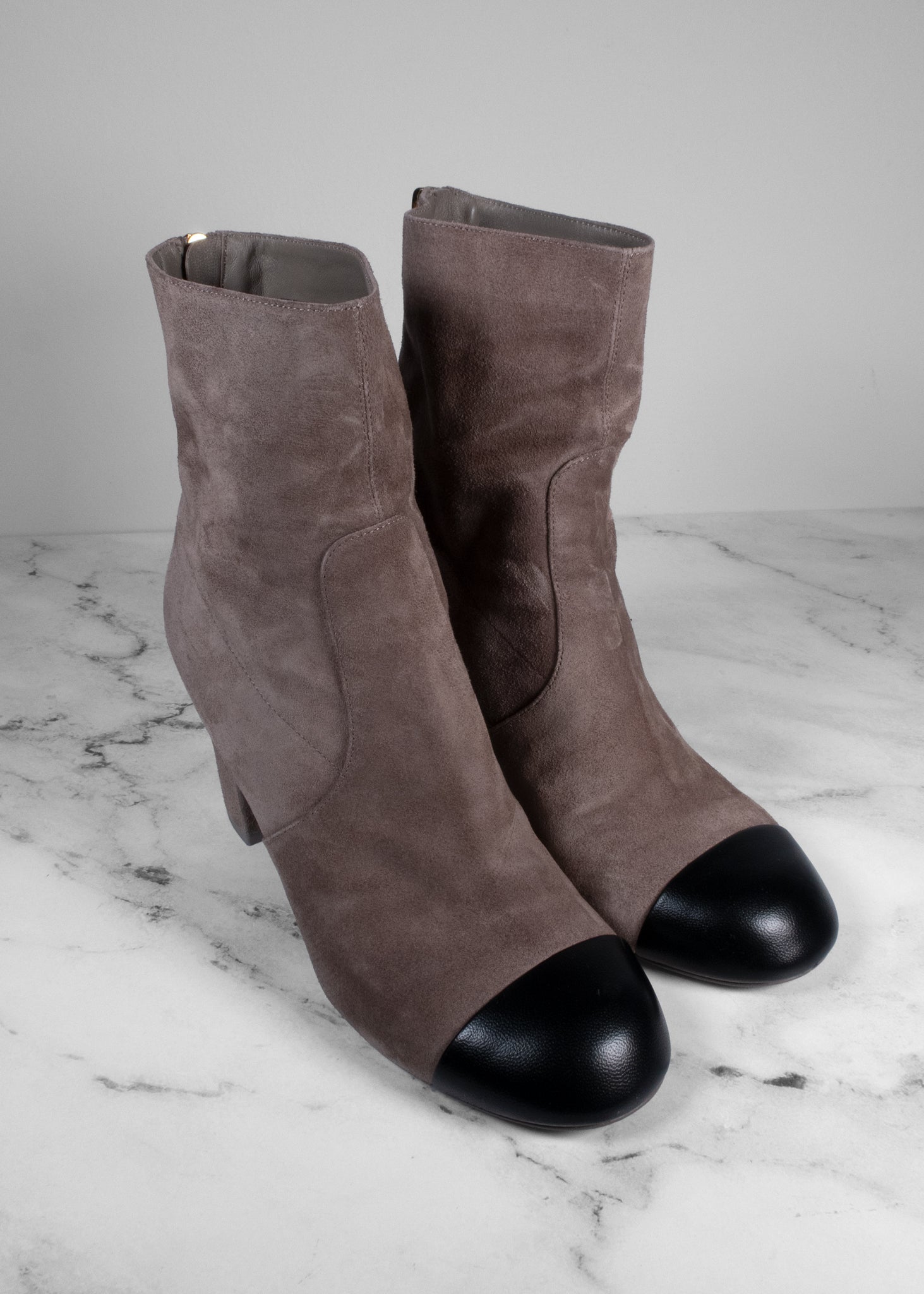 The Chanel Suede Calfskin Satin Gabrielle Cap Toe Short Boots combine sophisticated craftsmanship with a contemporary twist. Made from soft suede calfskin, these boots feature a sleek taupe hue that complements the luxurious satin finish at the toe, giving them a refined and modern appearance. The black leather cap toe adds a bold contrast, creating a chic, structured silhouette. Designed with a slim heel, these boots offer both elegance and comfort, making them perfect for both day and evening wear. The streamlined shape and minimalist design make them versatile for a variety of occasions, while the iconic Chanel craftsmanship ensures timeless appeal. A true statement piece, these boots elevate any ensemble with their perfect balance of modern style and classic luxury.