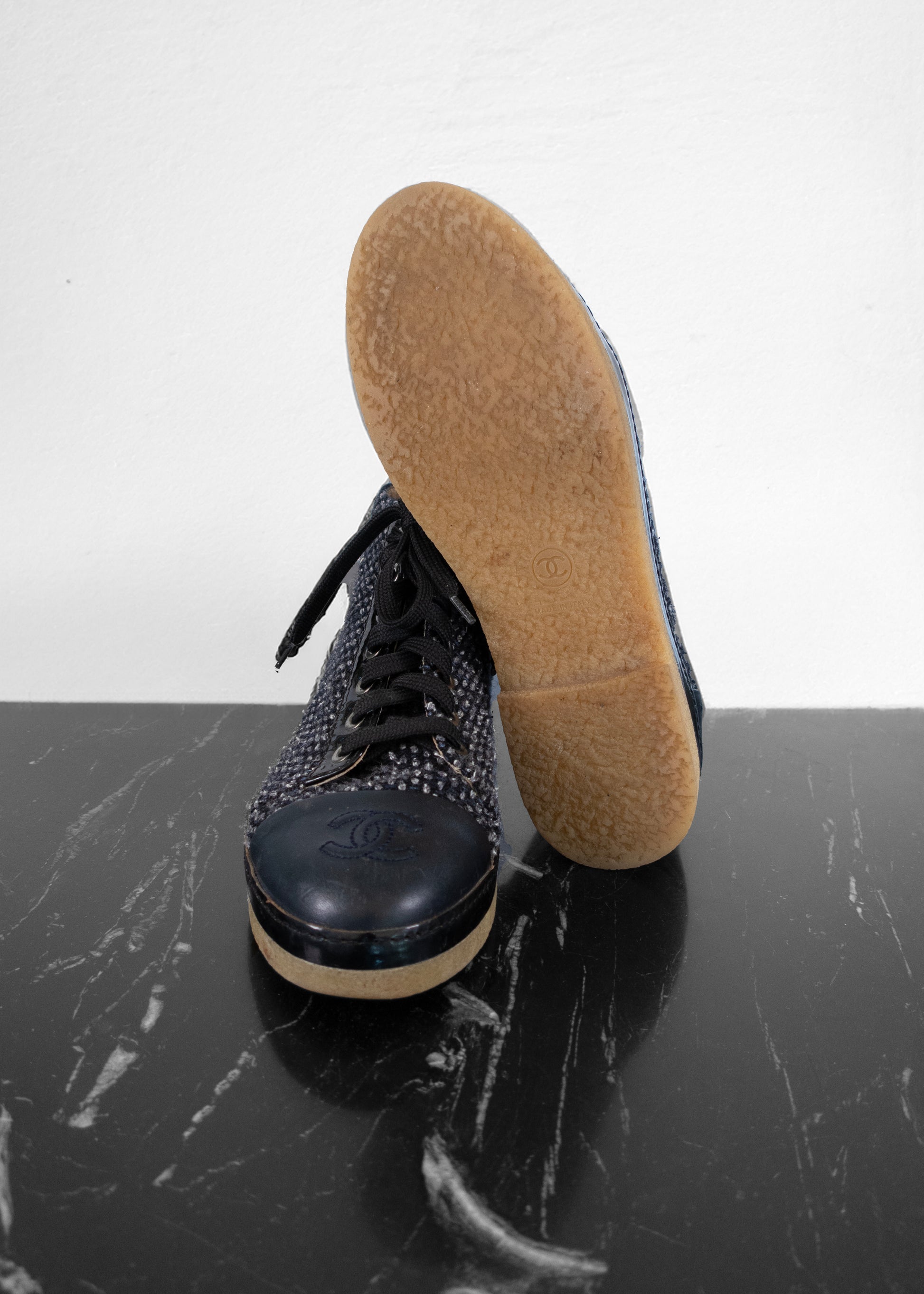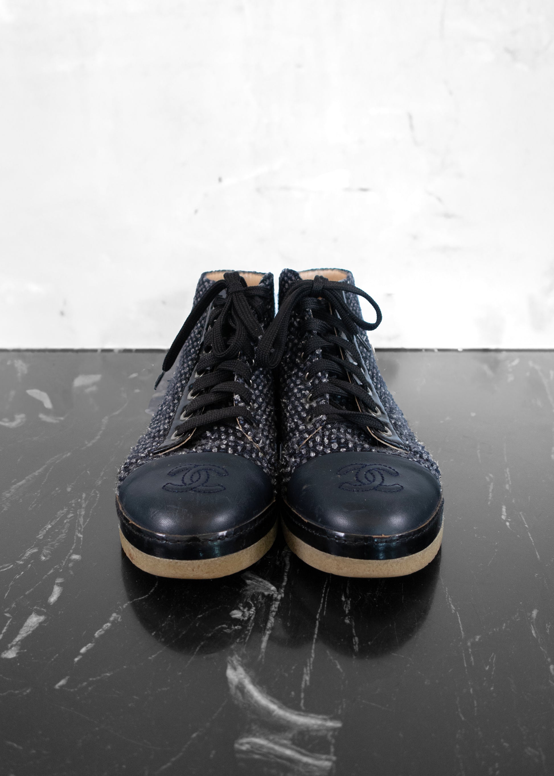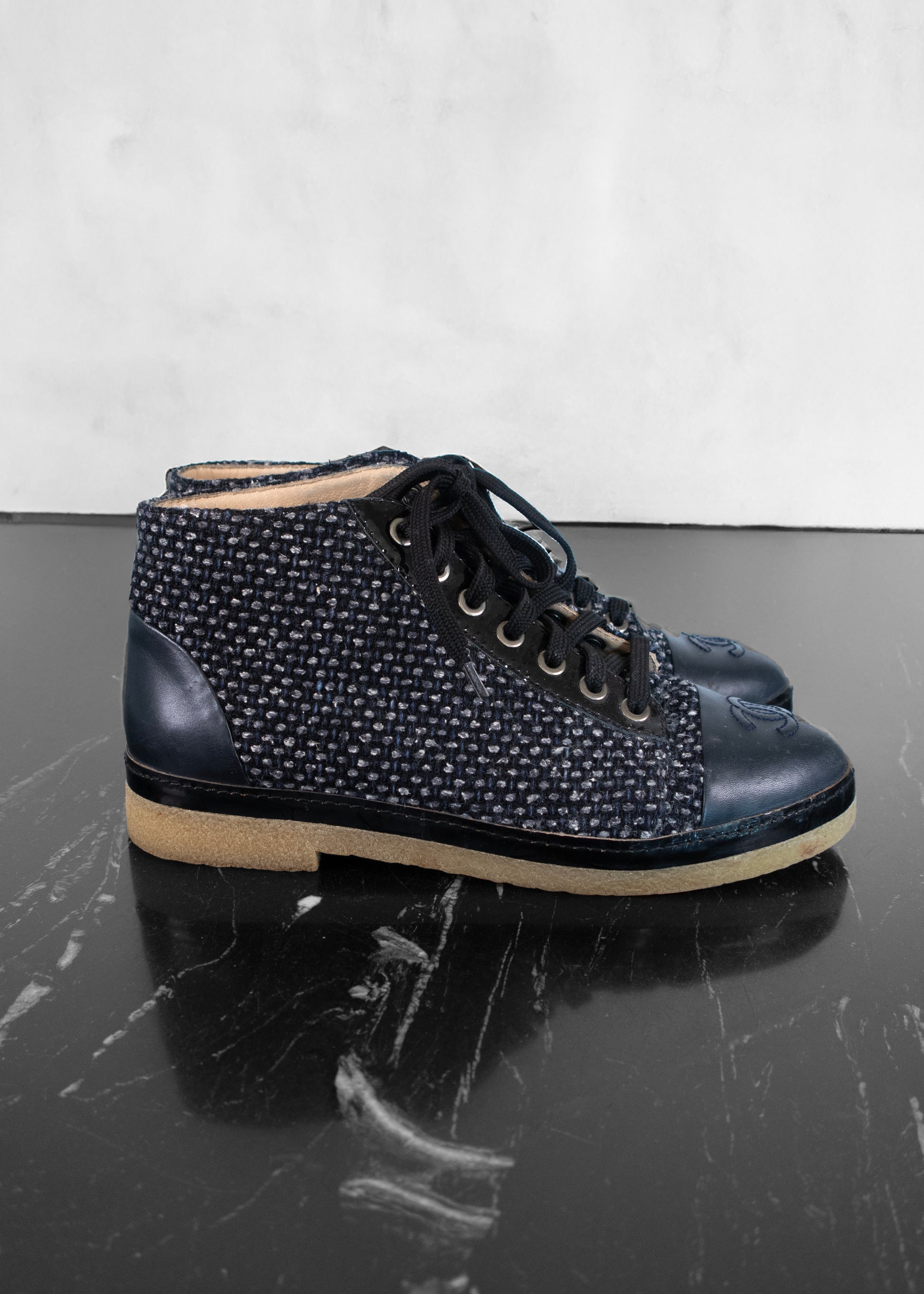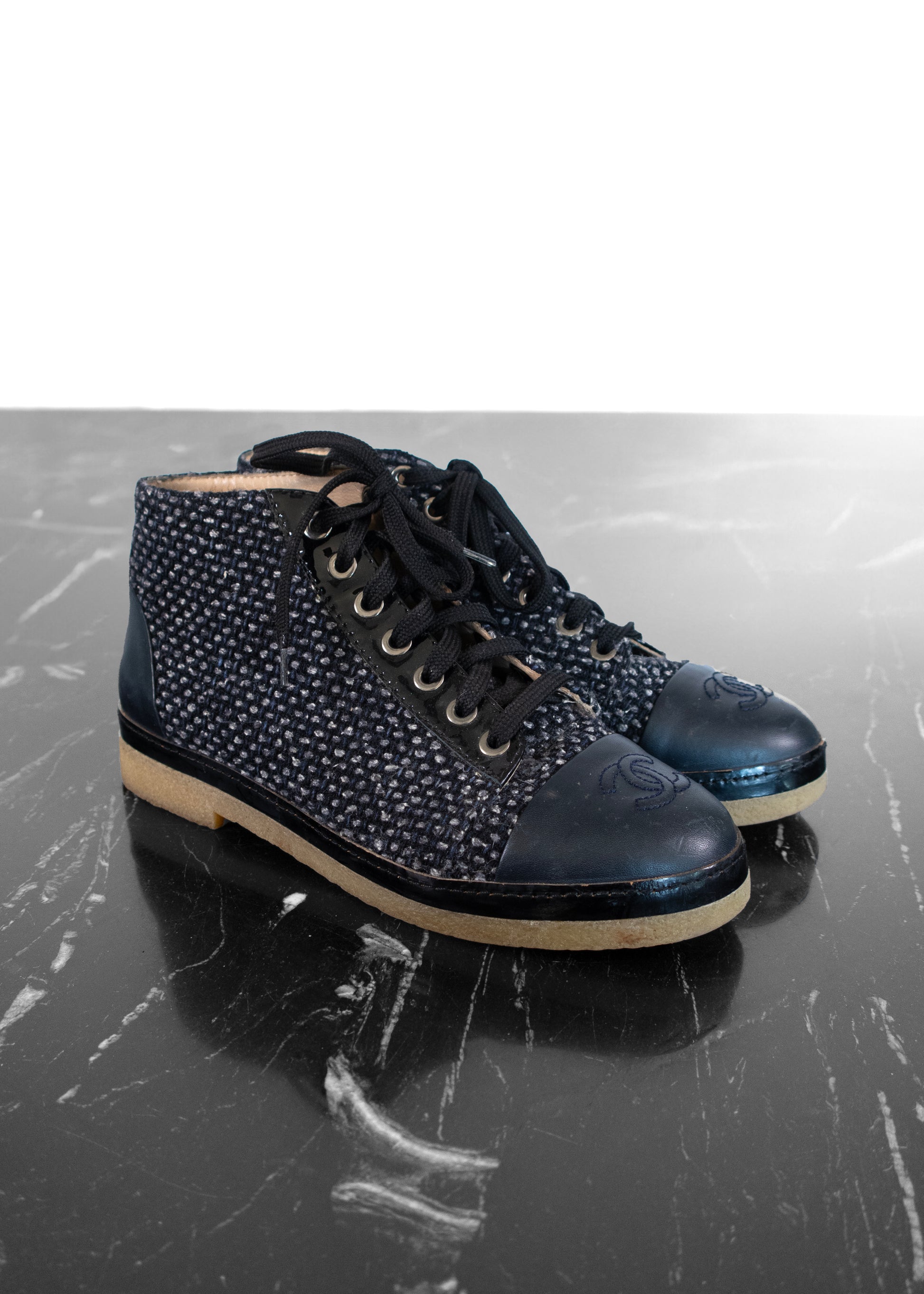 Chanel Tweed Calfskin Patent CC Lace Up Short Boots