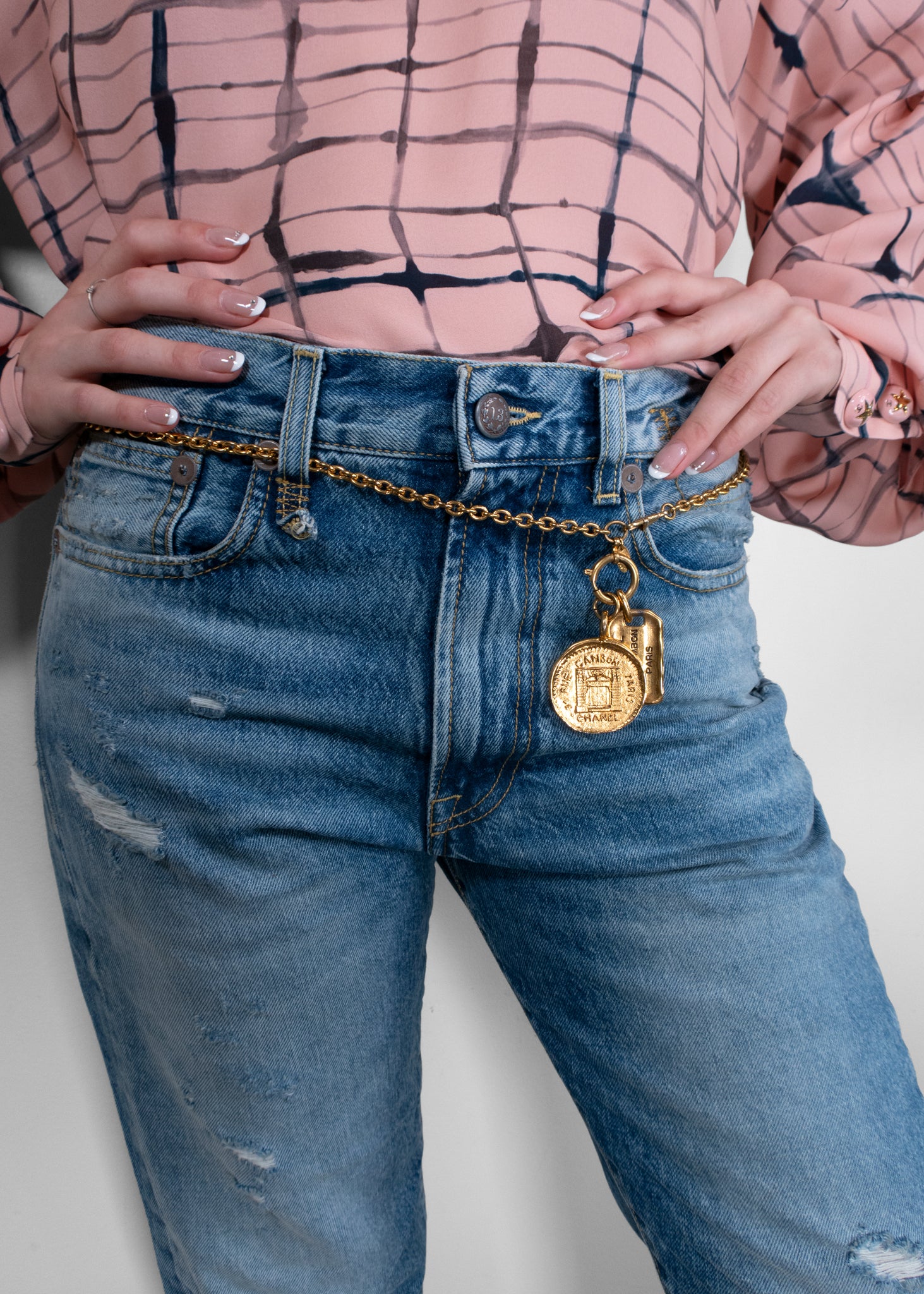 This Chanel Vintage Gold Medallion Chain doubles as both a statement necklace and a chic waist belt. Featuring a luxurious gold-tone rope chain and iconic Chanel-engraved medallion charms, it adds a timeless touch of glamour to any look. The versatile design allows it to be worn looped through belt loops for a cinched waist or draped over the shoulders as a bold accessory. Whether styled with jeans or layered over a dress, this piece is a standout embodiment of classic Chanel elegance with vintage allure.