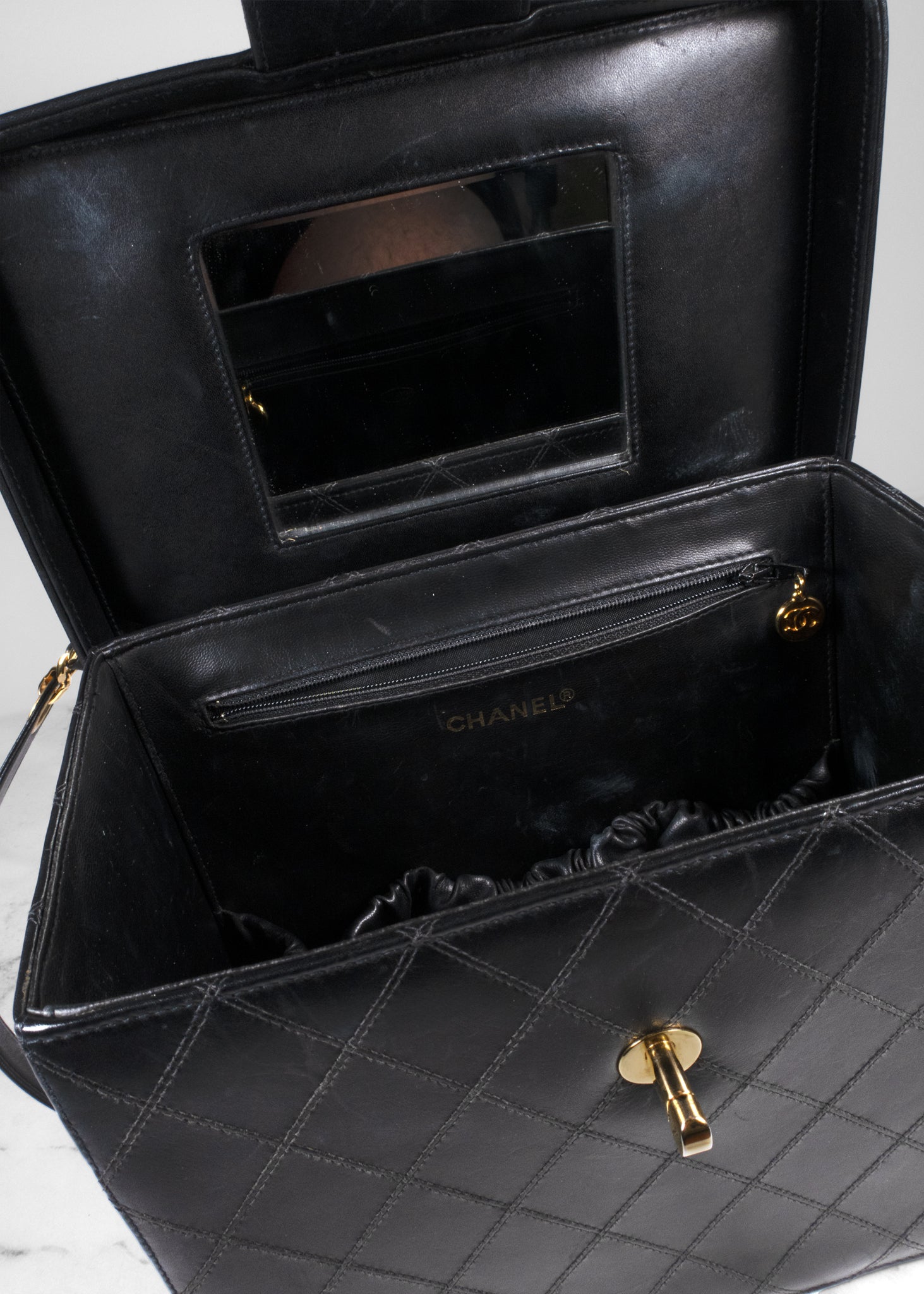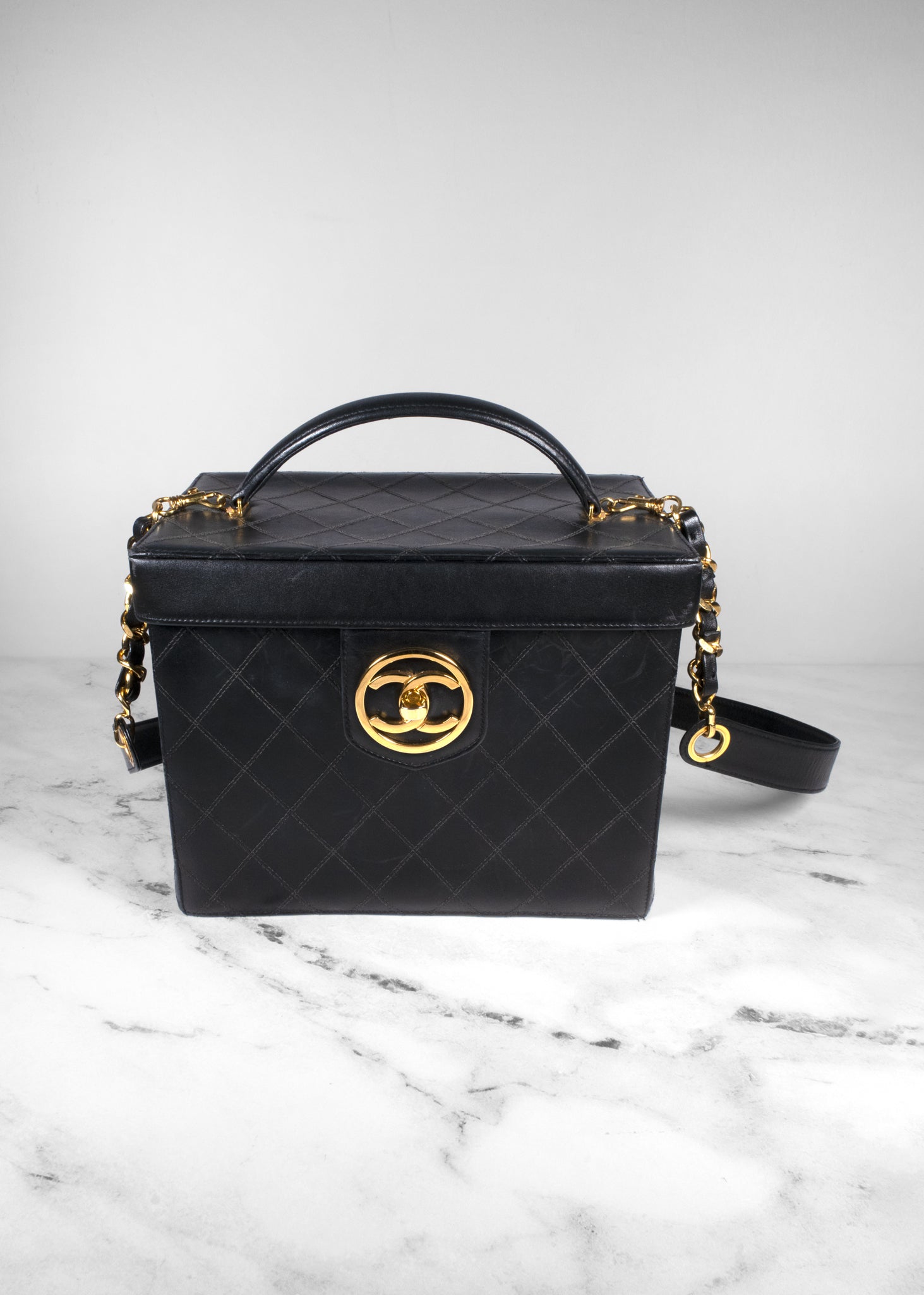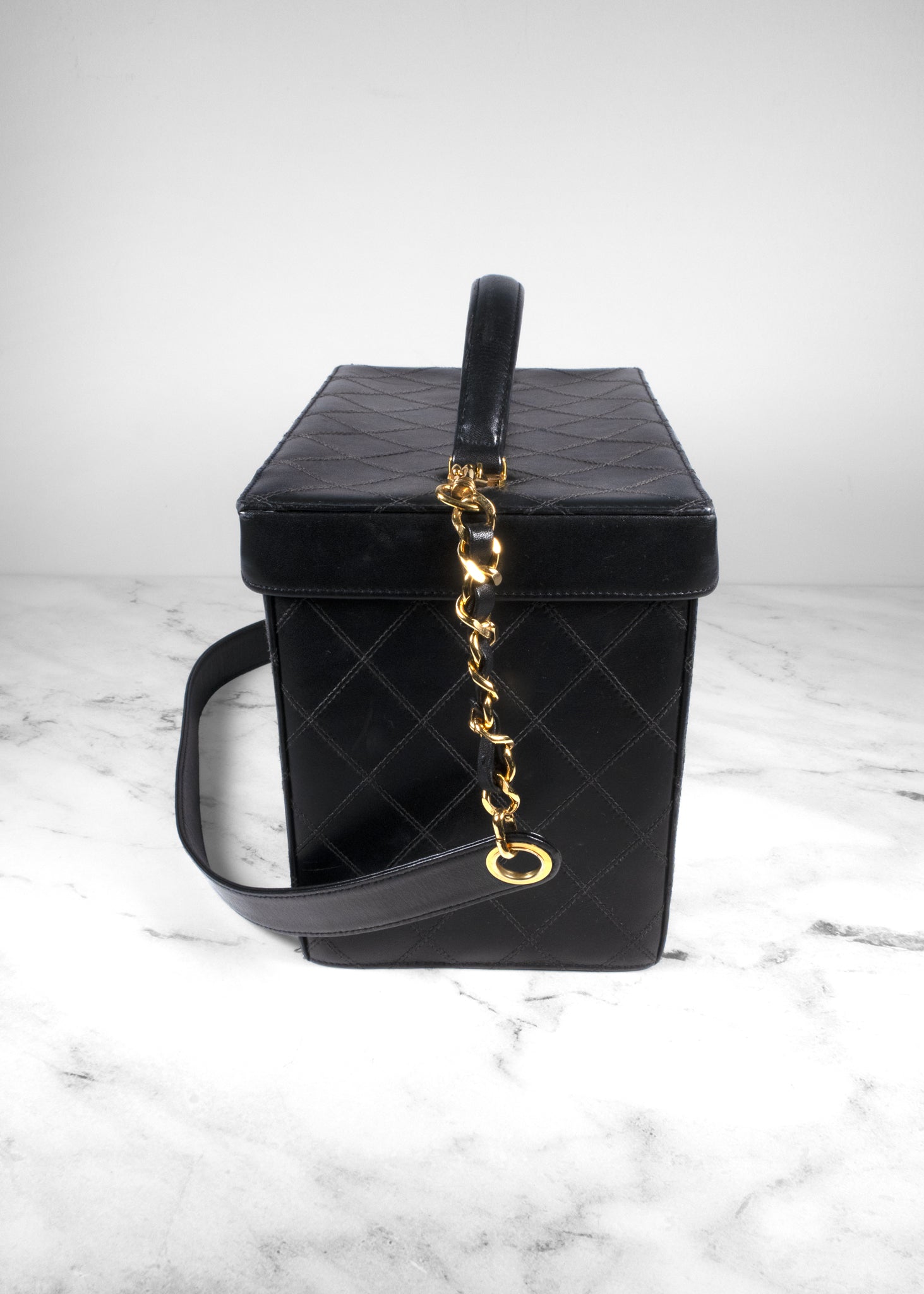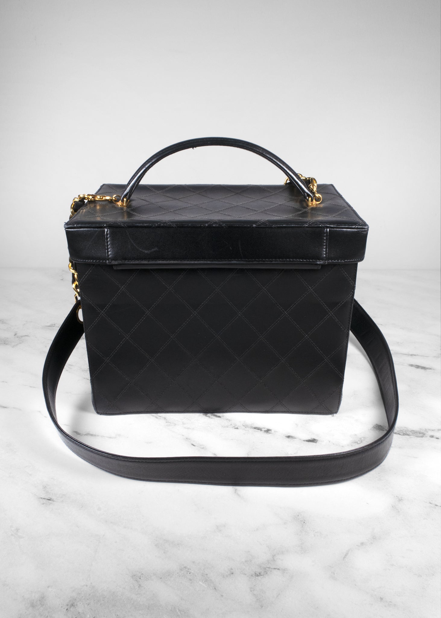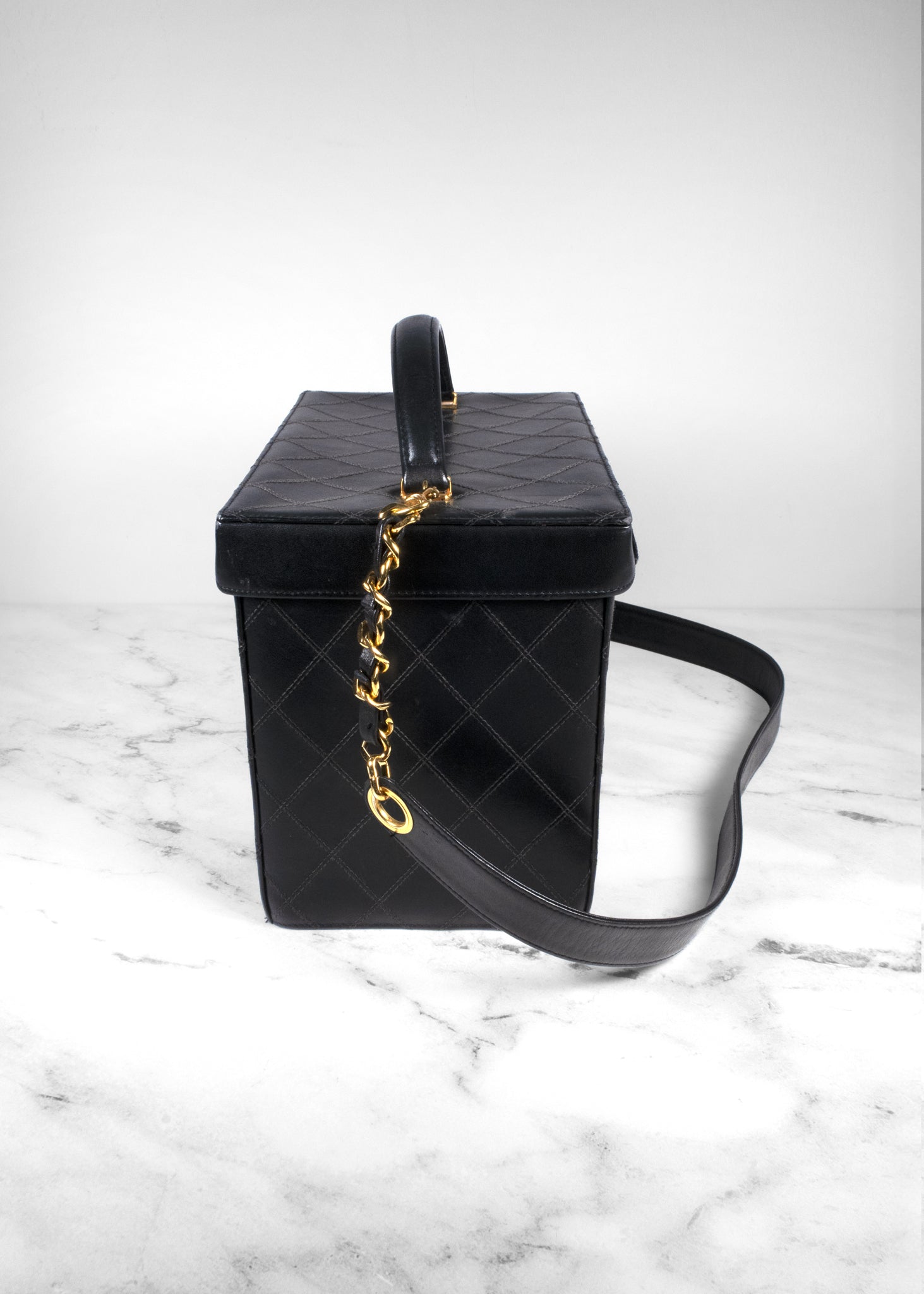 This 1990’s Chanel Vintage Quilted Vanity bag is a luxurious and practical accessory. Crafted from black leather, the quilted pattern adds texture and sophistication, while the signature gold-plates CC clasp brings a touch of elegance. The boxy structure offers ample space to store your beauty essentials or use it as a chic handbag for an evening out. The detachable chain strap adds versatility, allowing it to be worn on the shoulder or carried by hand. Perfect for both everyday use and special occasions, this iconic piece blends style and functionality seamlessly.