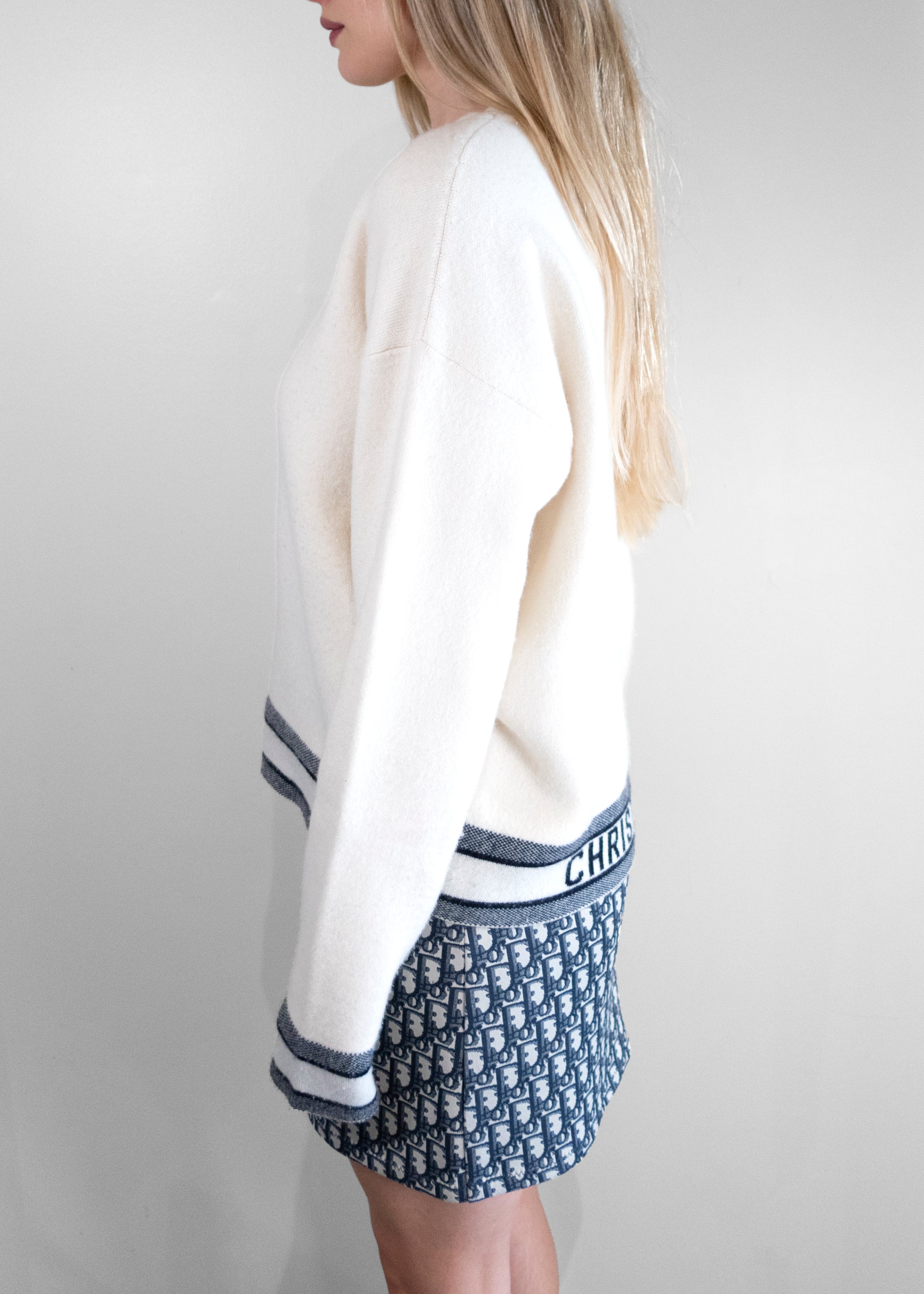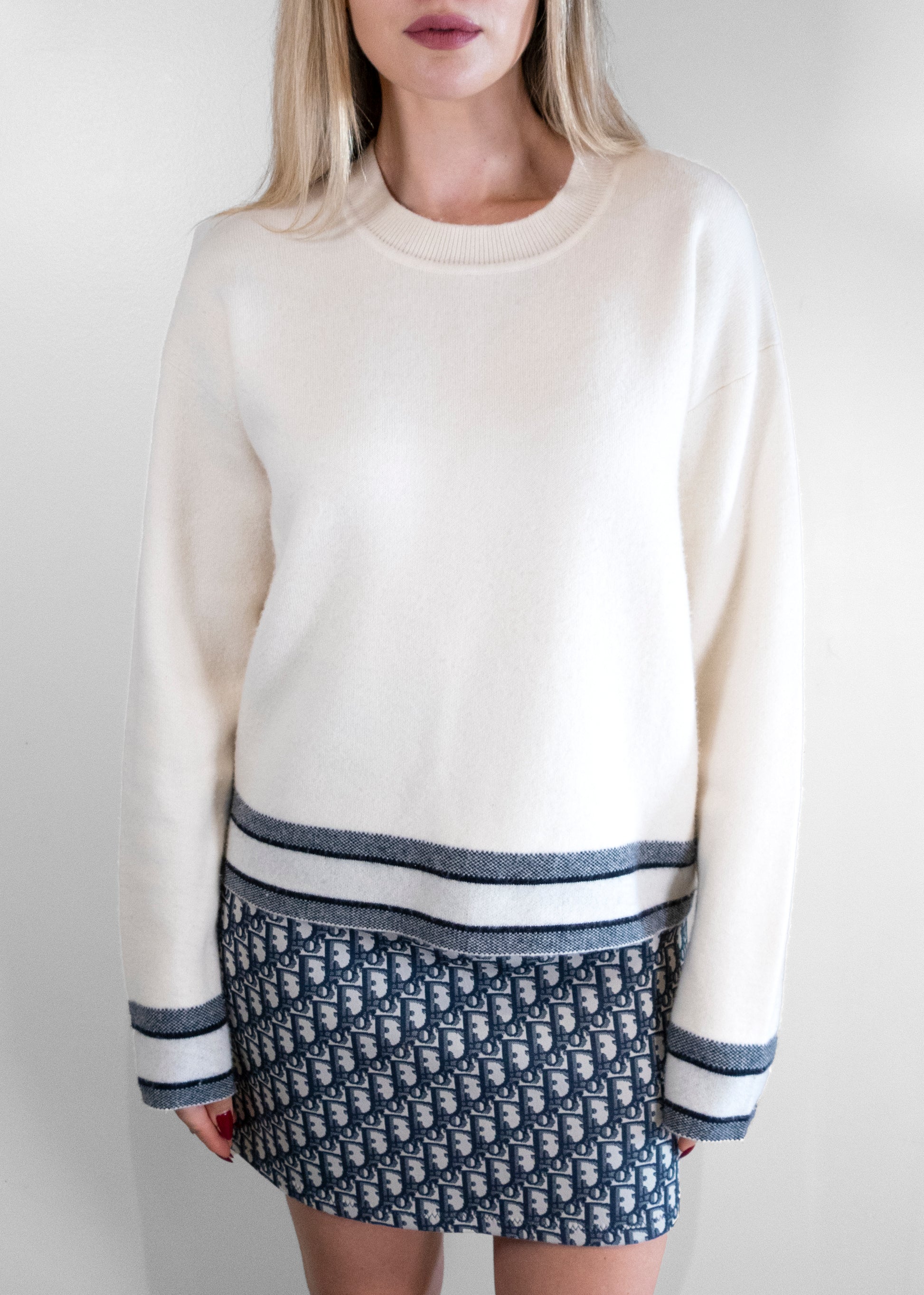 This Christian Dior Cashmere Striped Sweater exudes timeless luxury and elegance. Crafted from ultra-soft cashmere, it features a classic striped pattern that adds a touch of sophistication to any wardrobe. The relaxed fit and premium knit offer both comfort and style, making it a perfect choice for a chic, cozy look. Ideal for layering or wearing on its own, this sweater is a must-have for those who appreciate high-end fashion and refined design.