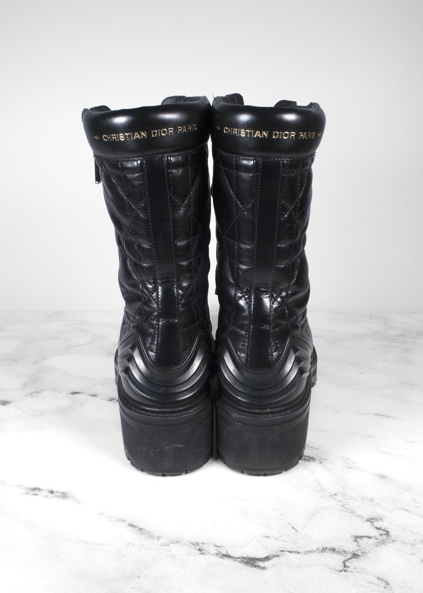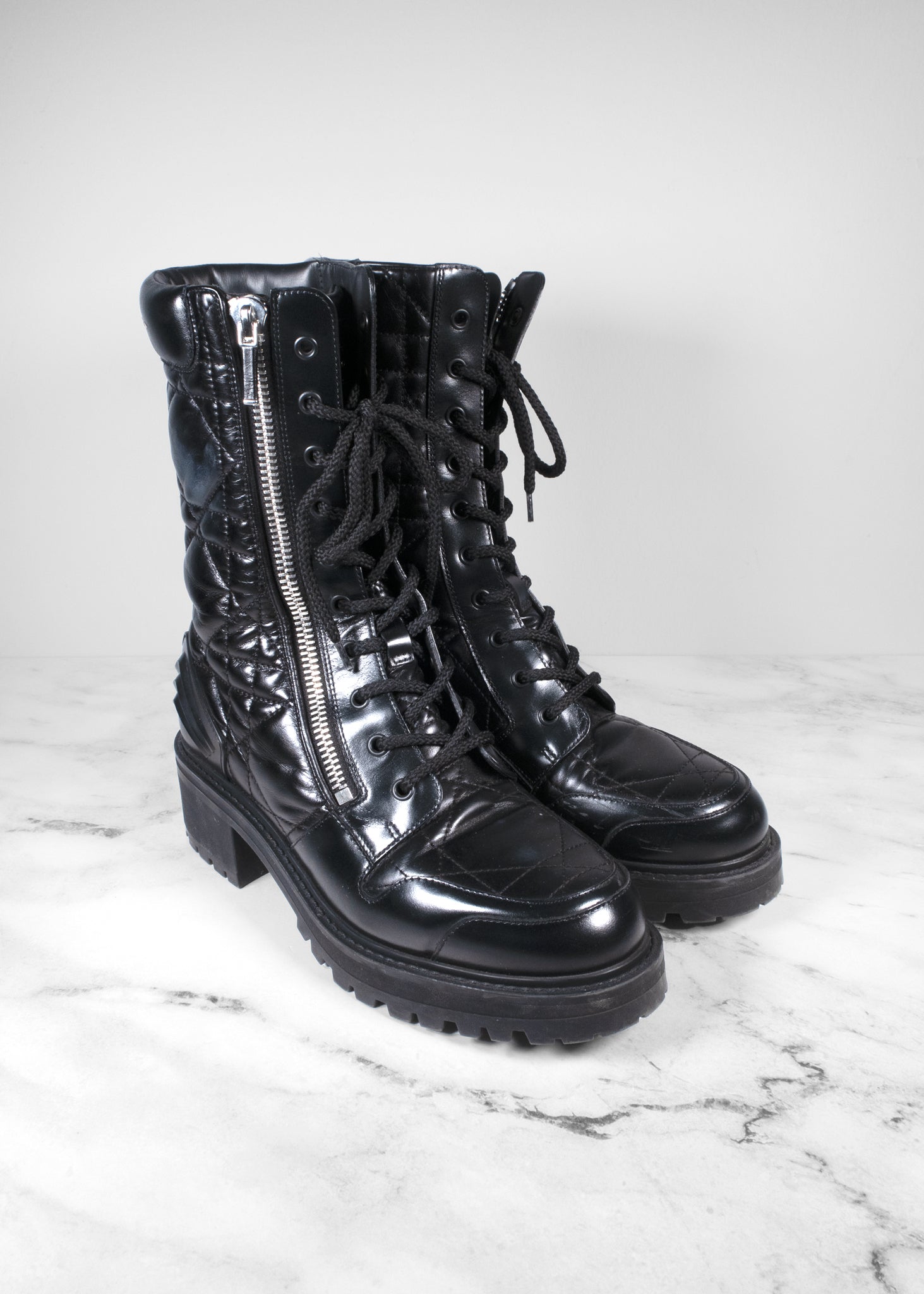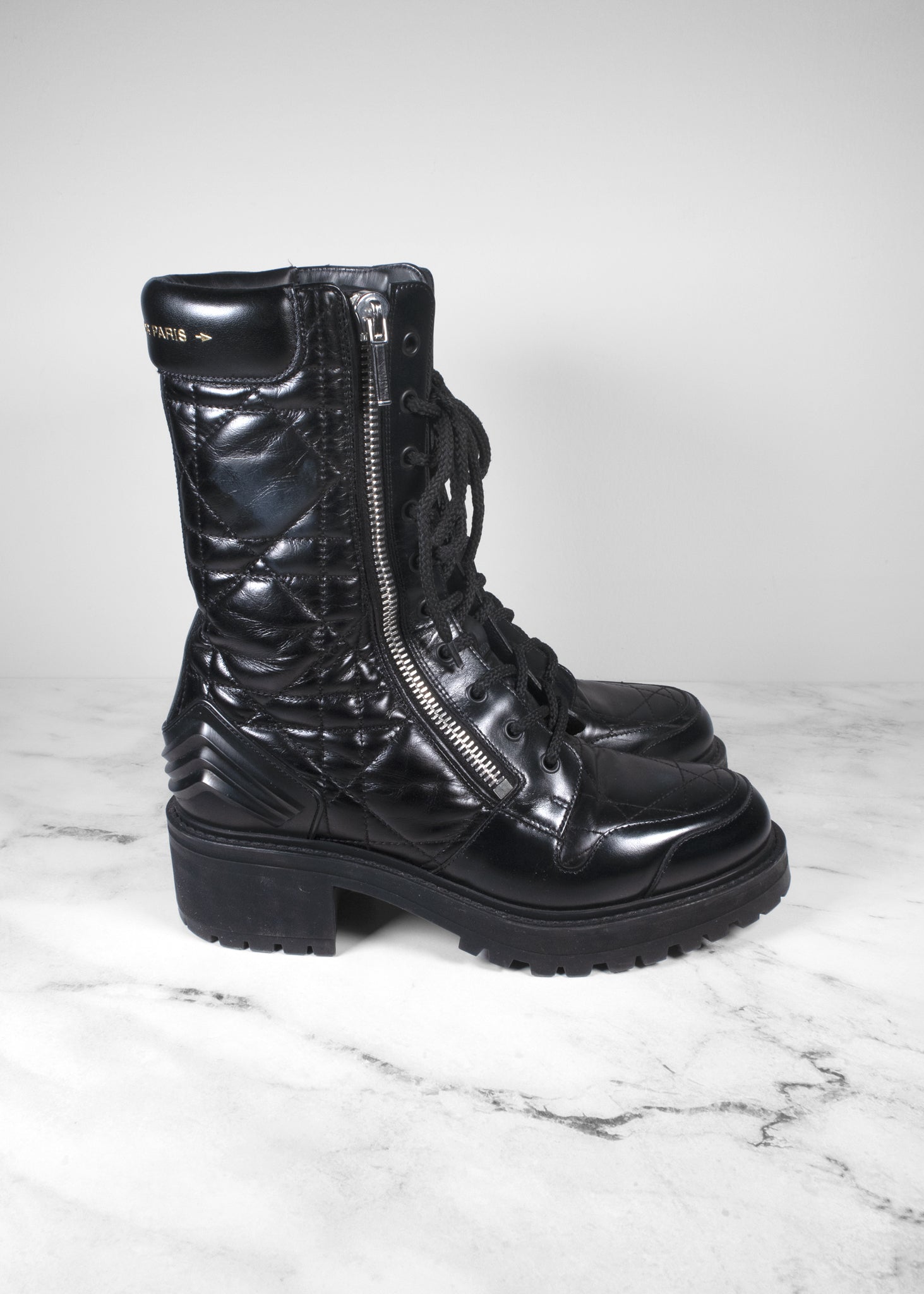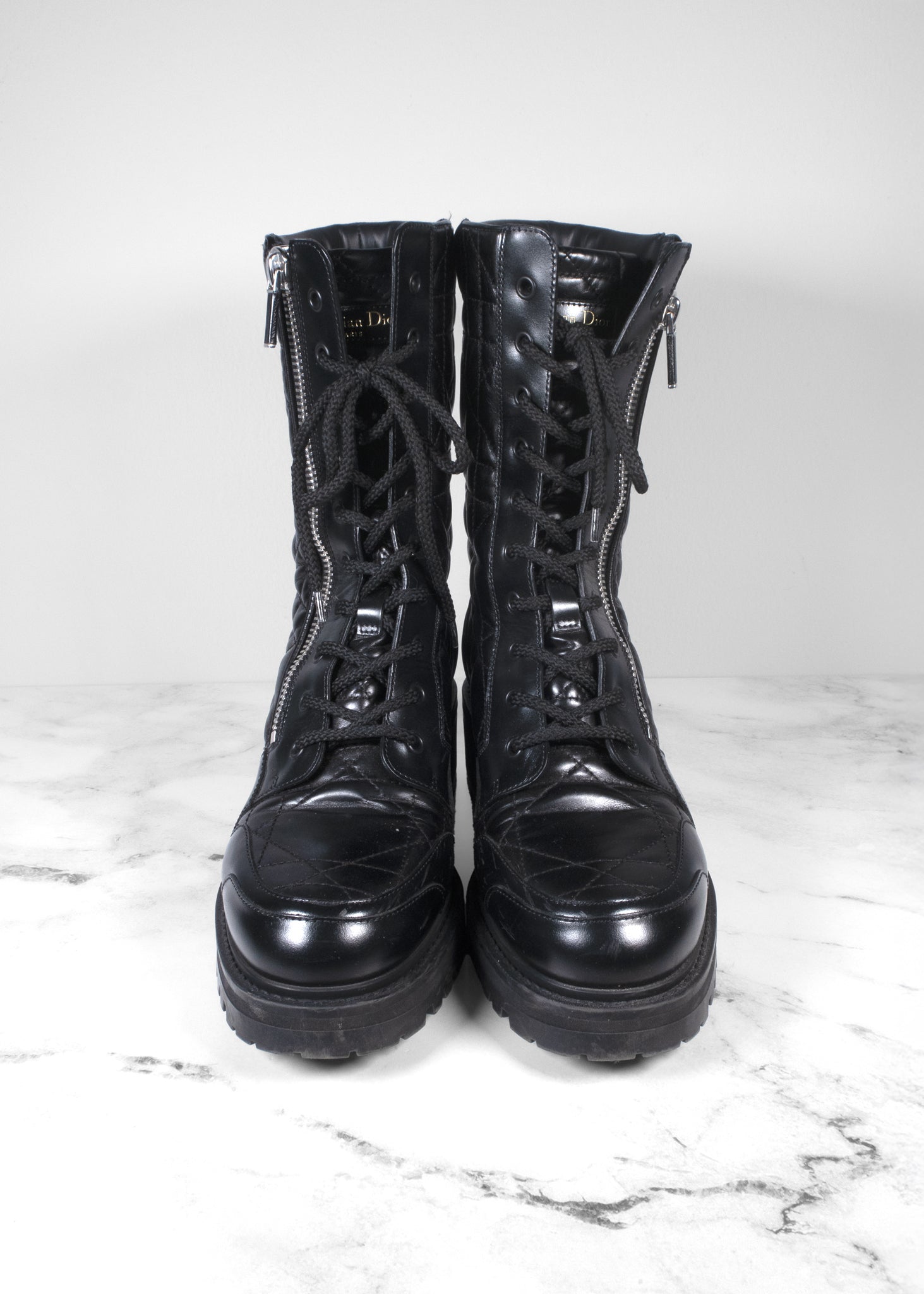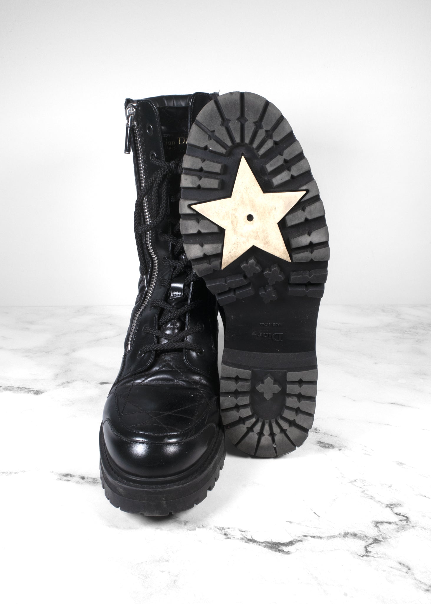 Christian Dior Leather Combat Boots combine rugged utility with sophisticated elegance. Crafted from premium leather, these boots feature a durable lace-up design, a sturdy rubber sole, and signature Dior detailing for a touch of luxury. Perfect for making a bold statement while ensuring comfort and functionality.