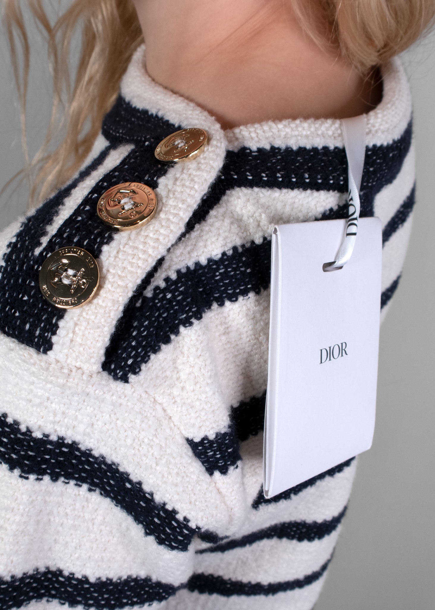 This Christian Dior Striped Mini Dress is a timeless nod to nautical chic, reimagined in luxurious bouclé knit. Featuring classic navy and ivory horizontal stripes, this structured mini dress includes short sleeves, a crew neckline, and signature gold-tone Dior-engraved buttons at the shoulder. The back hemline subtly showcases the Christian Dior logo, adding a bold designer finish. Perfect for springtime outings or coastal escapes, the textured knit offers a refined silhouette that balances Parisian polish with casual ease.