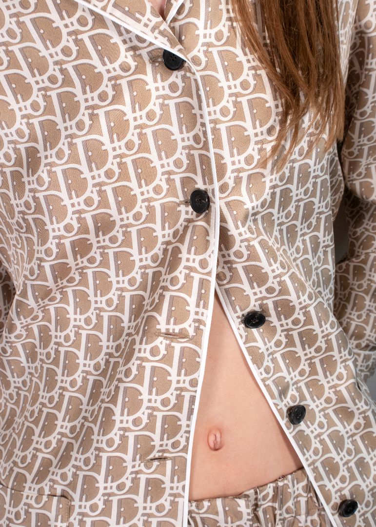 Elevate your sleepwear collection with this sophisticated Christian Dior pants and blouse set, featuring the iconic monogram print in refined taupe and white tones. The button-up shirt offers timeless elegance with a structured fit, while the coordinating pants provide comfort for restful nights. Crafted with the luxury and attention to detail Dior is renowned for, this size 4 set combines designer heritage with everyday wearability.