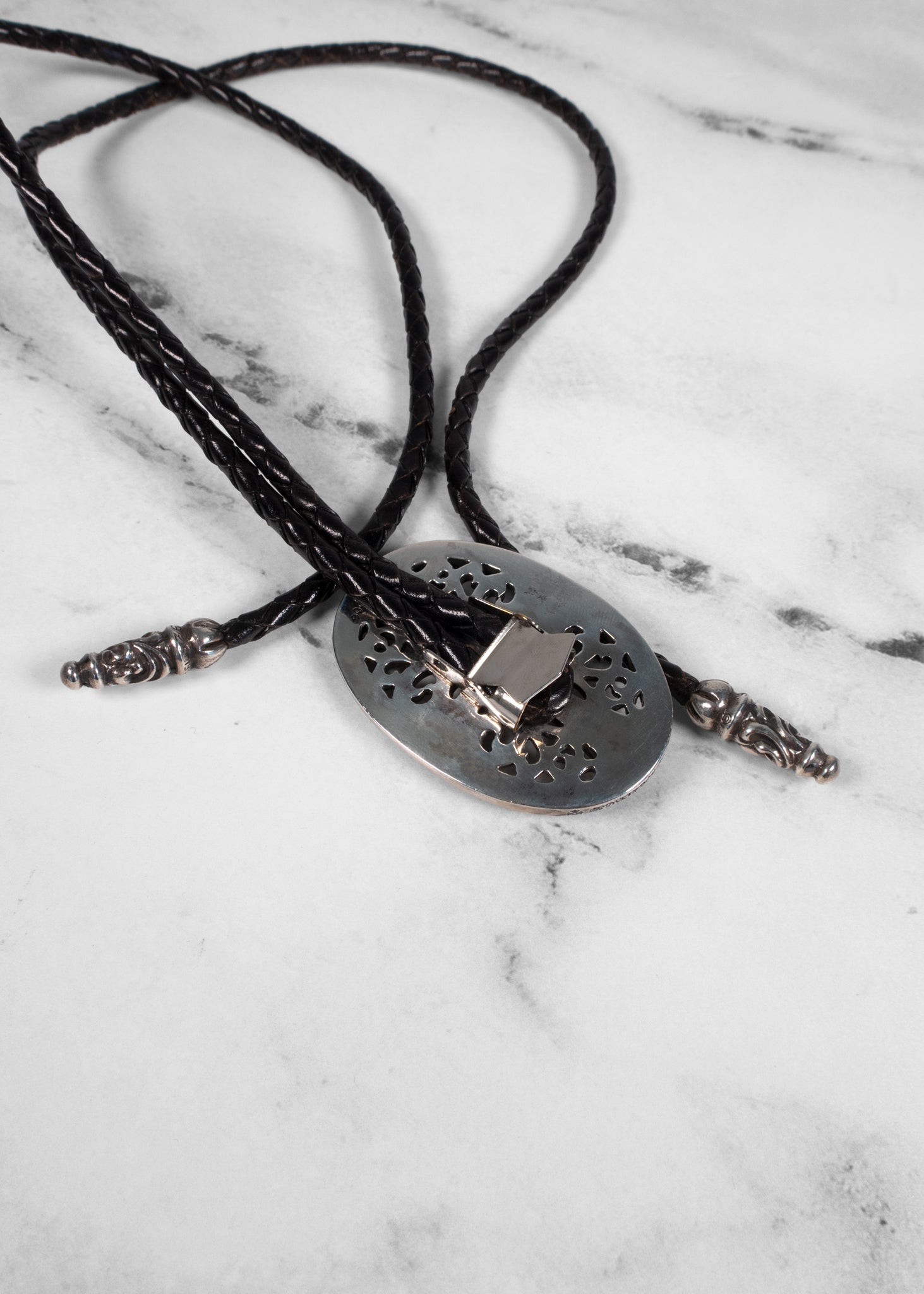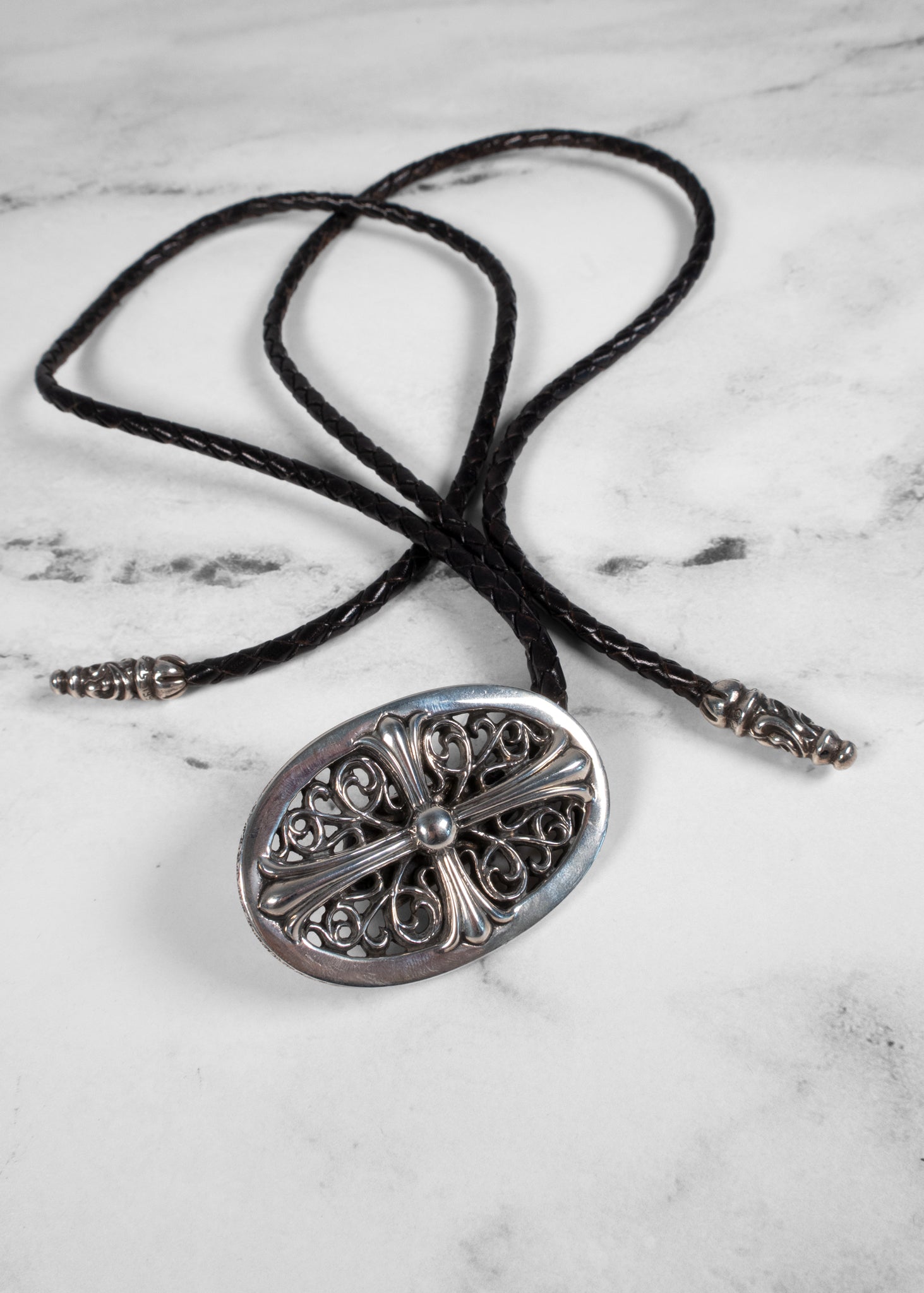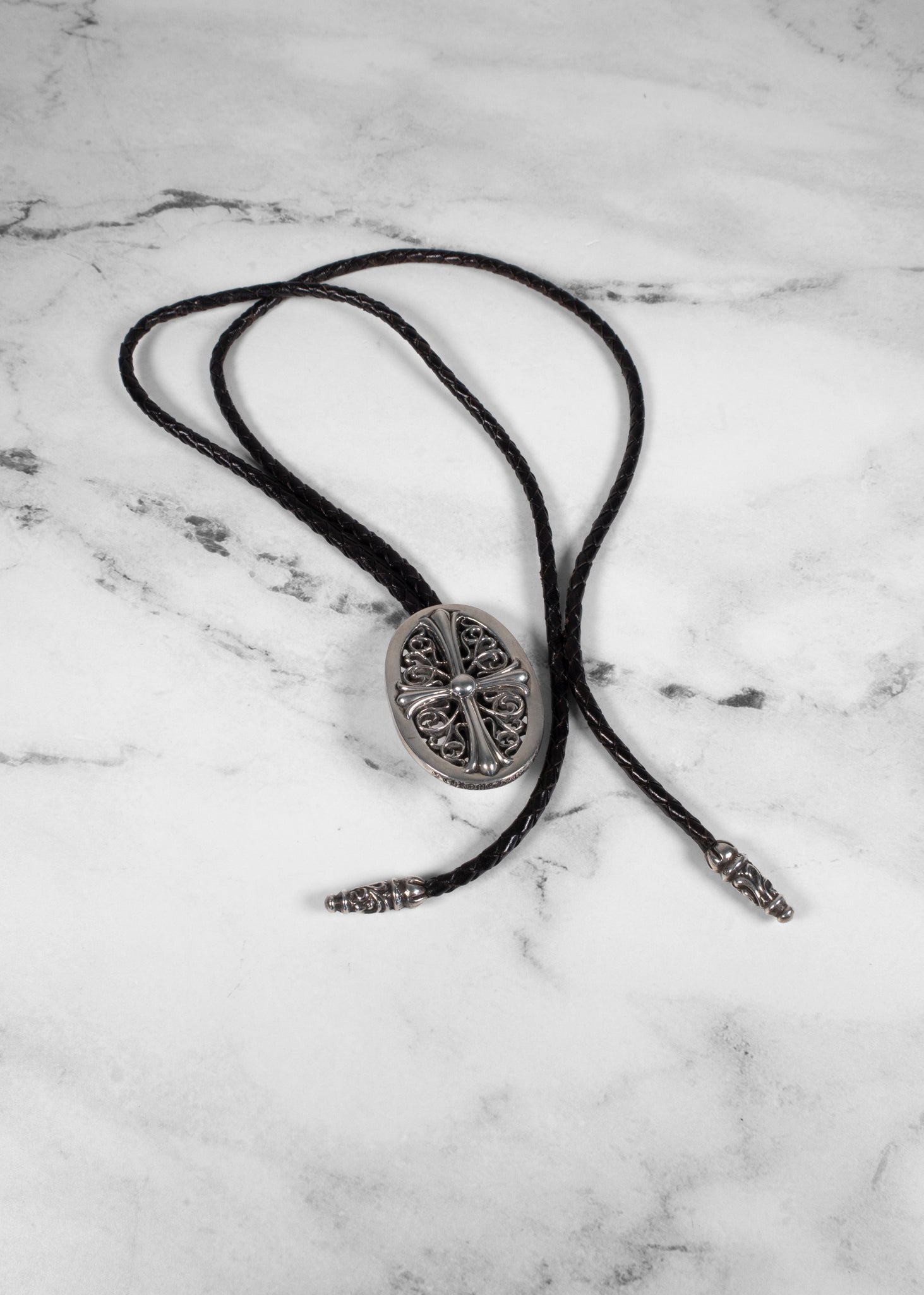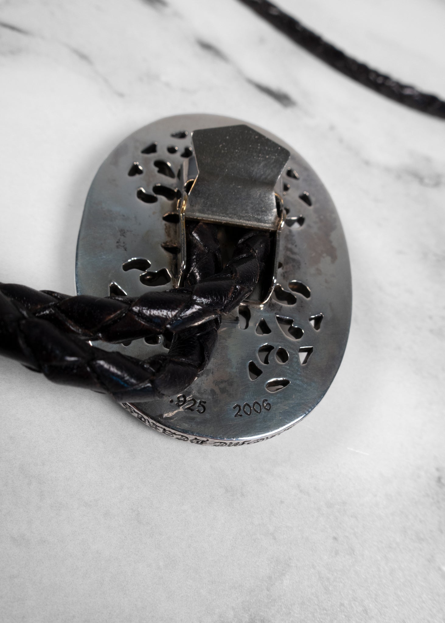 Featuring a detailed gothic cross set in an ornate oval sterling silver slide, this bolo tie fuses Western flair with Chrome Hearts’ signature edge. Braided leather cords with sculpted silver tips complete the bold silhouette. Stamped with .925 and dated 2006, it’s a rare statement piece with vintage soul.