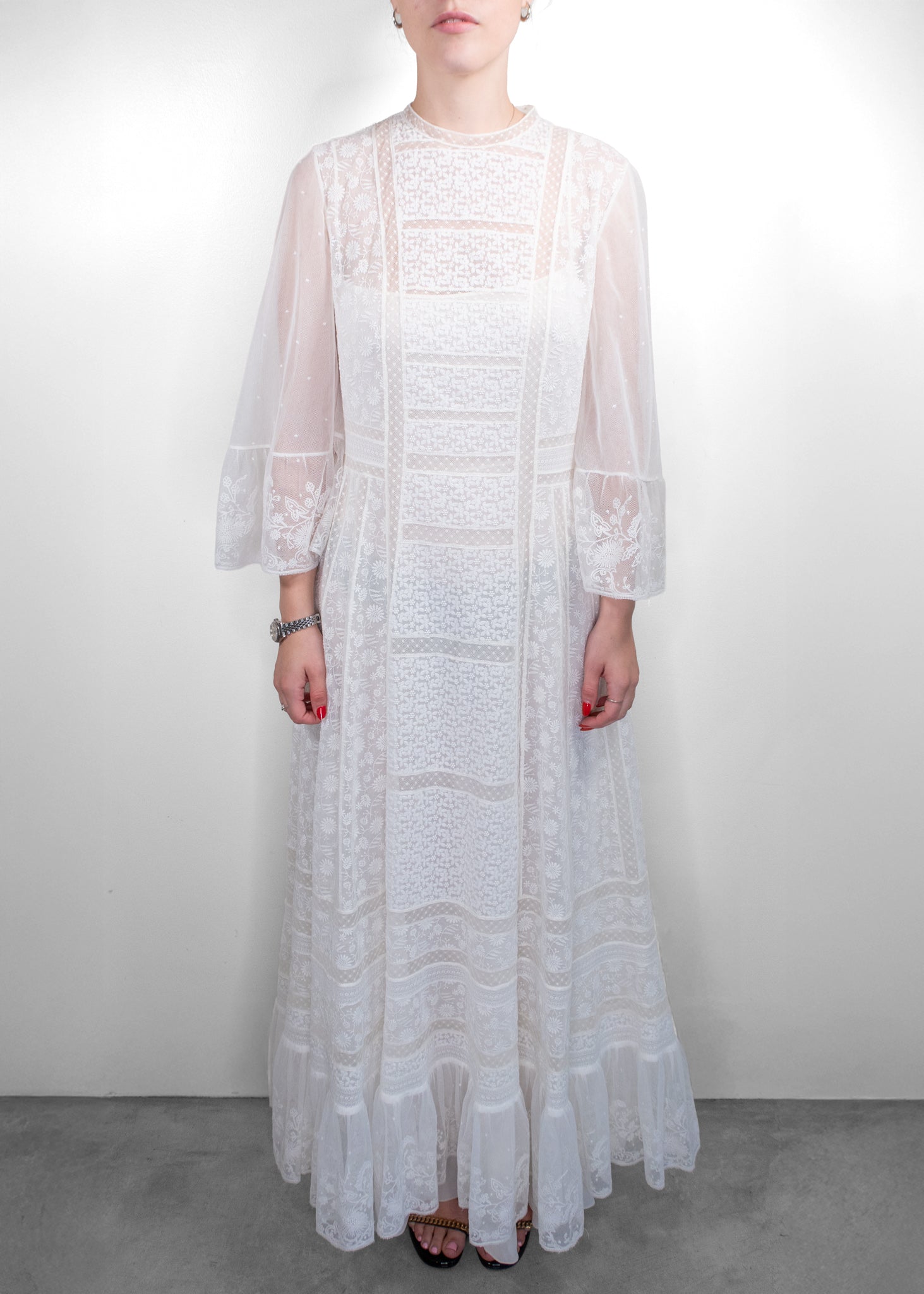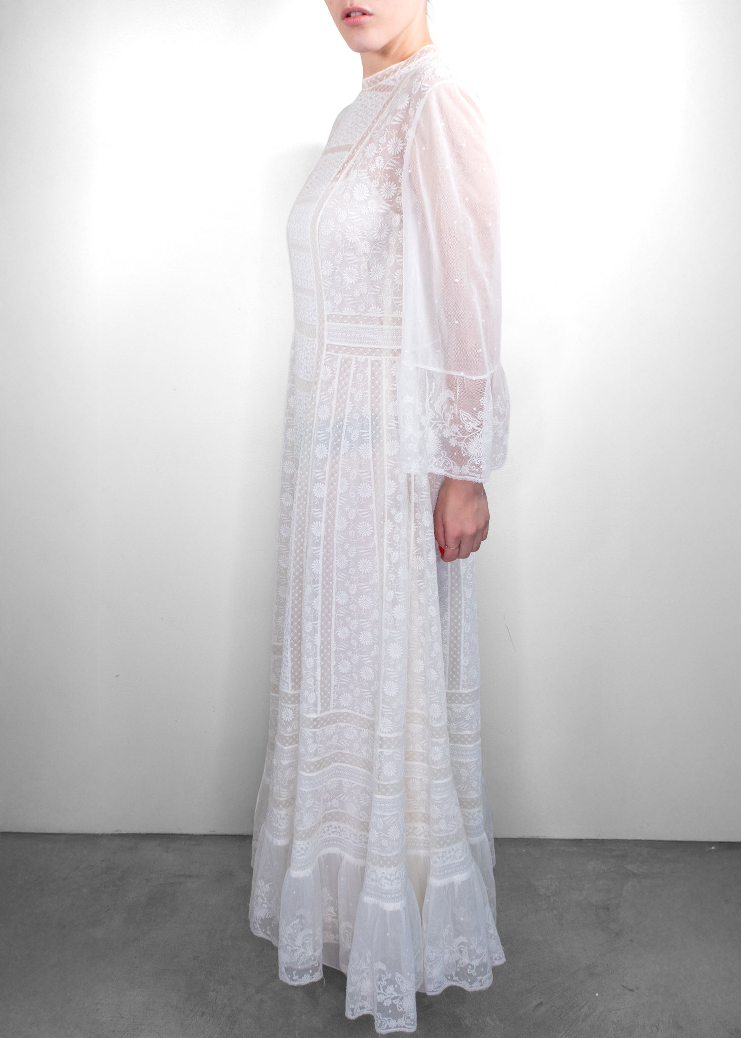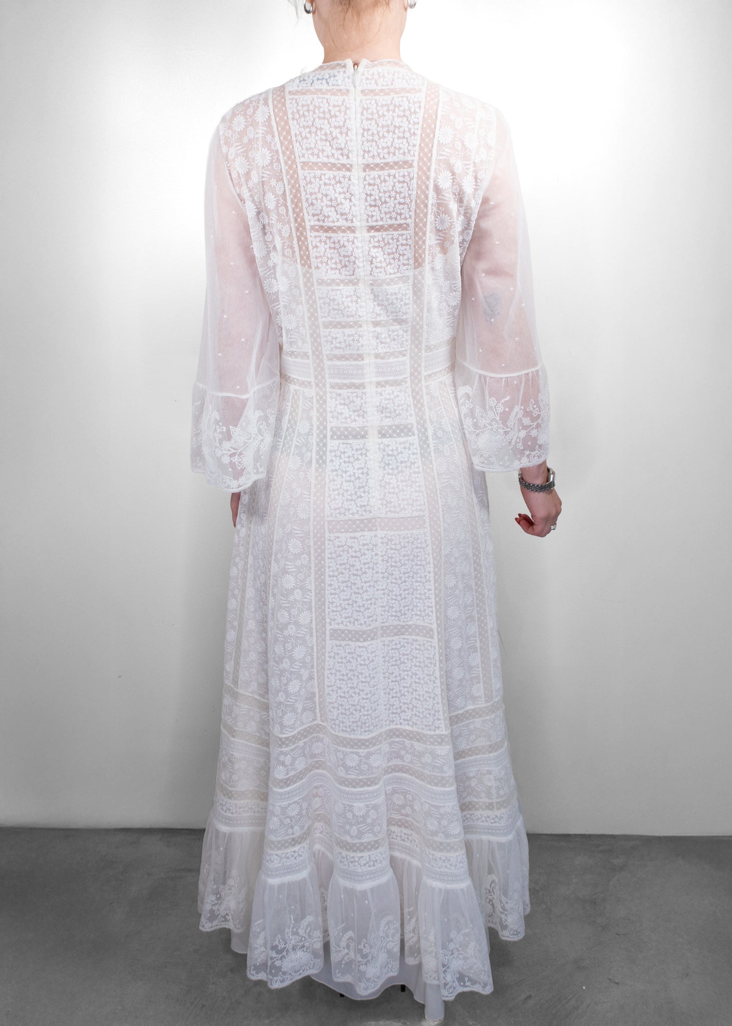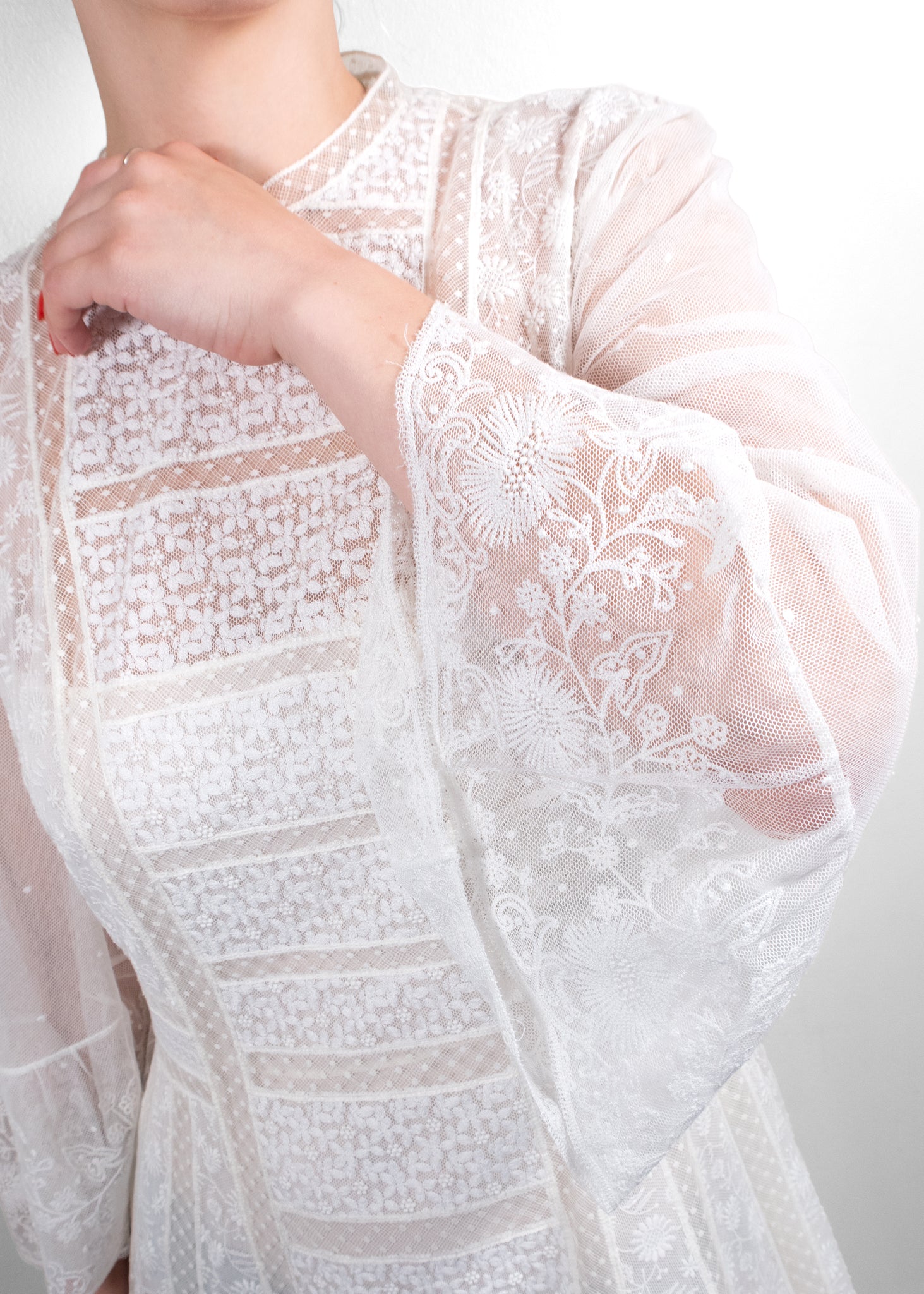 This ethereal Dior dress features intricate floral embroidery and sheer lace panels throughout. With flared sleeves and a flowing silhouette, it evokes timeless romance and delicate craftsmanship.