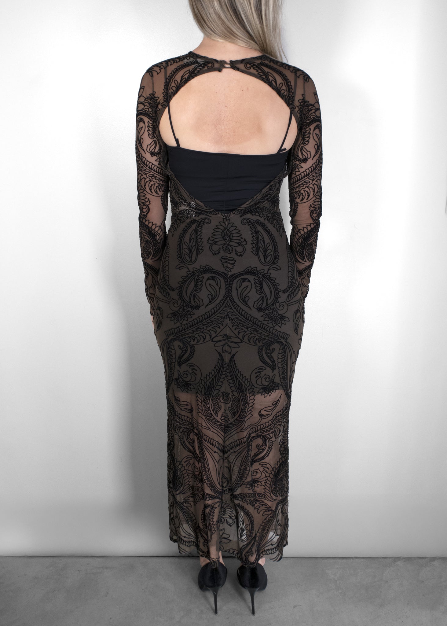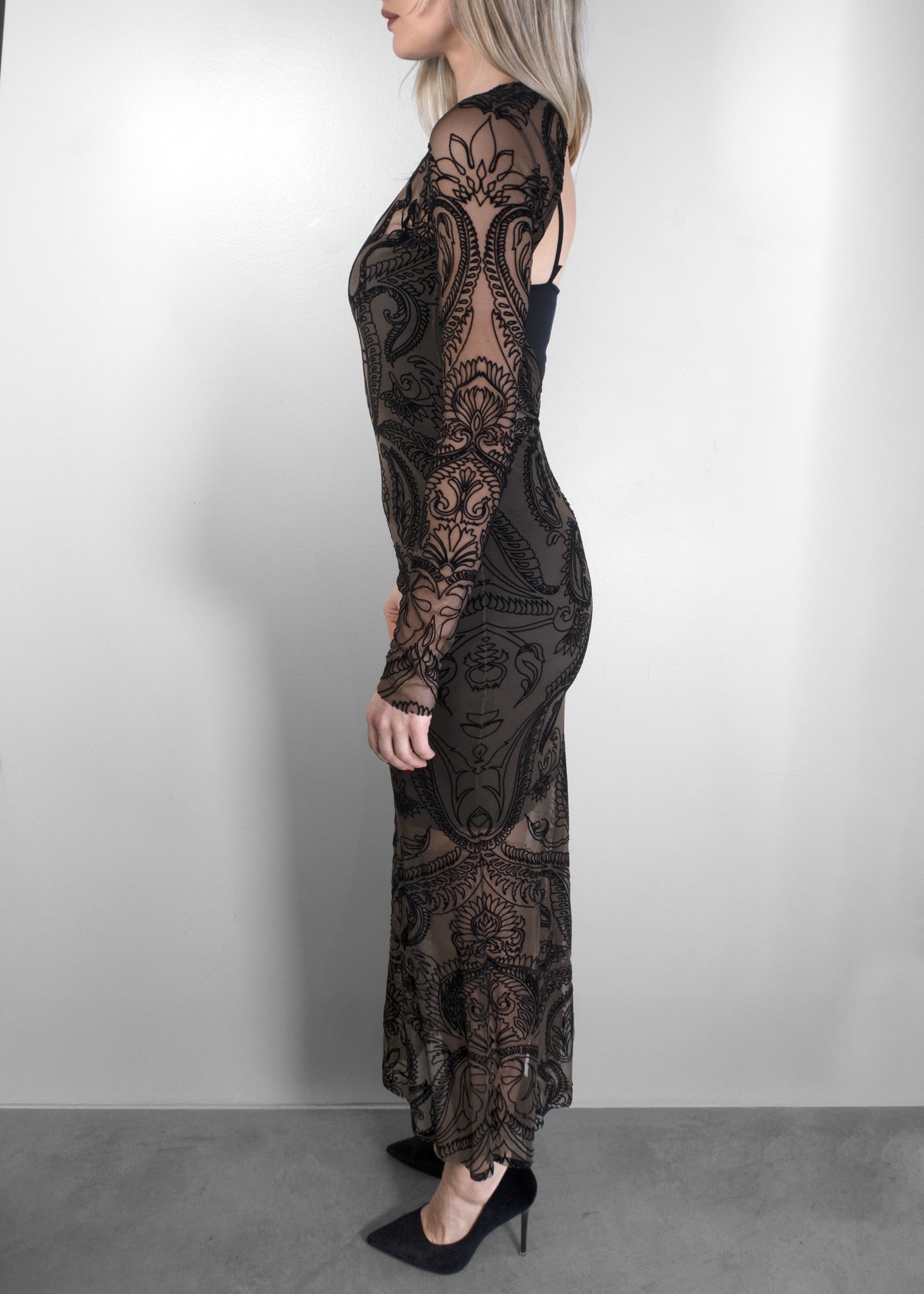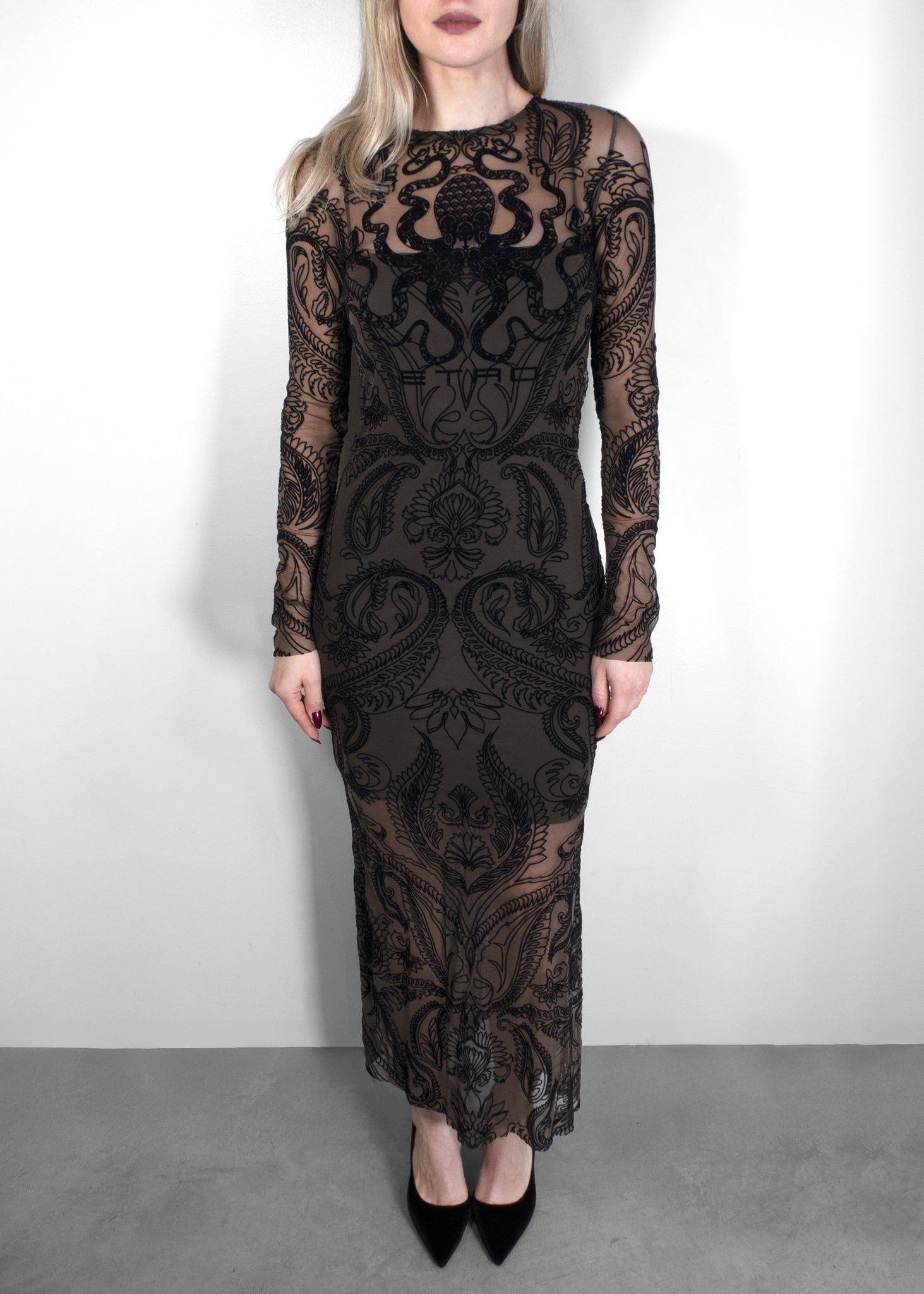 The Etro Paisley-flocked Tulle Dress features a luxurious, sheer tulle fabric adorned with a vibrant paisley flocked pattern. Its elegant, feminine silhouette is complemented by intricate detailing and a soft, ethereal feel, making it perfect for both daytime events and evening affairs. The dress offers a sophisticated blend of classic and contemporary design.