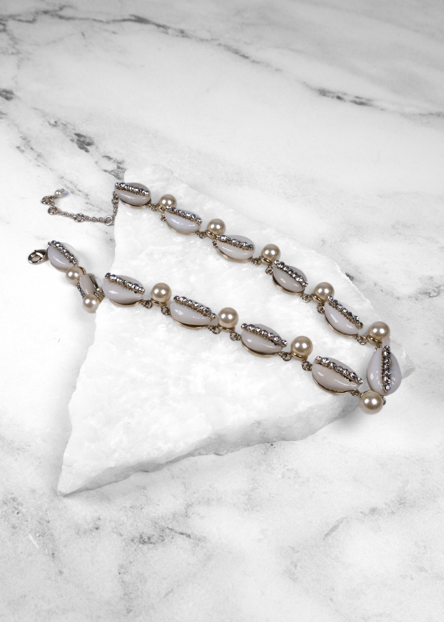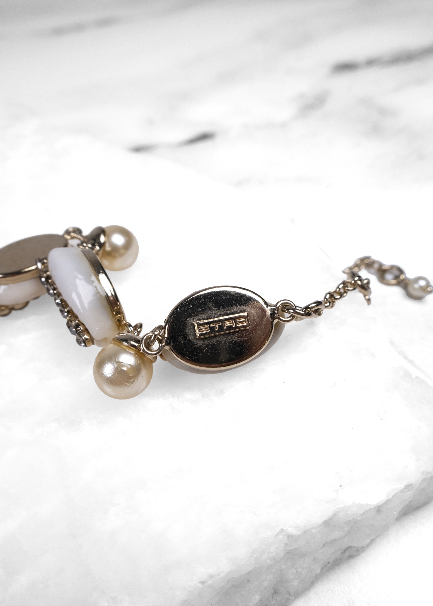 The Etro Shell and Crystal Drop Necklace is a striking statement piece that combines natural elegance with refined craftsmanship. Featuring a delicate gold-tone chain adorned with intricate shell accents and sparkling crystal drops, this necklace captures the essence of seaside glamour. Perfect for adding a touch of bohemian sophistication to any outfit, it seamlessly transitions from casual to formal occasions.