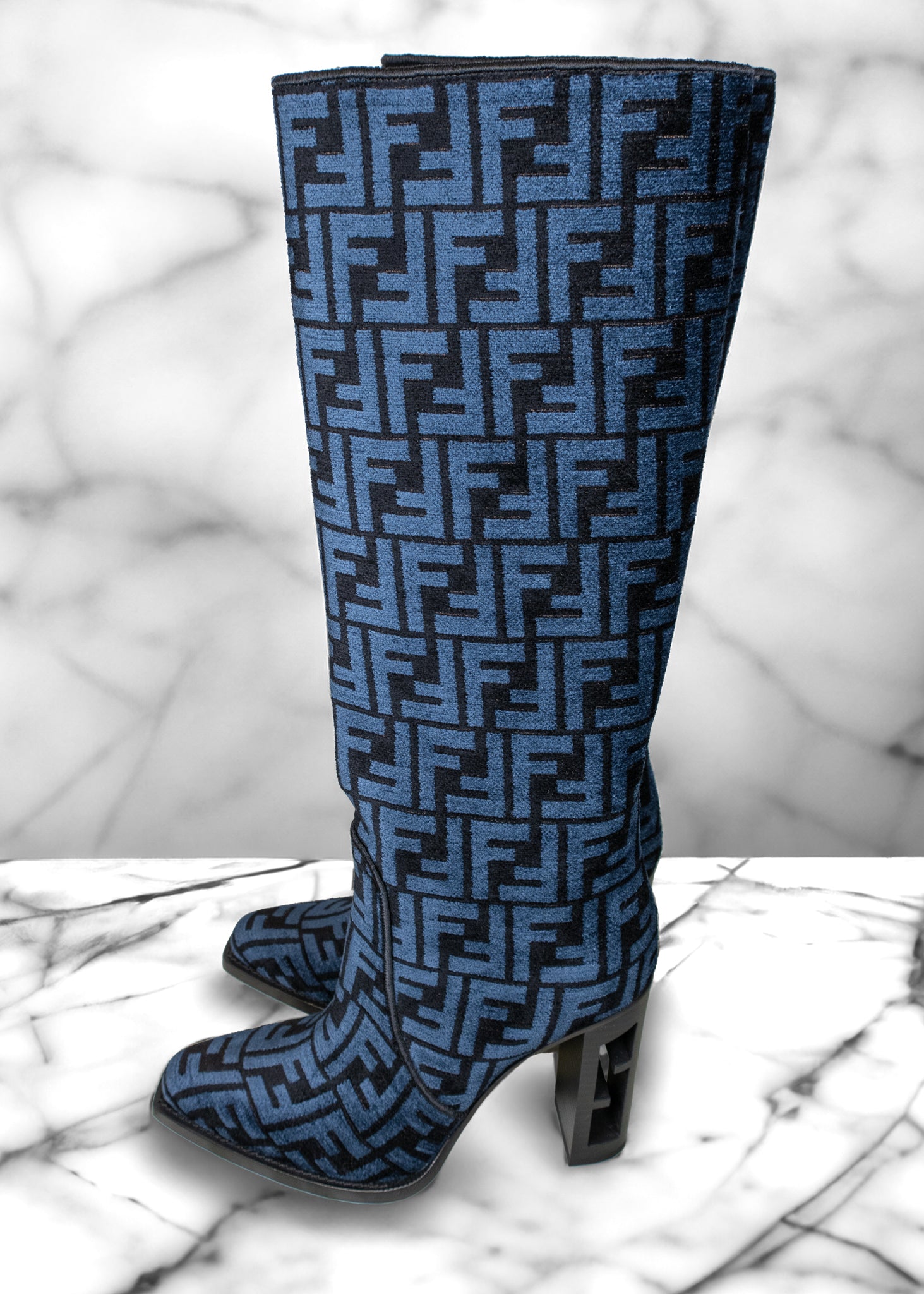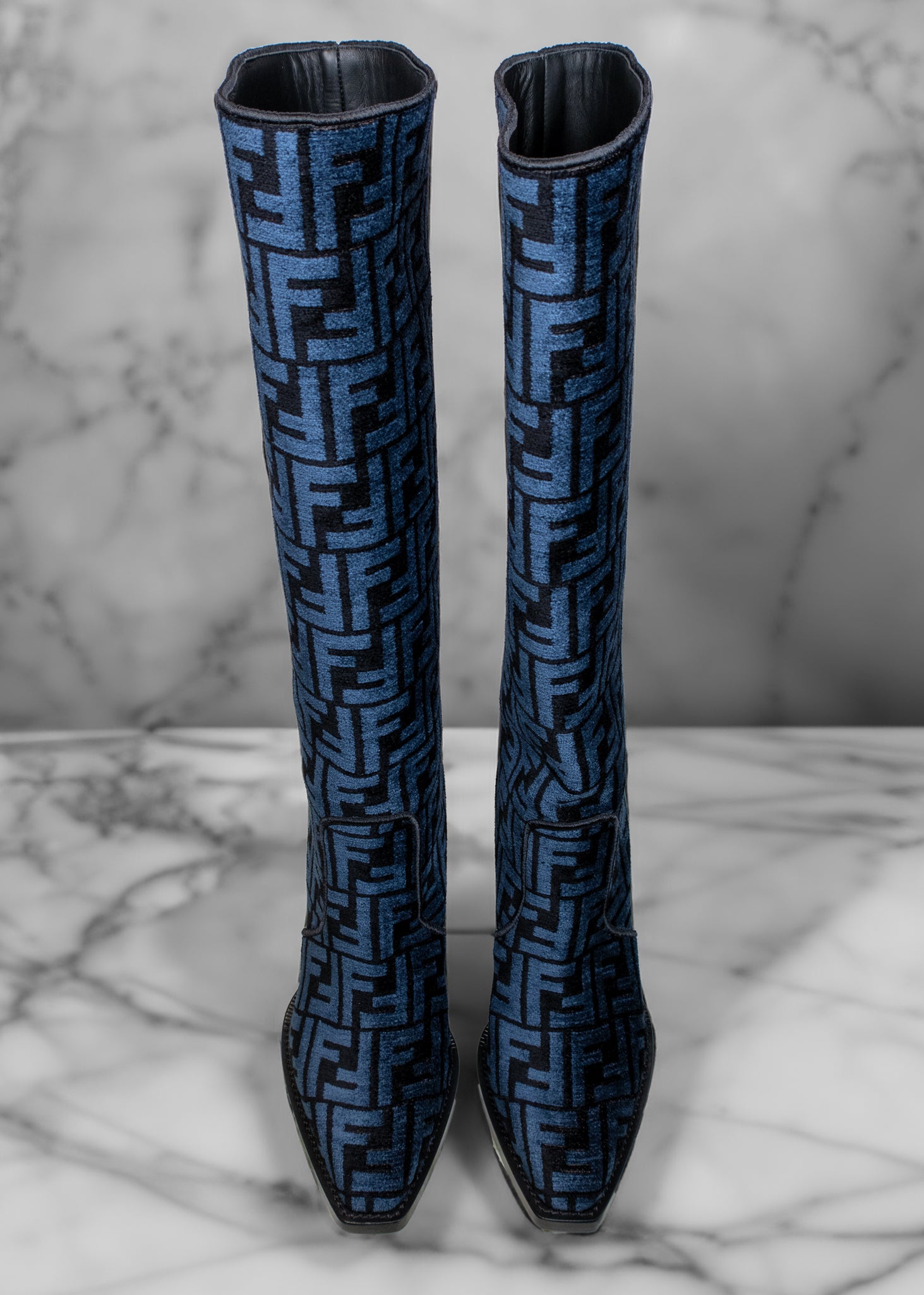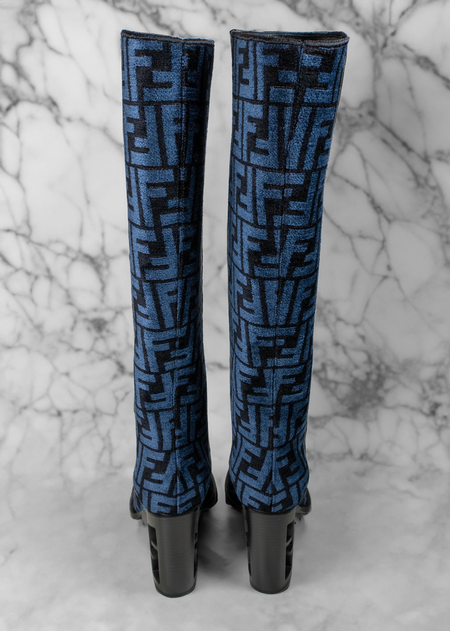 Fendi Blue and Black Jacquard Chenille Knee Length Boots