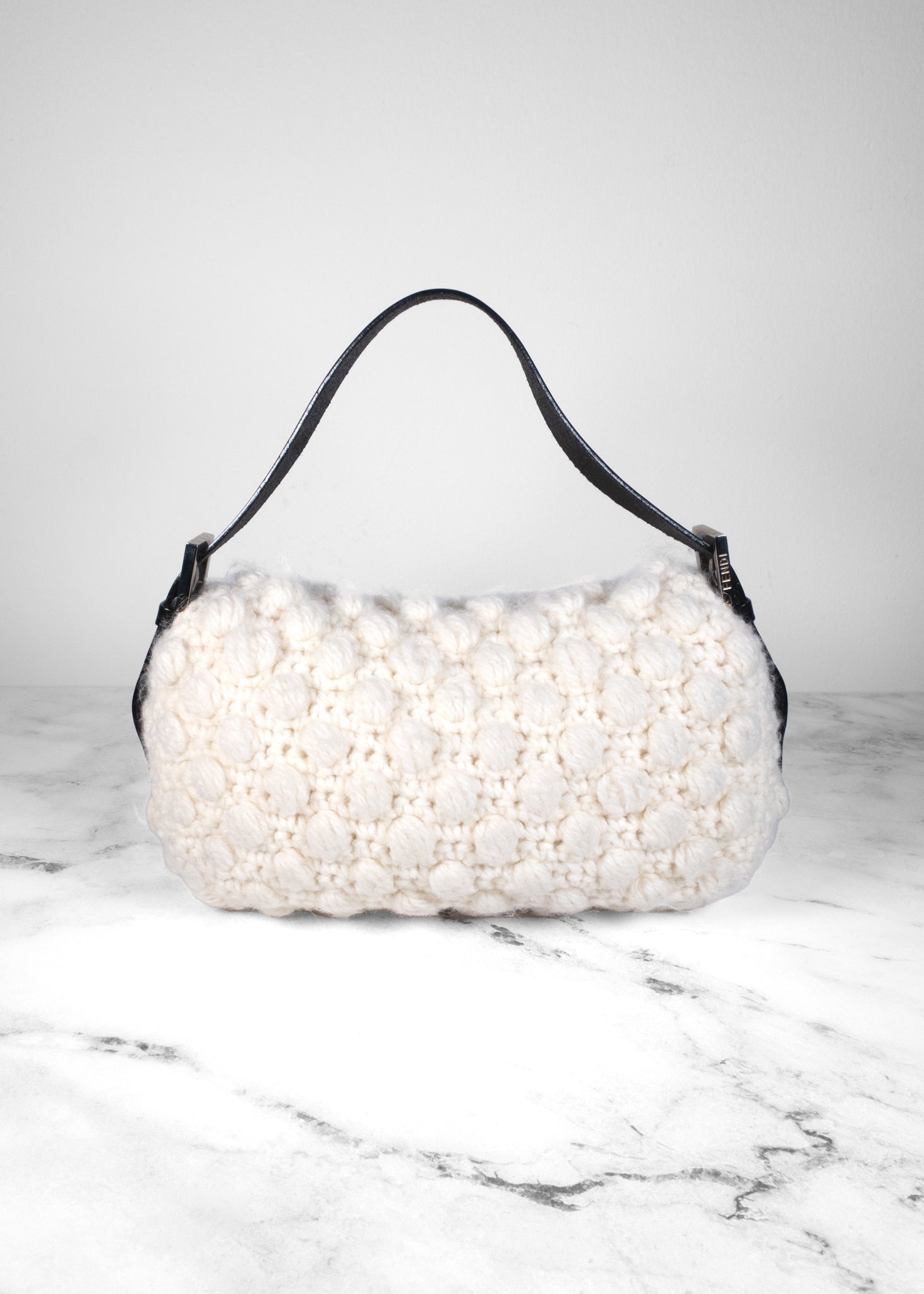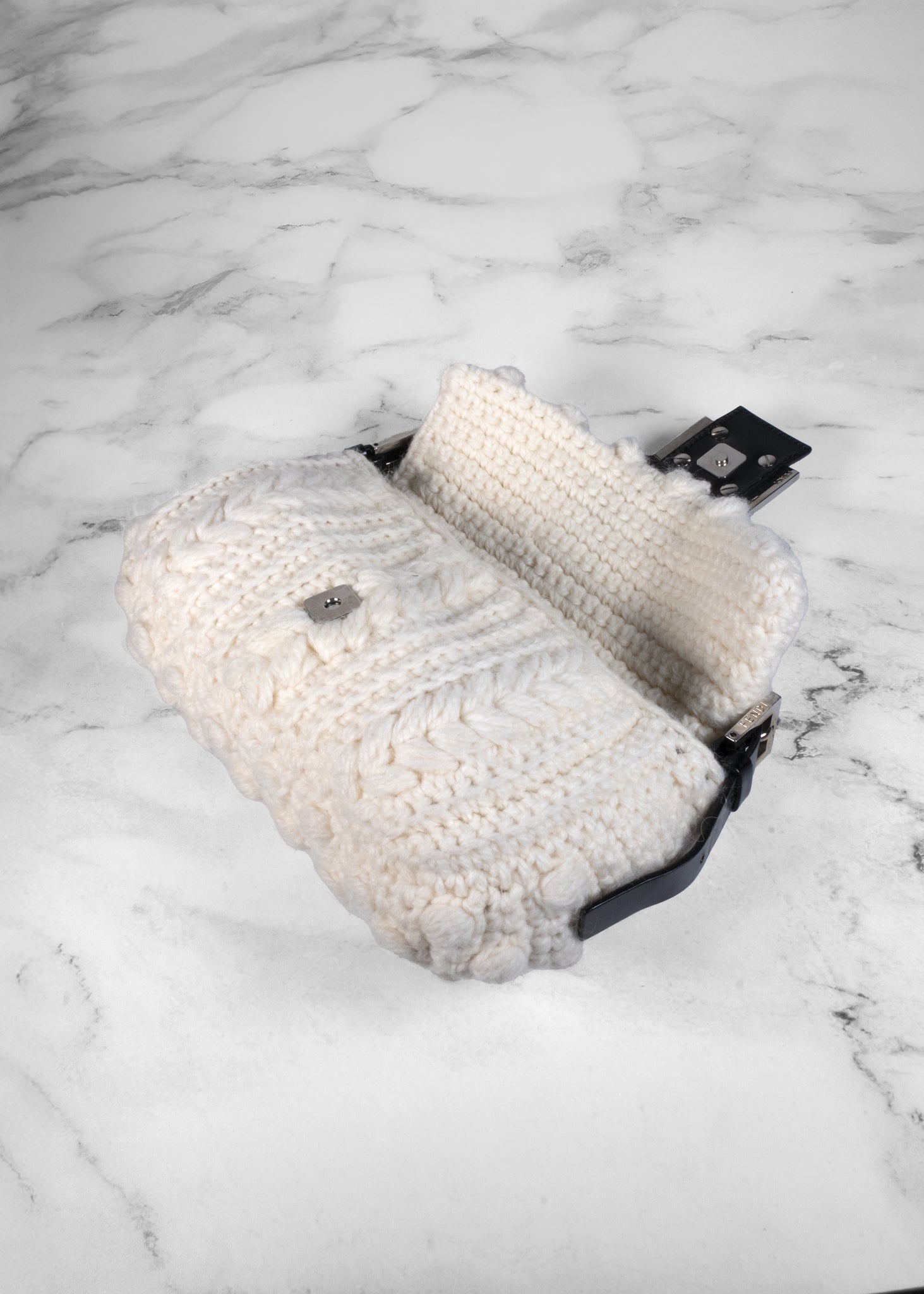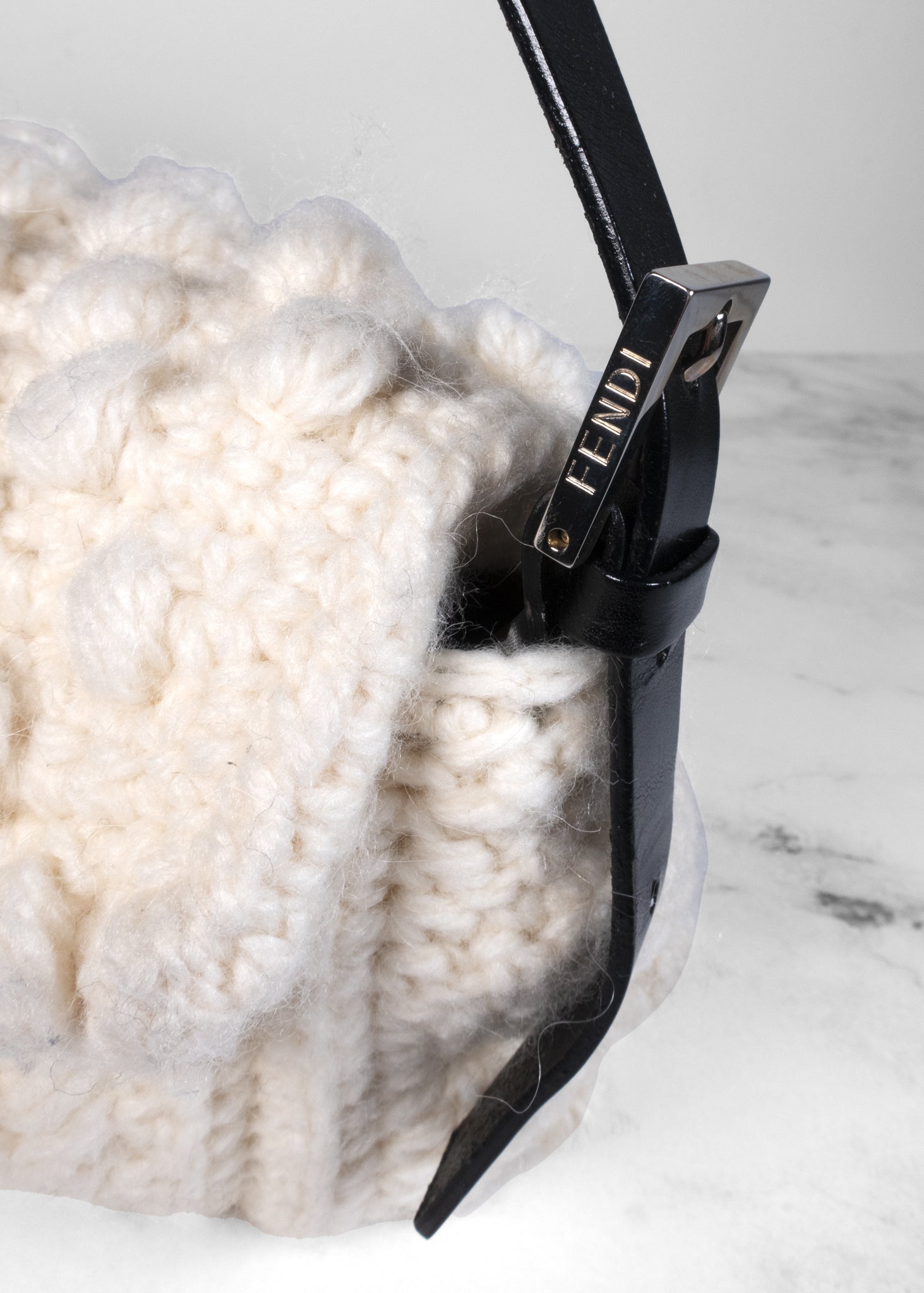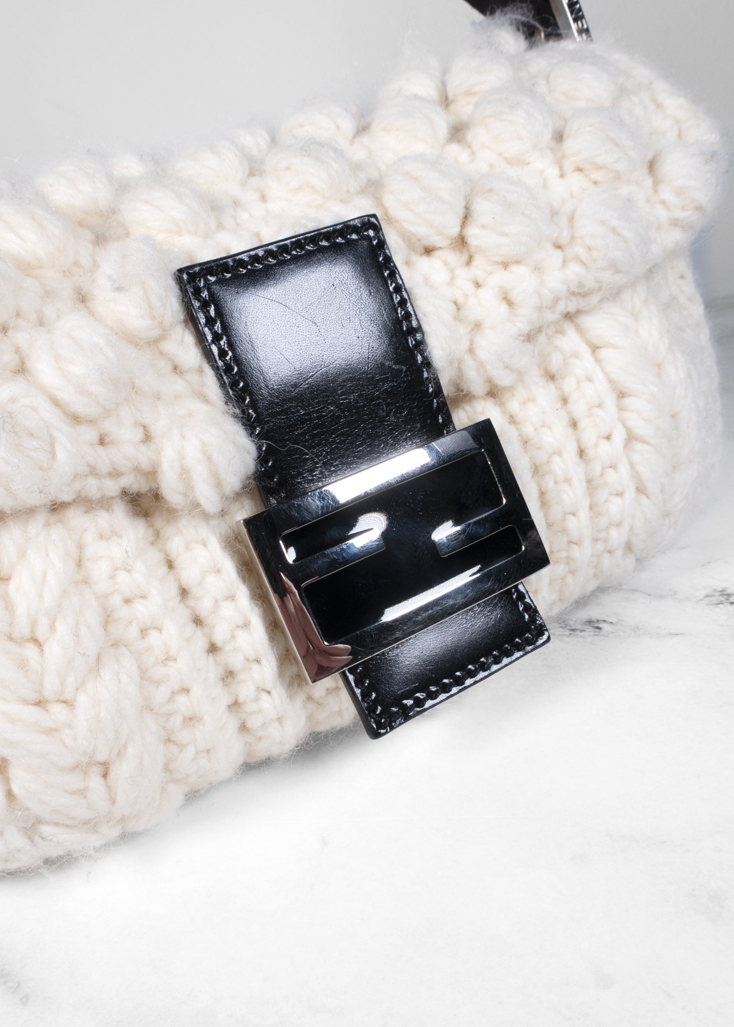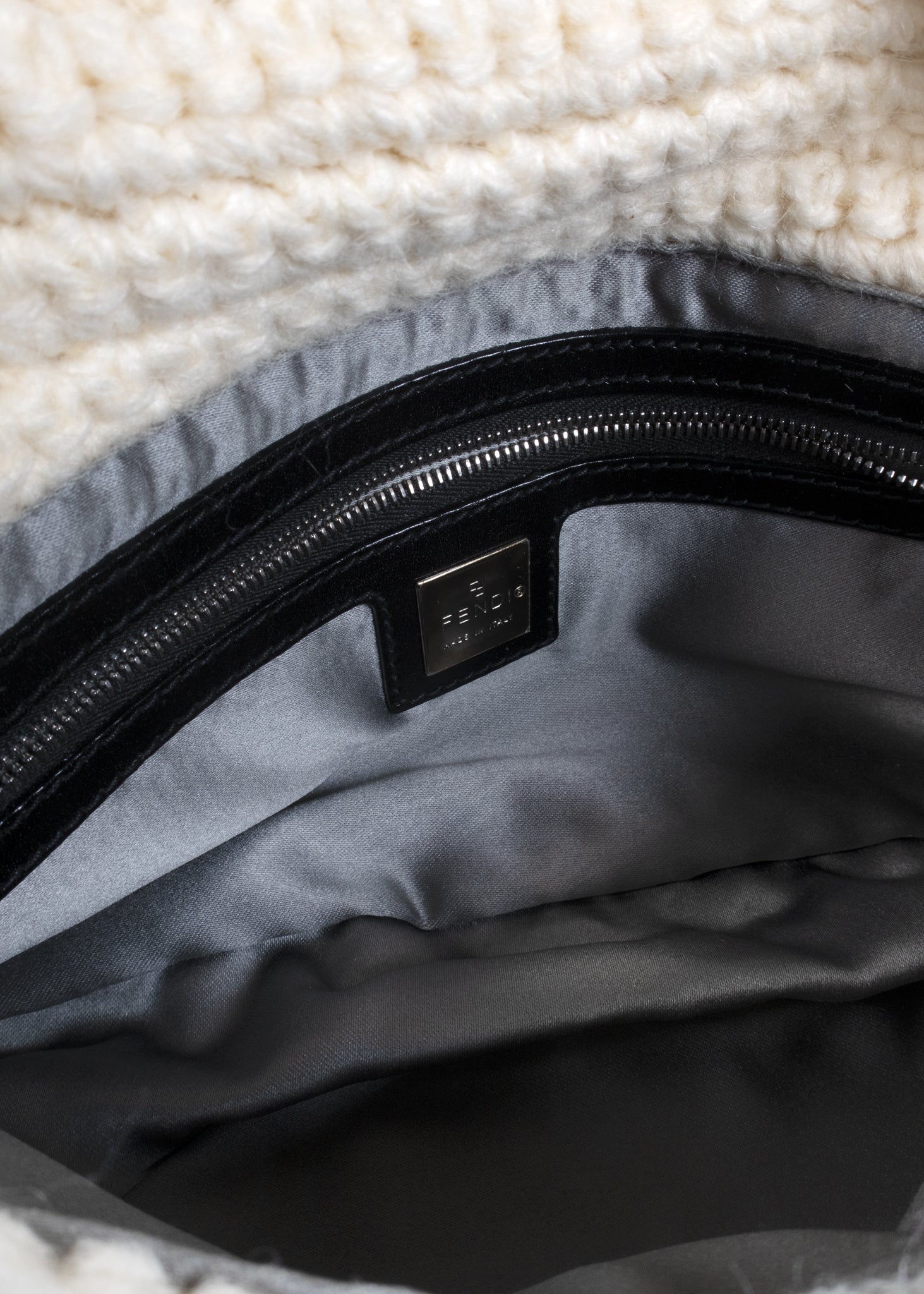 The Fendi Wool Mamma Knit Baguette Bag is a stylish and cozy accessory crafted from soft wool with a signature knit pattern. Featuring the iconic FF logo, it offers a compact silhouette with a fold-over flap, a magnetic closure, and a sleek adjustable strap for shoulder or hand carry. This bag is both elegant and functional, ideal for adding a touch of luxury to any outfit.