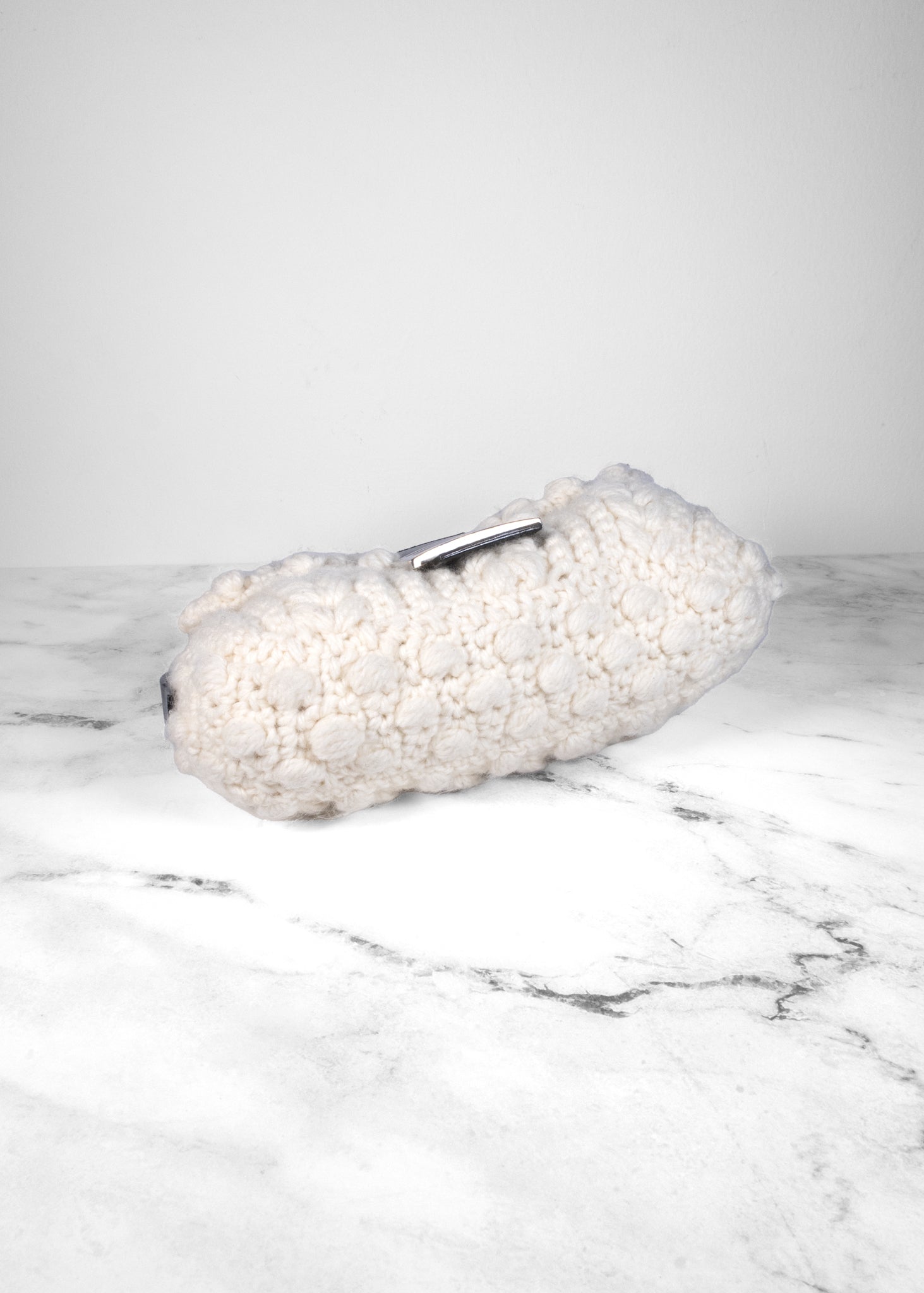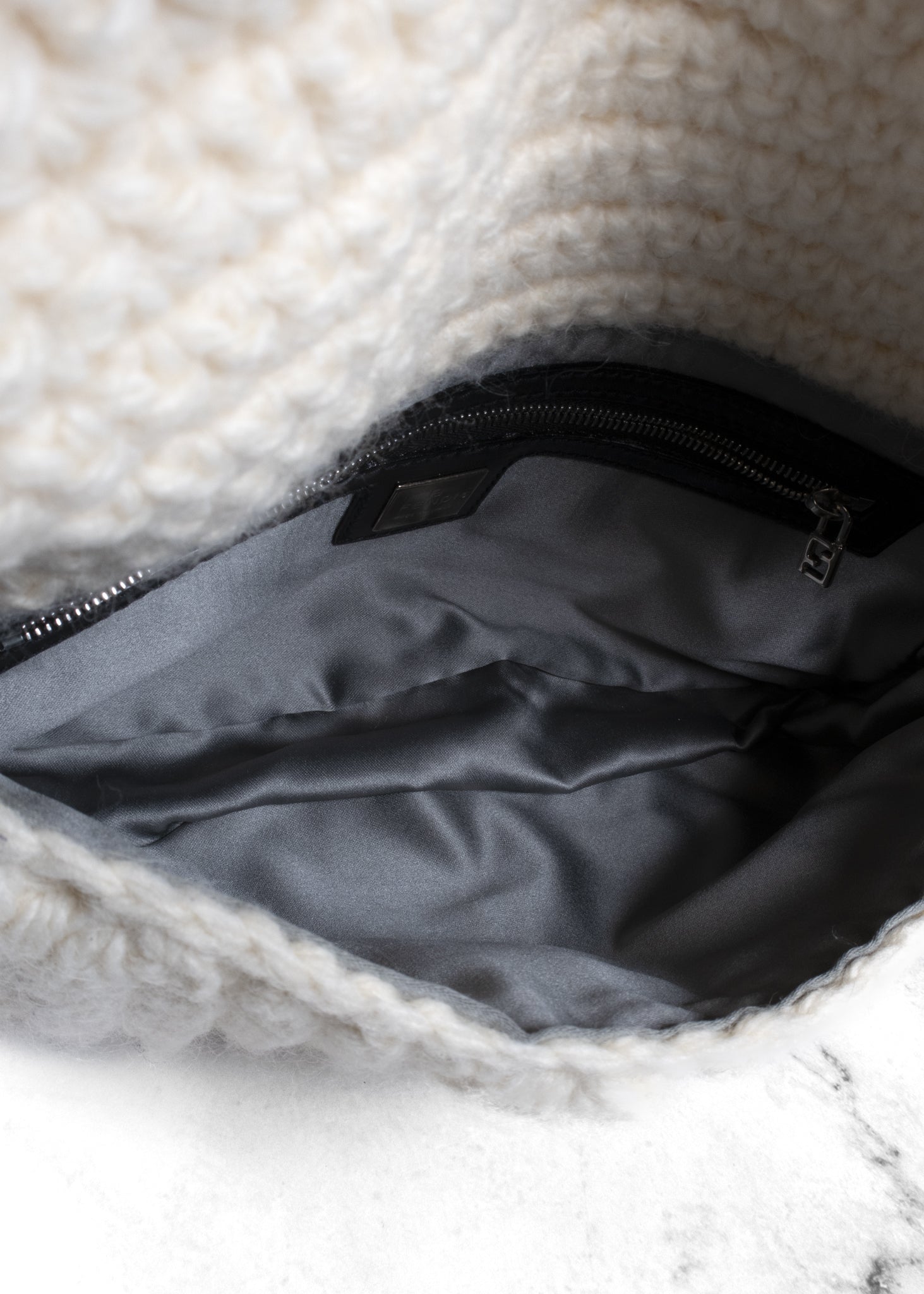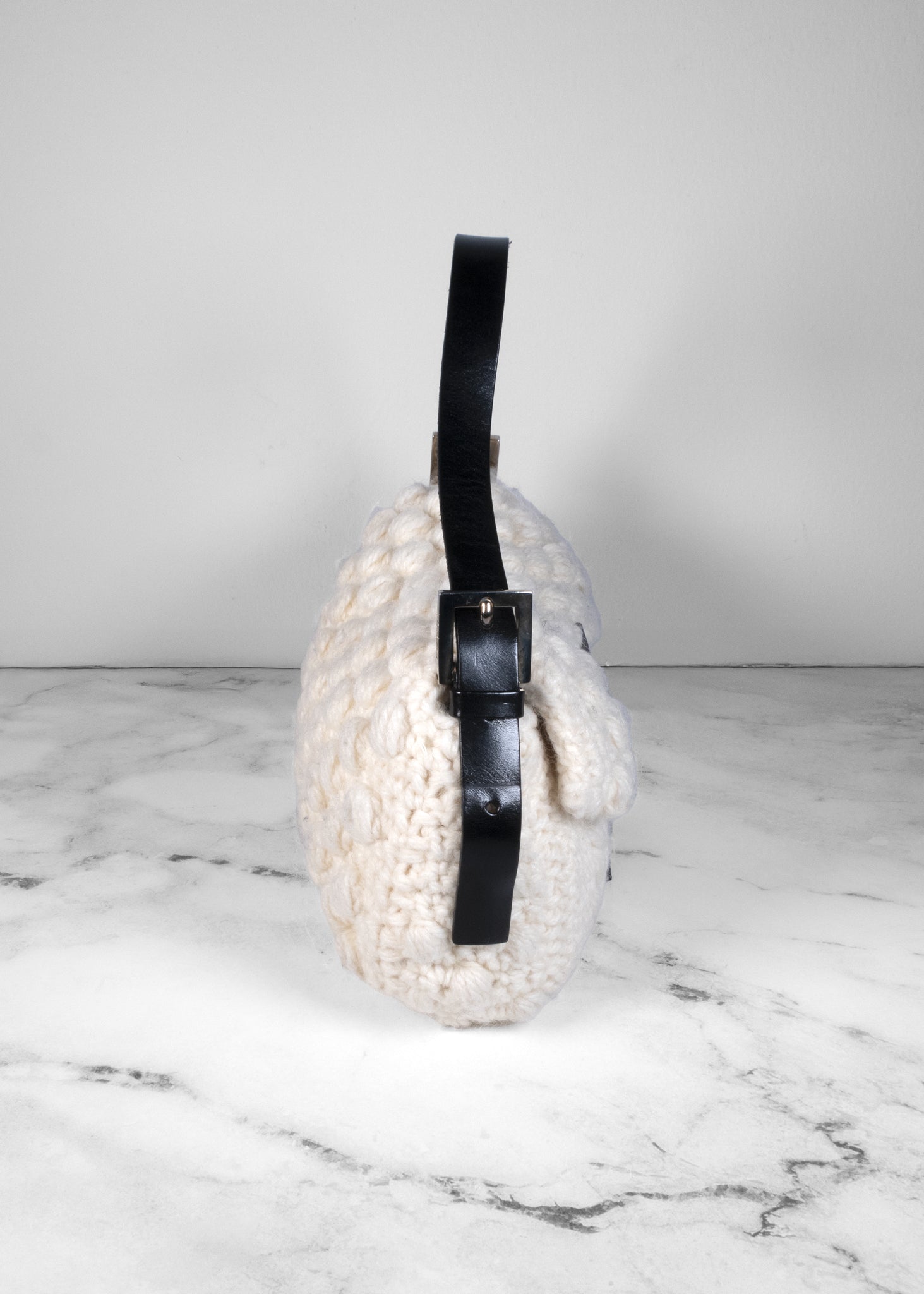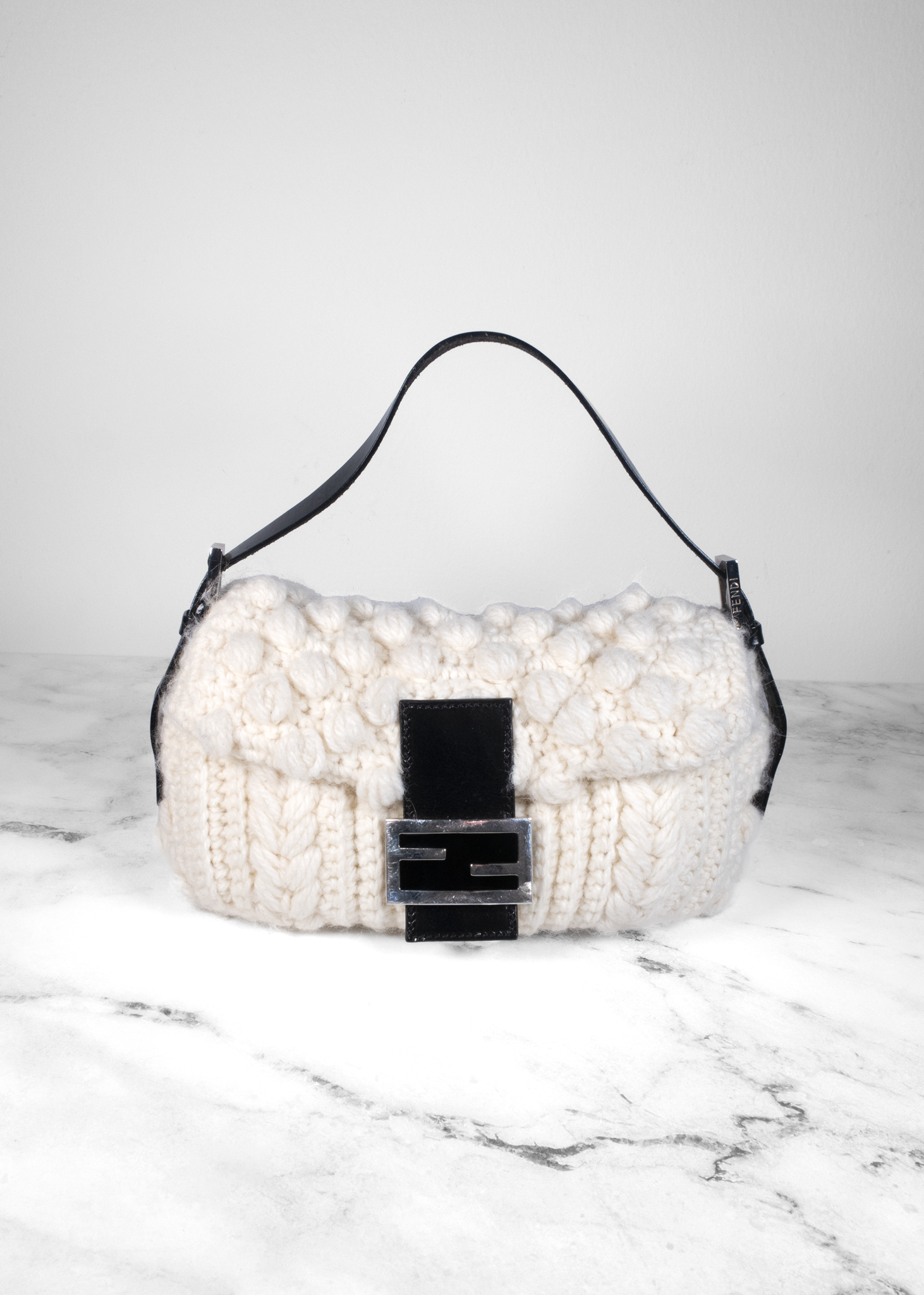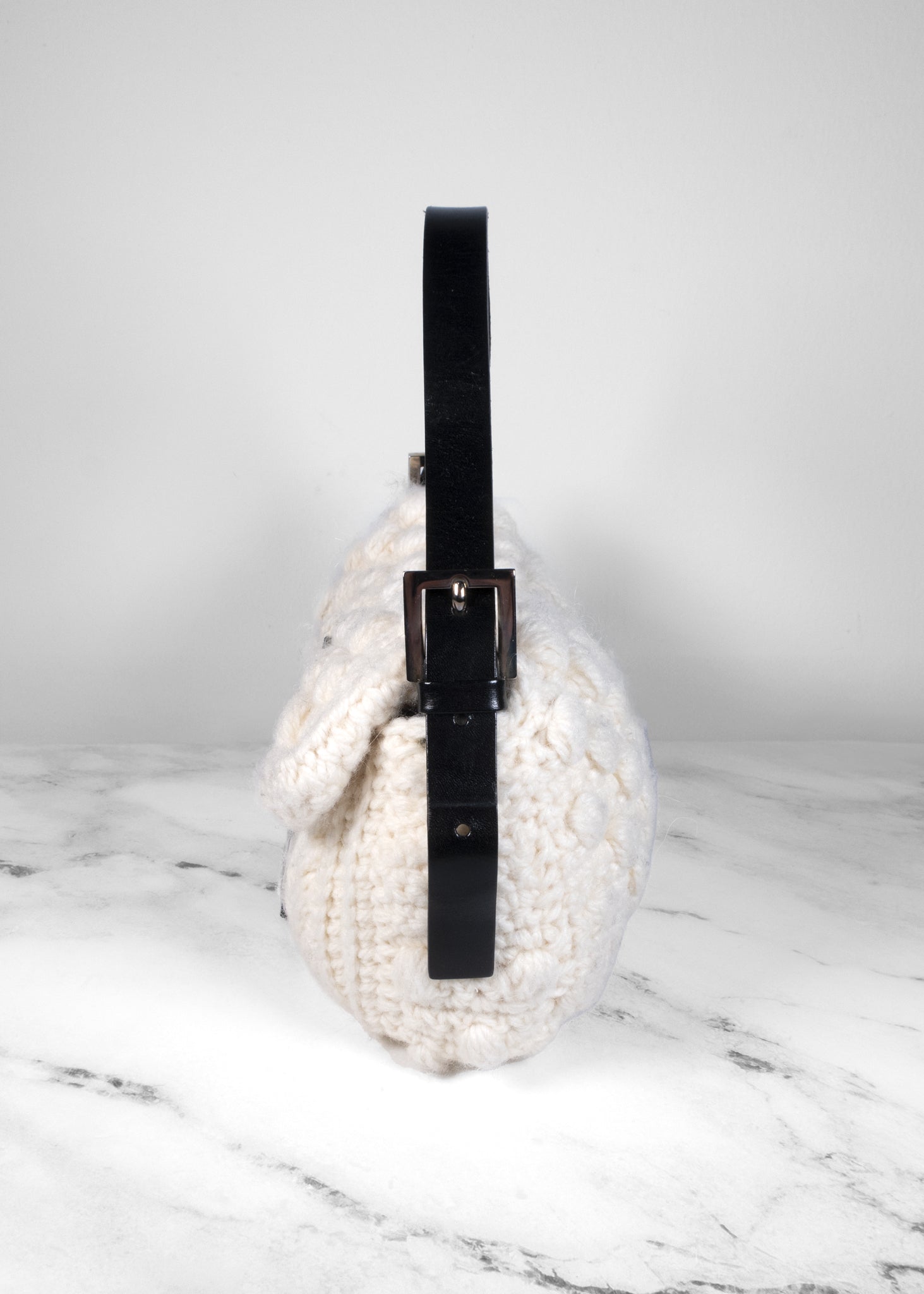 The Fendi Wool Mamma Knit Baguette Bag is a stylish and cozy accessory crafted from soft wool with a signature knit pattern. Featuring the iconic FF logo, it offers a compact silhouette with a fold-over flap, a magnetic closure, and a sleek adjustable strap for shoulder or hand carry. This bag is both elegant and functional, ideal for adding a touch of luxury to any outfit.