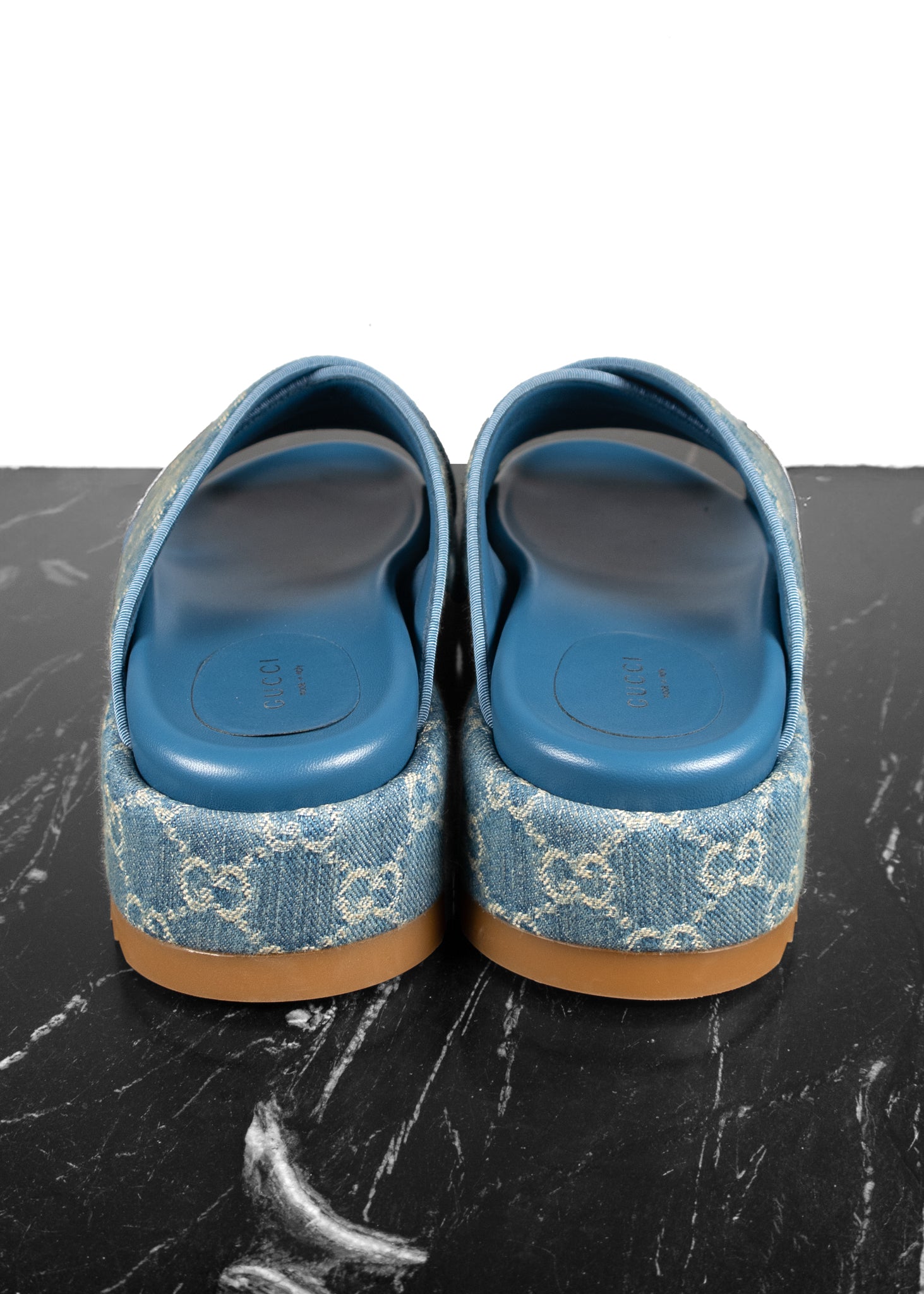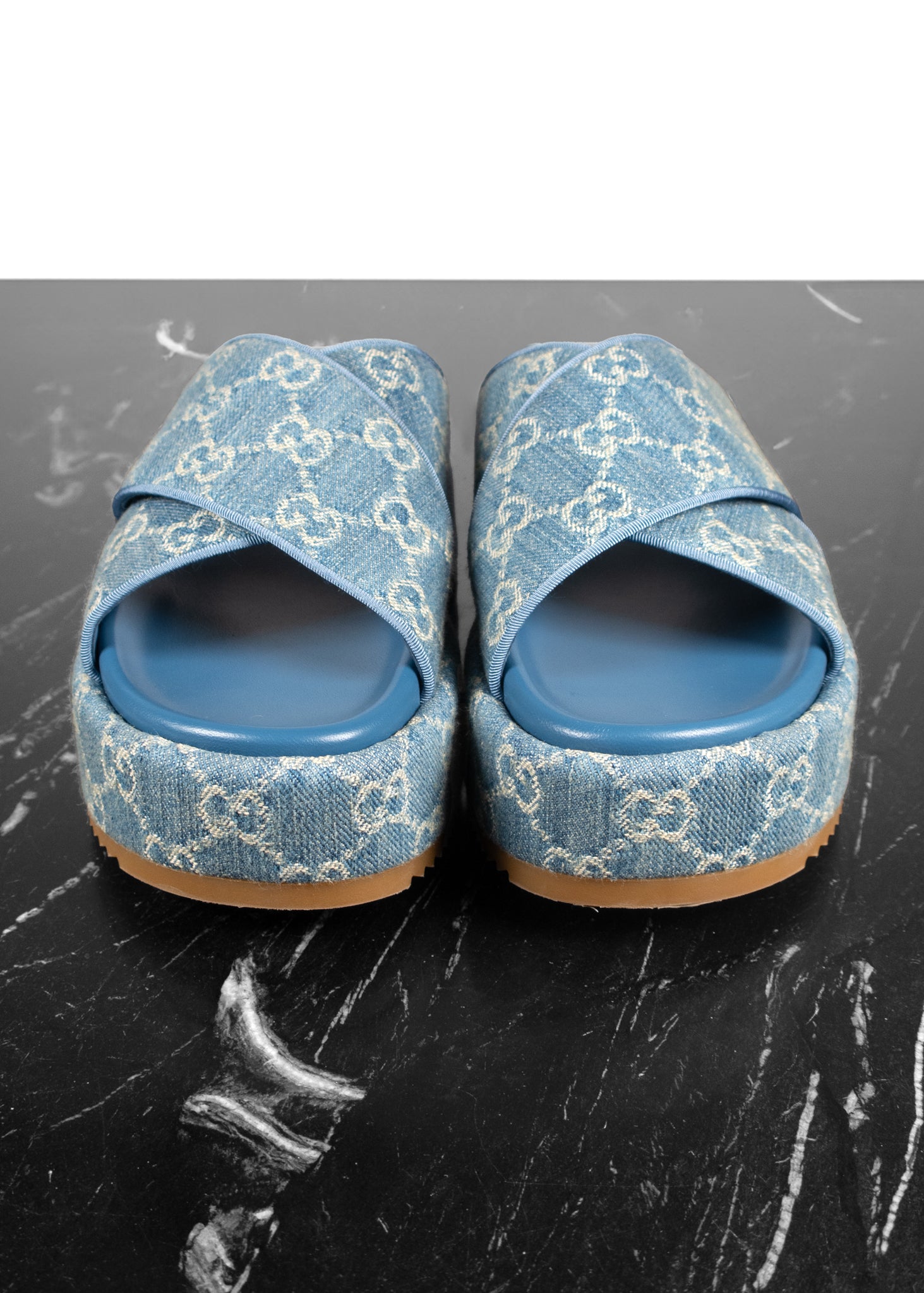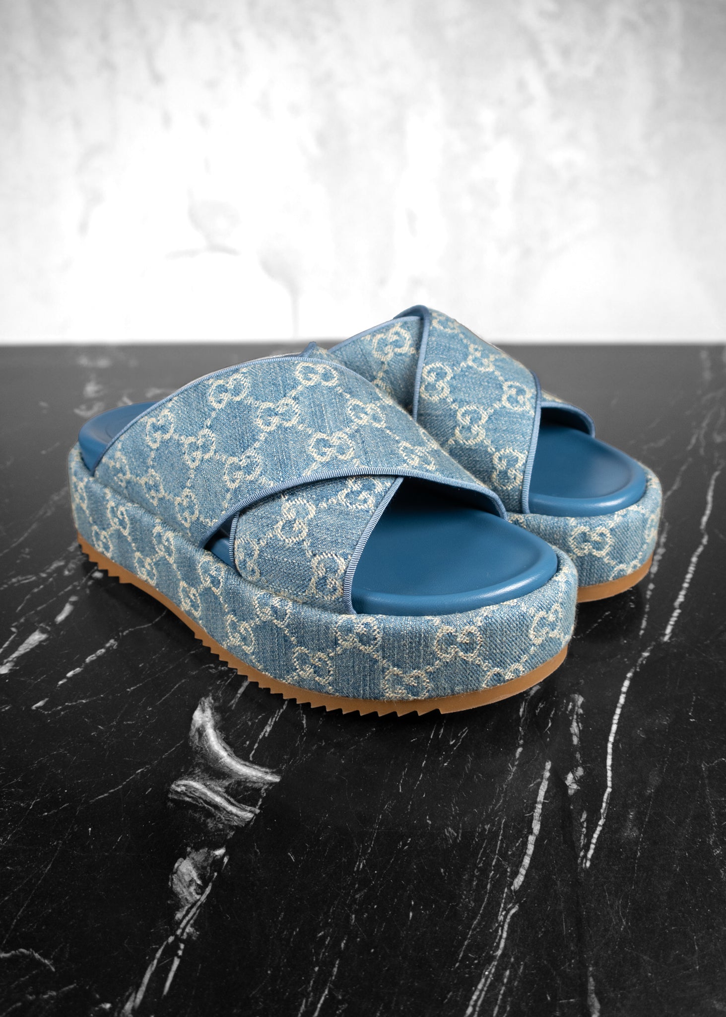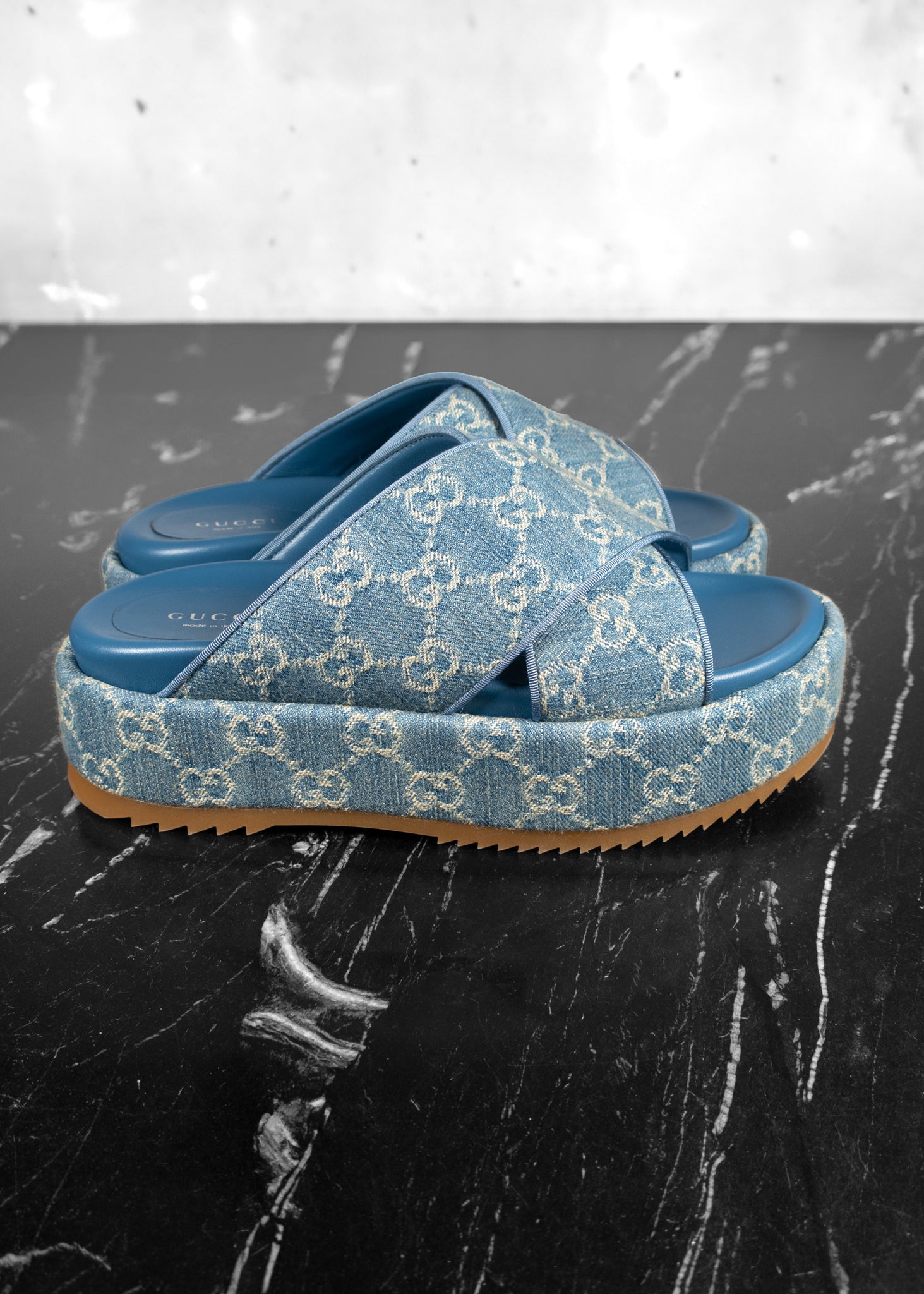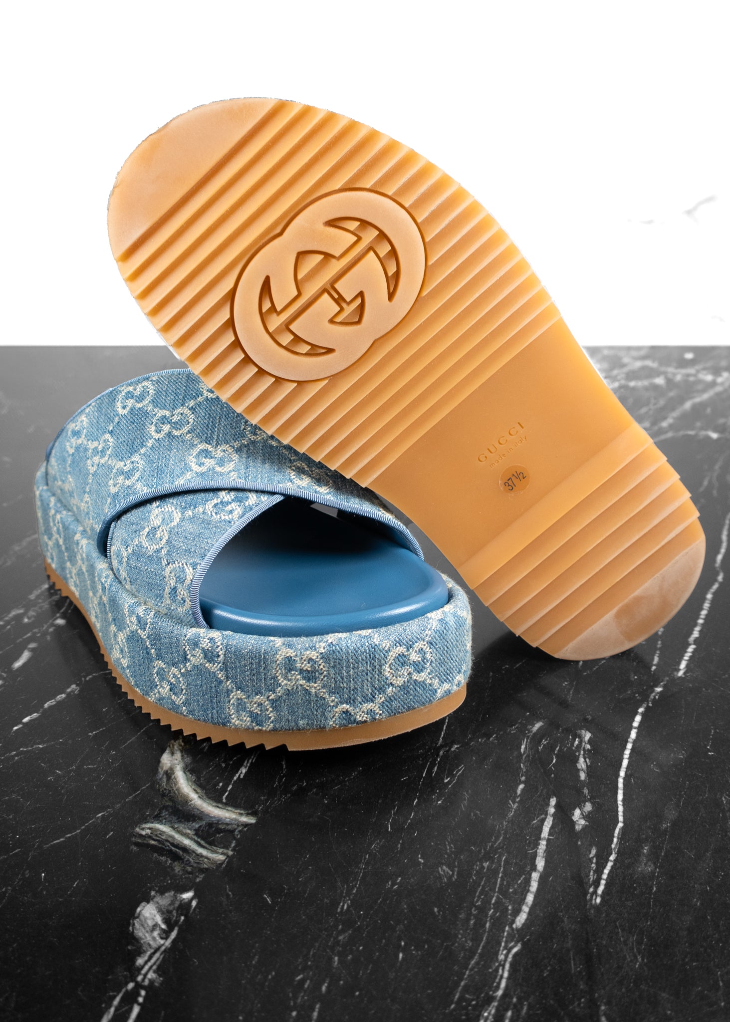 The Gucci Angelina GG Denim Platform Sandals are a chic and stylish footwear choice that combines the timeless appeal of denim with the luxury of the Gucci brand. These platform sandals feature the iconic GG monogram print on a high-quality denim fabric, paired with a sleek leather trim. The design includes a bold platform sole and a chunky high heel, providing both height and comfort. Finished with a sophisticated ankle strap and a gold-tone buckle, these sandals embody contemporary elegance and are perfect for making a fashion-forward statement.