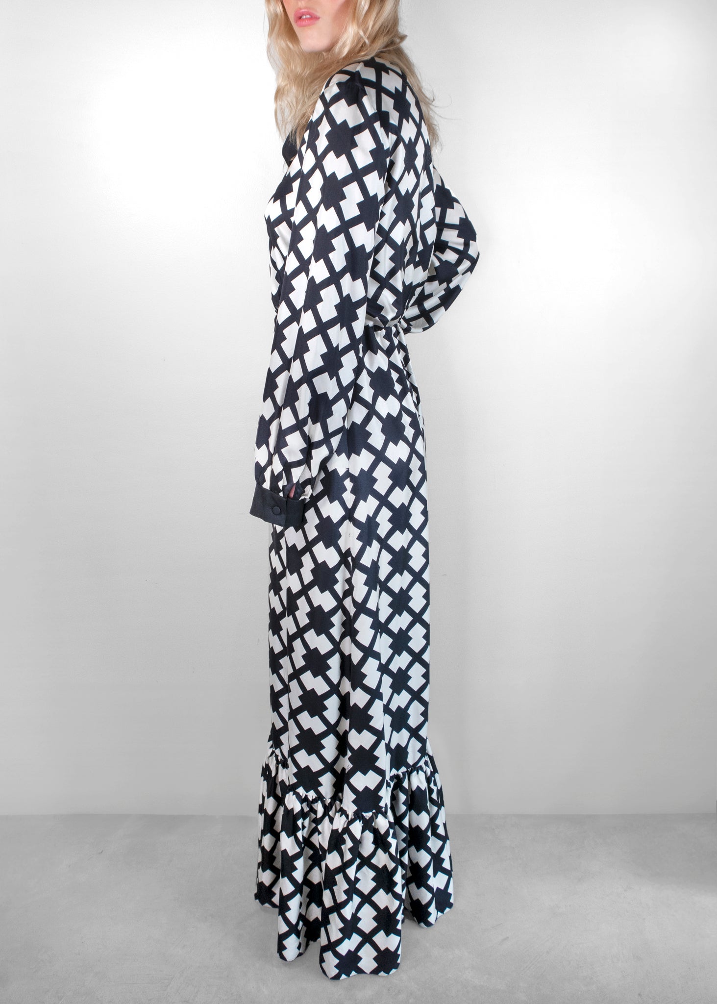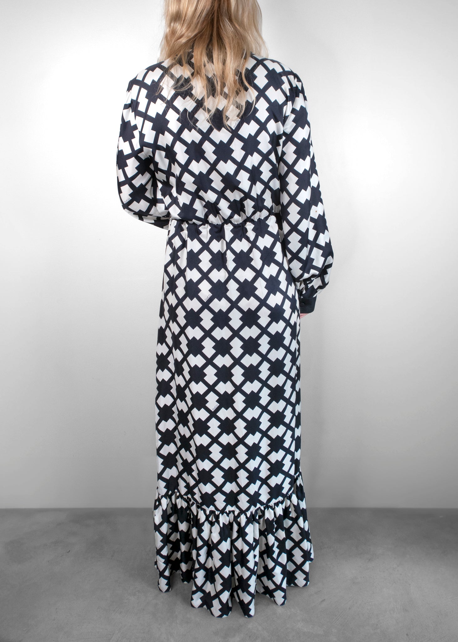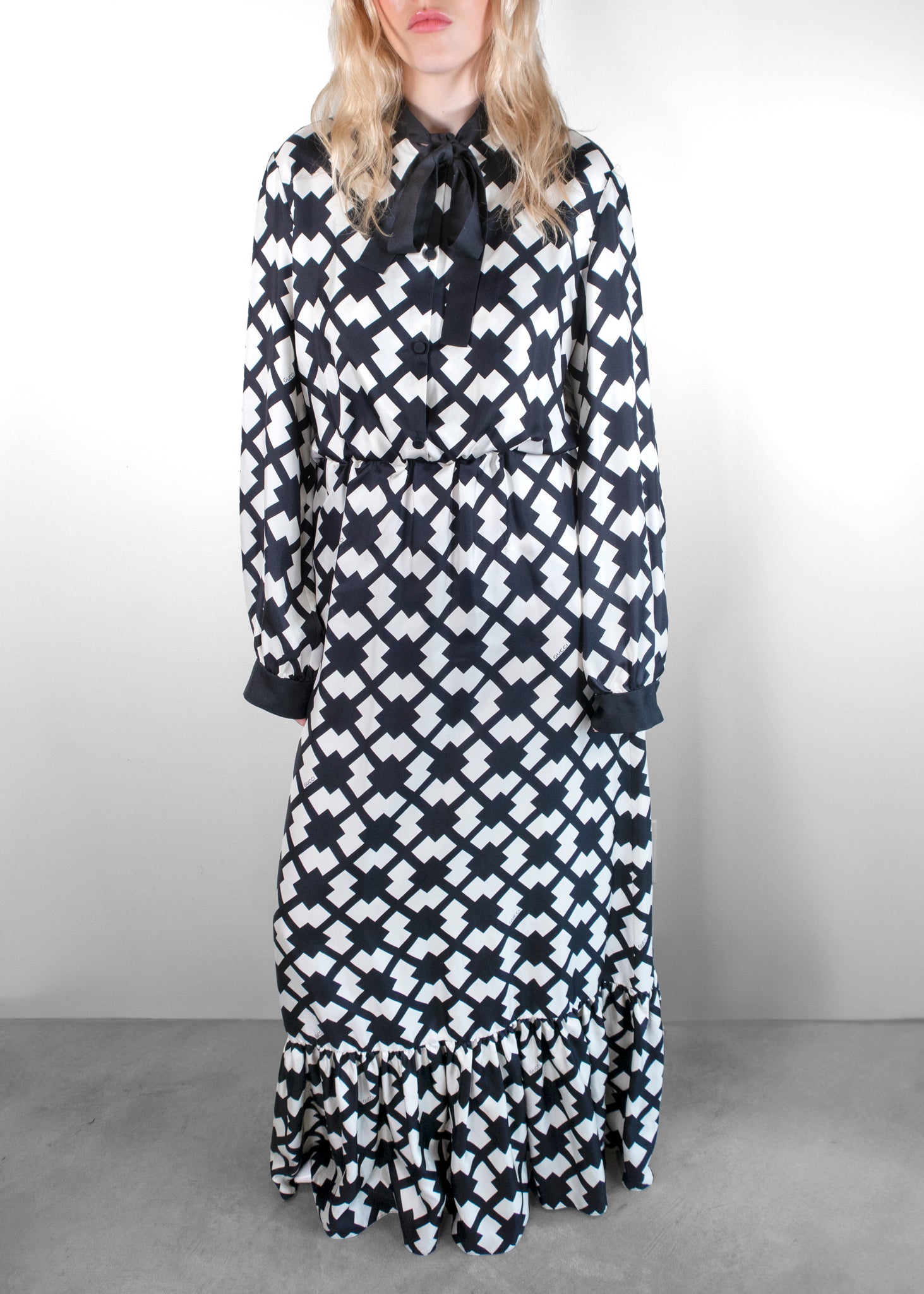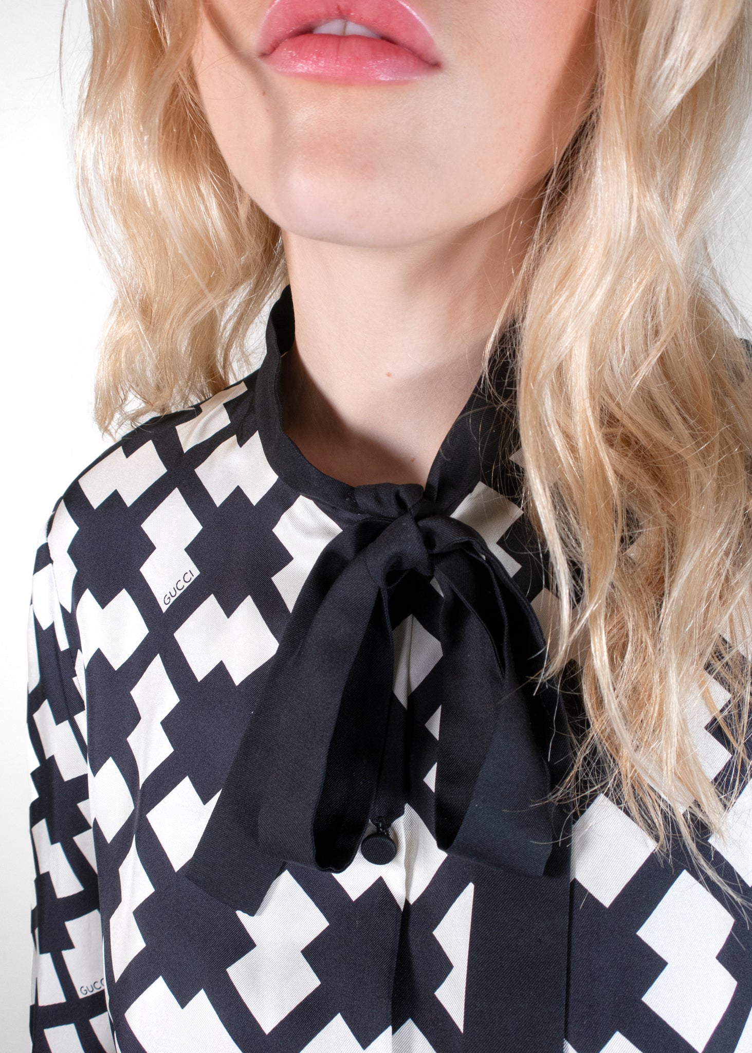 This Gucci Rhombus Tile dress features a bold black and white geometric pattern, with an eye-catching design of rhombus tiles. The dress has a chic, vintage-inspired silhouette with a flattering waist tie and cuffed long sleeves. The soft, flowing fabric cascades into a ruffled hem, adding a feminine touch to the structured design. Perfect for both casual and dressy occasions, this dress exudes timeless sophistication with a contemporary twist. The ribbon tie at the collar enhances its elegant yet playful aesthetic.
