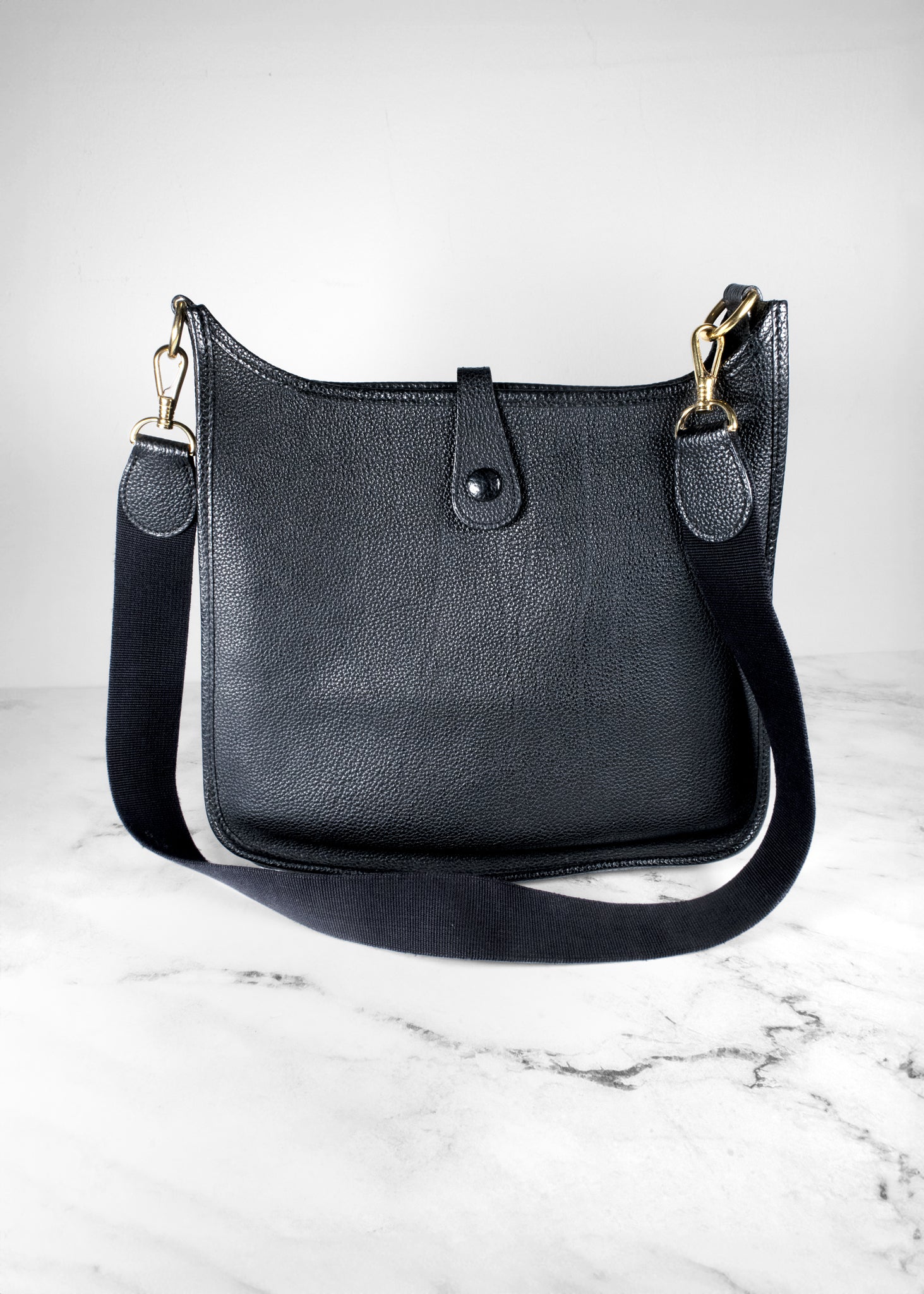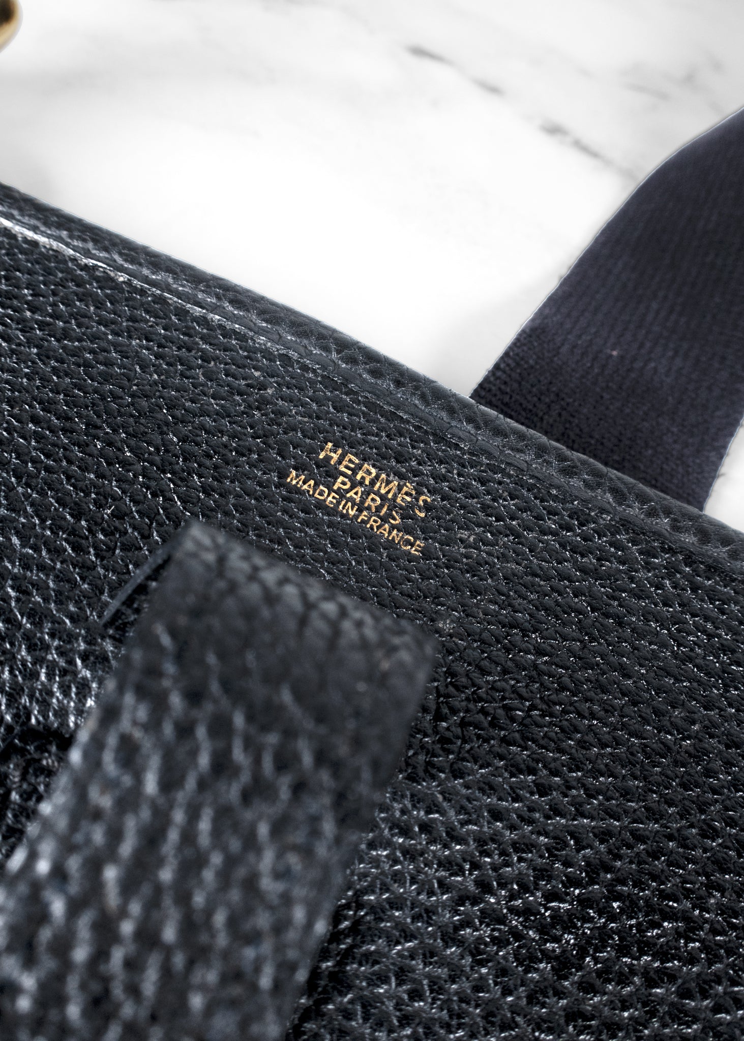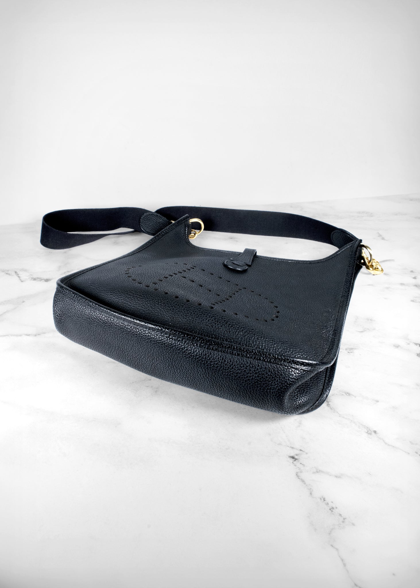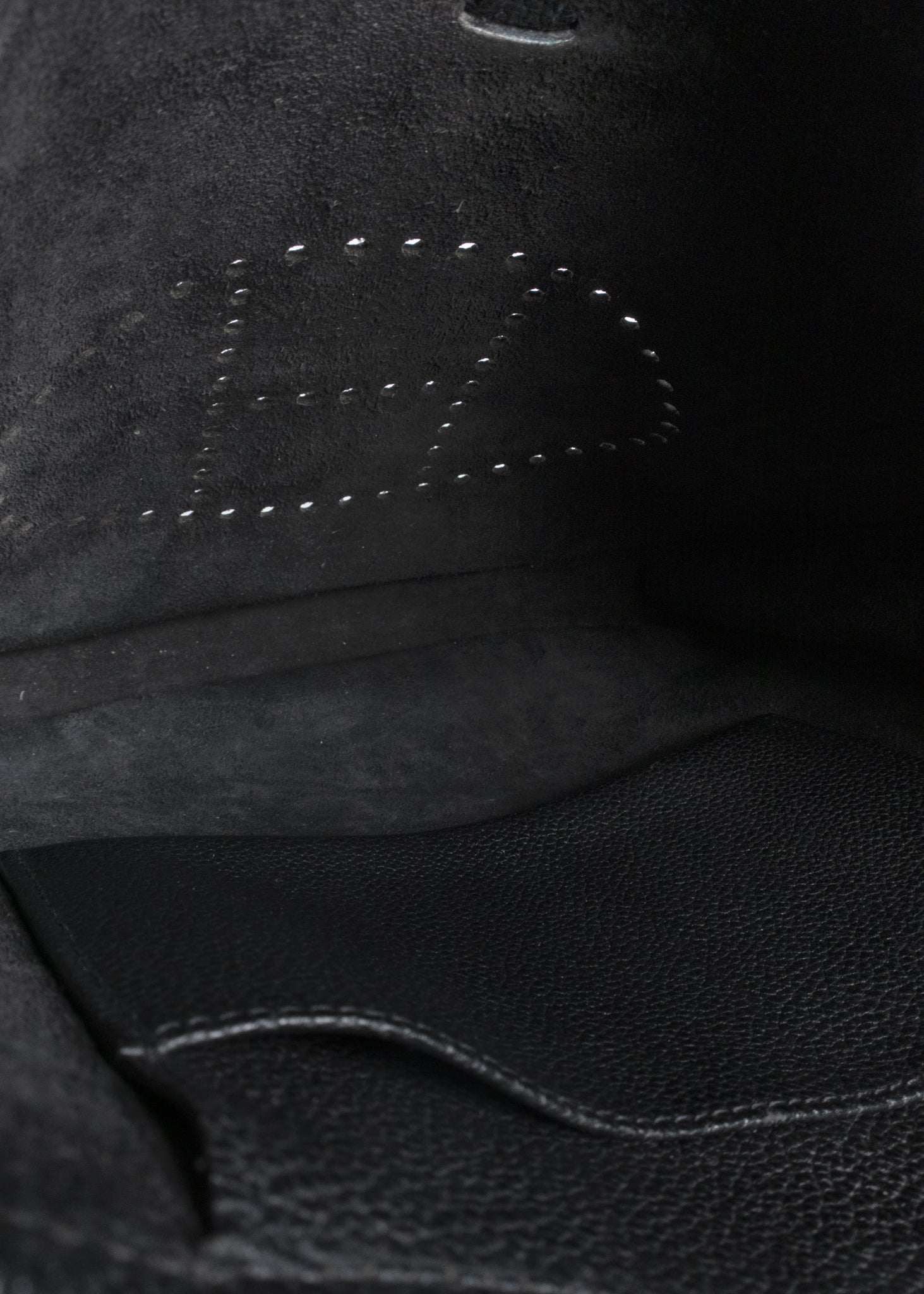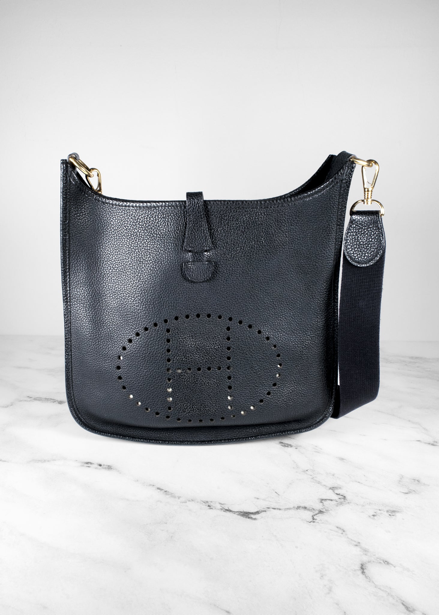 The Hermès Evelyne PM shoulder bag features a sophisticated and understated design, crafted from durable black leather. The bag is distinguished by the iconic perforated "H" logo on the front, a hallmark of the brand’s timeless elegance. This classic piece also includes a functional, adjustable shoulder strap made from fabric, offering both style and comfort. Ideal for everyday use, the bag is both spacious and practical, with an open top that provides easy access to your essentials.