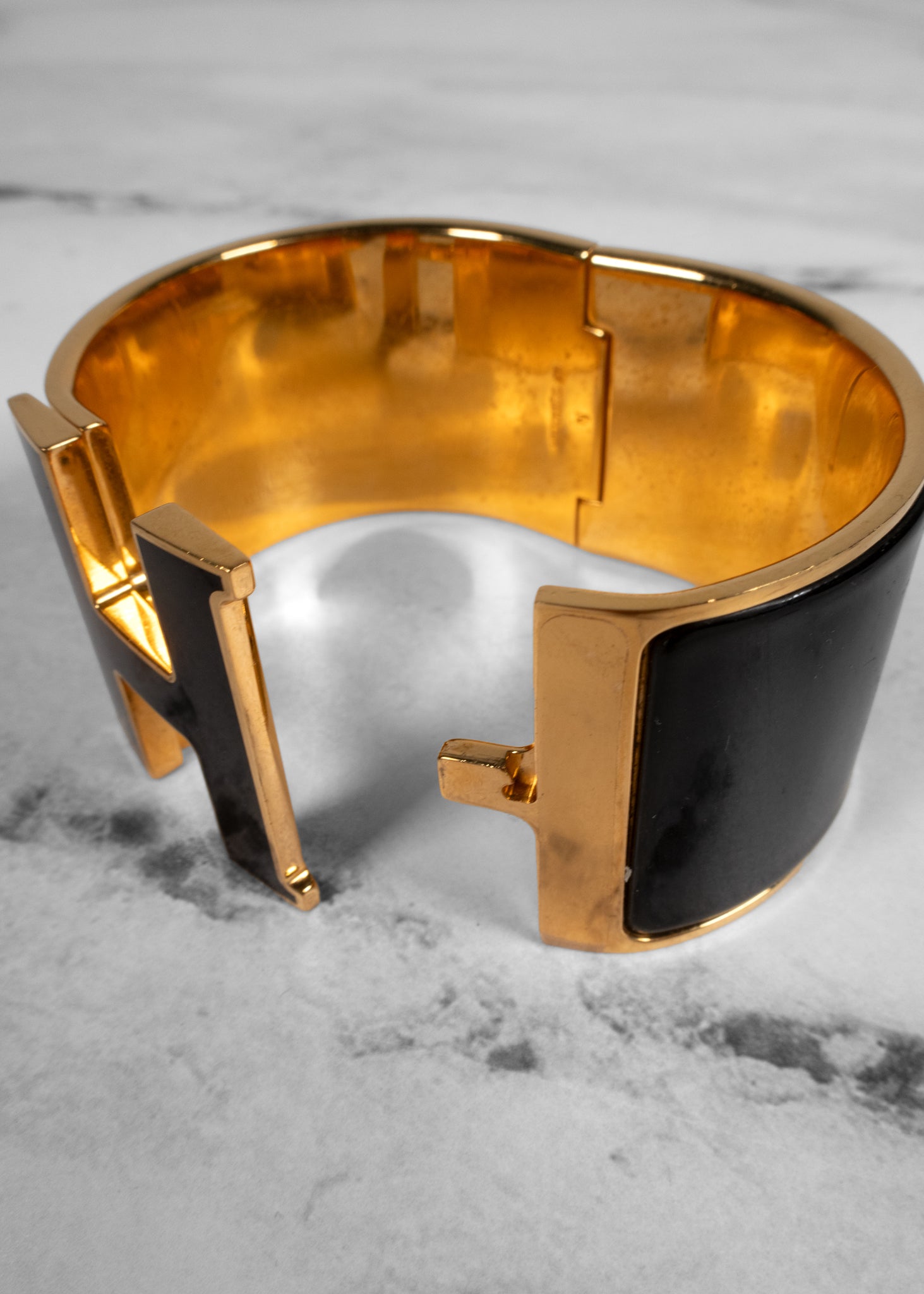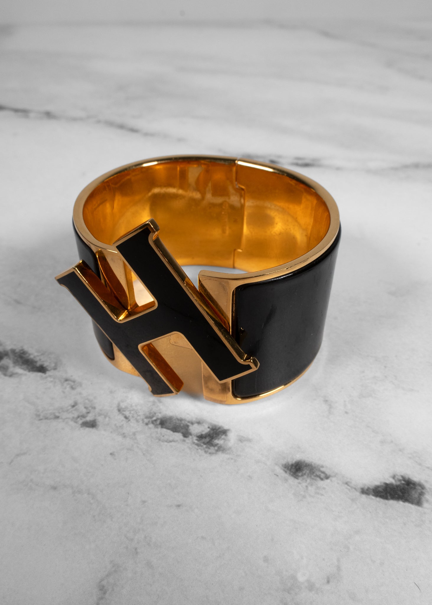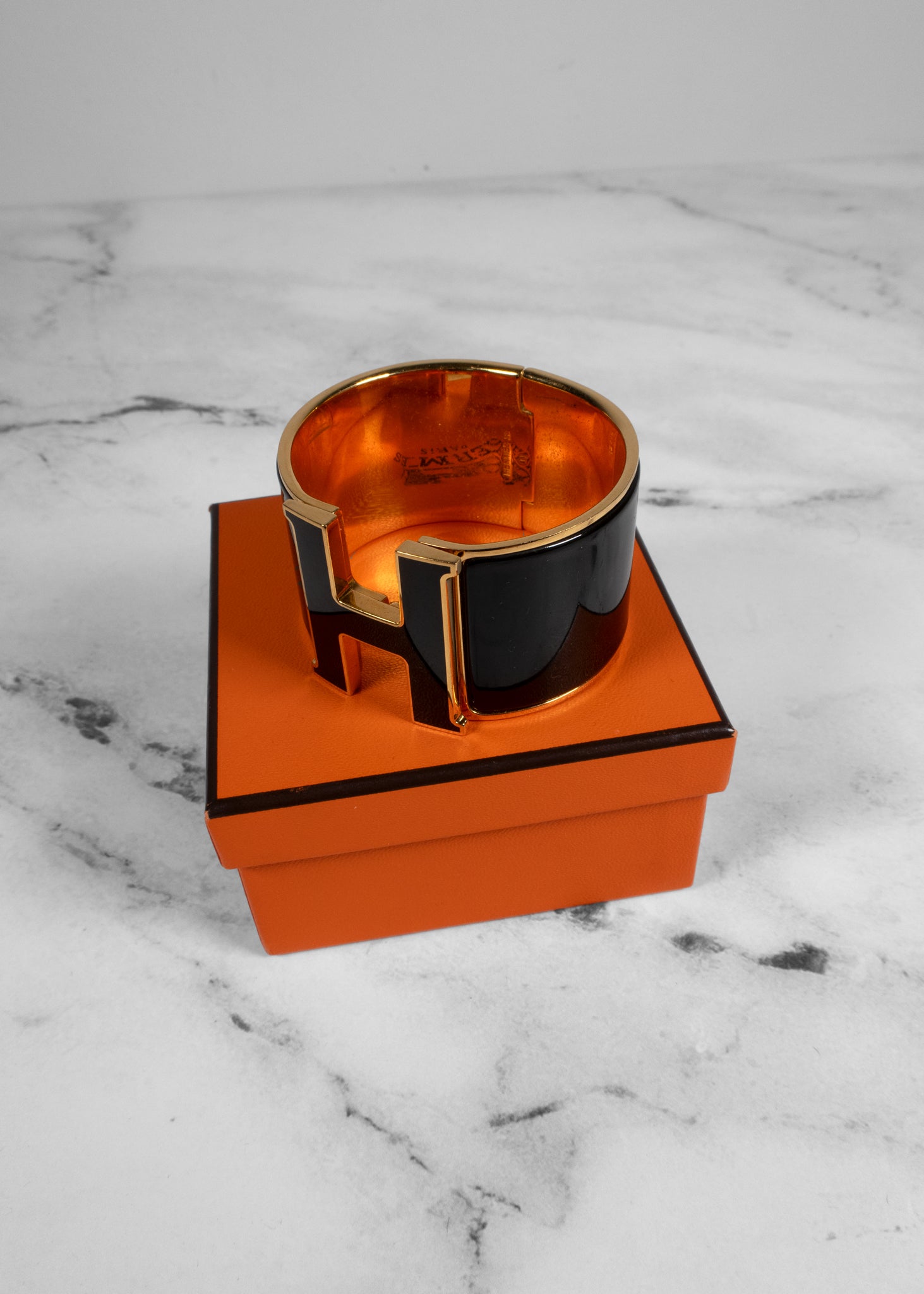 The Hermès Enamel Extra Wide Clic Clac H Bracelet is an iconic statement piece that combines bold elegance with signature branding. Featuring sleek black enamel and a gold-plated finish, this wide cuff is anchored by the instantly recognizable “H” clasp at the front. Its hinged design ensures a secure fit while offering effortless sophistication for both day and evening wear. Presented in the classic Hermès orange box, this bracelet is a timeless accessory that adds polished luxury to any ensemble.