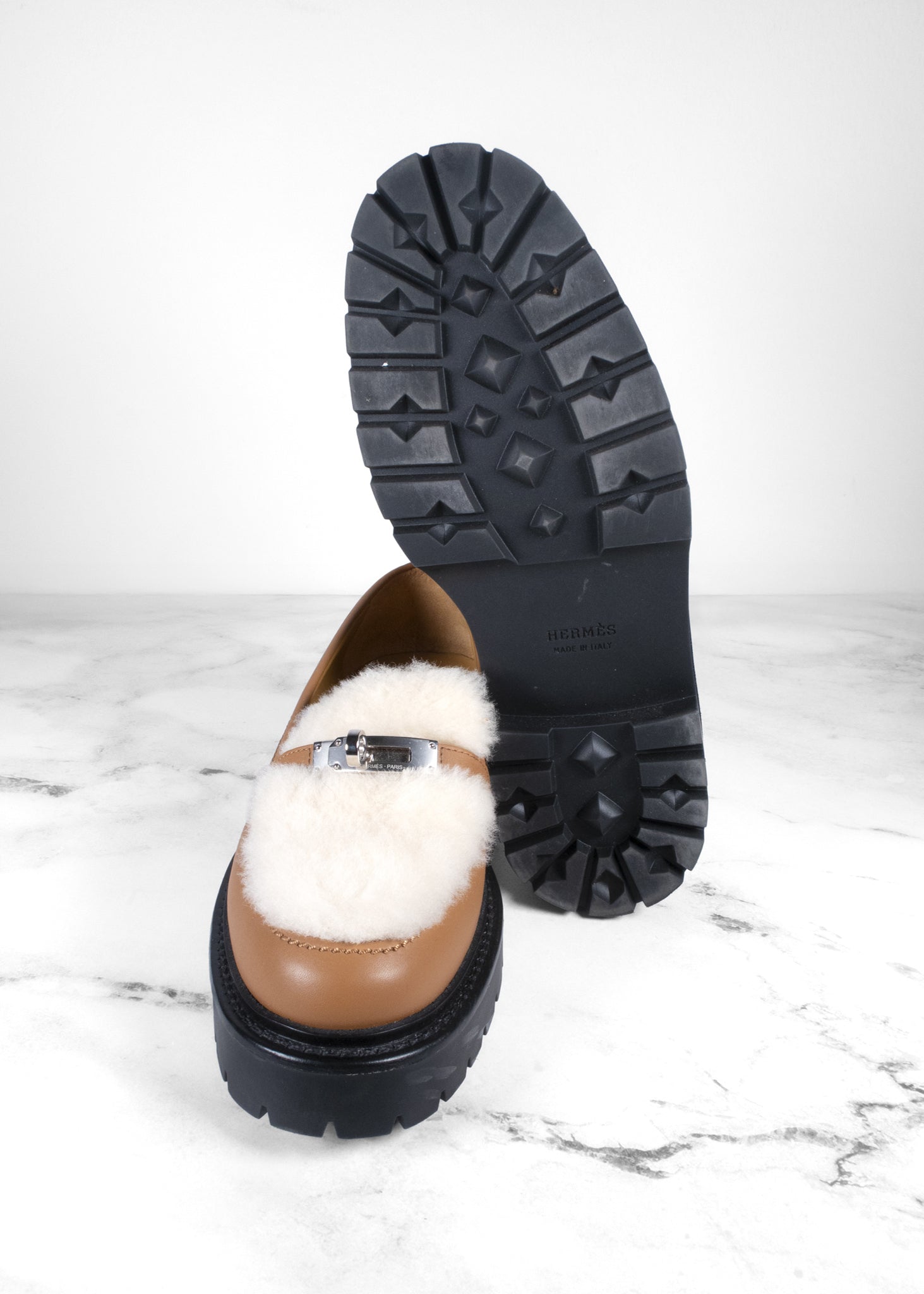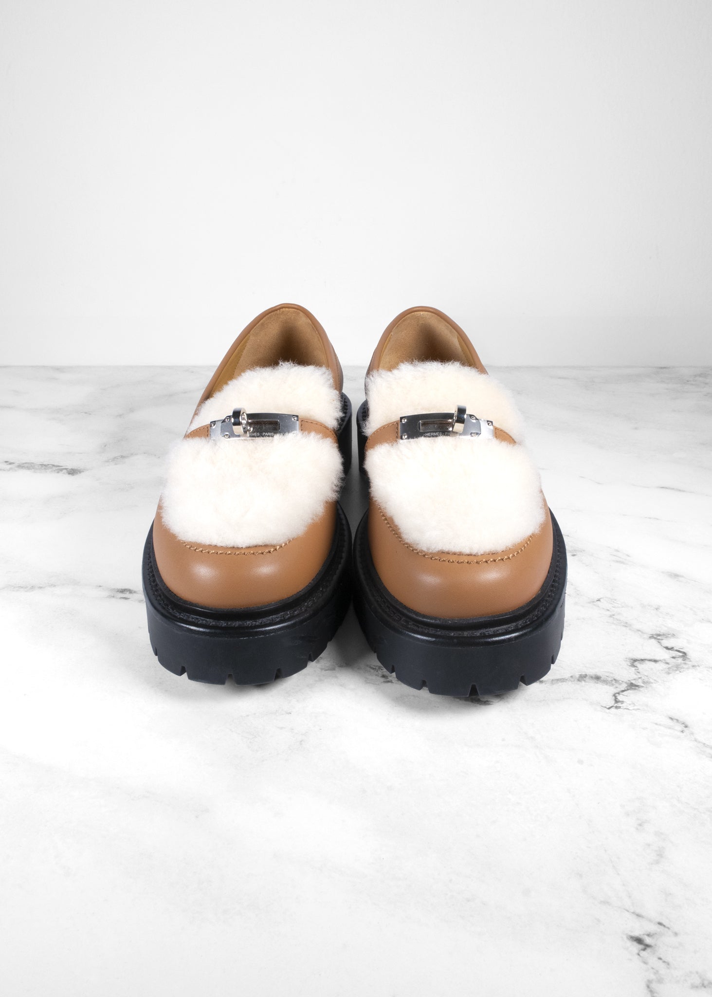 The Hermès Icone Loafer combines classic sophistication with a modern edge, designed for both comfort and style. Crafted from luxurious leather in a warm tan shade, this loafer is adorned with a distinctive silver-tone buckle across the front, adding a touch of refinement. The plush shearling lining offers warmth and coziness, making it an ideal choice for cooler months, while the chunky black rubber sole provides stability and a bold contrast. Whether paired with casual or slightly more formal outfits, these loafers are perfect for elevating any ensemble with their blend of high-end craftsmanship and contemporary flair.